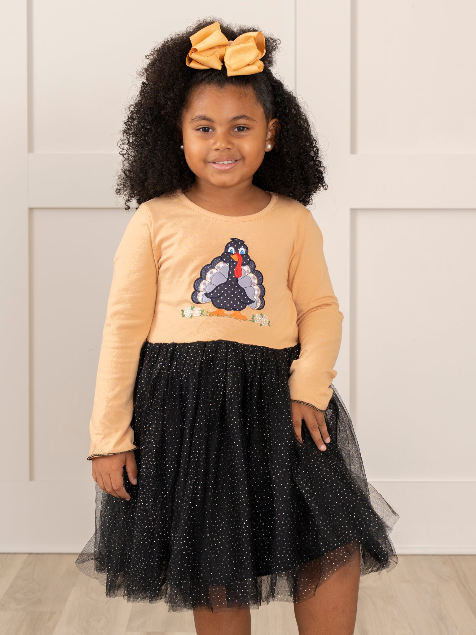Tan & Black Sparkle Embroidered Turkey Tulle Dress