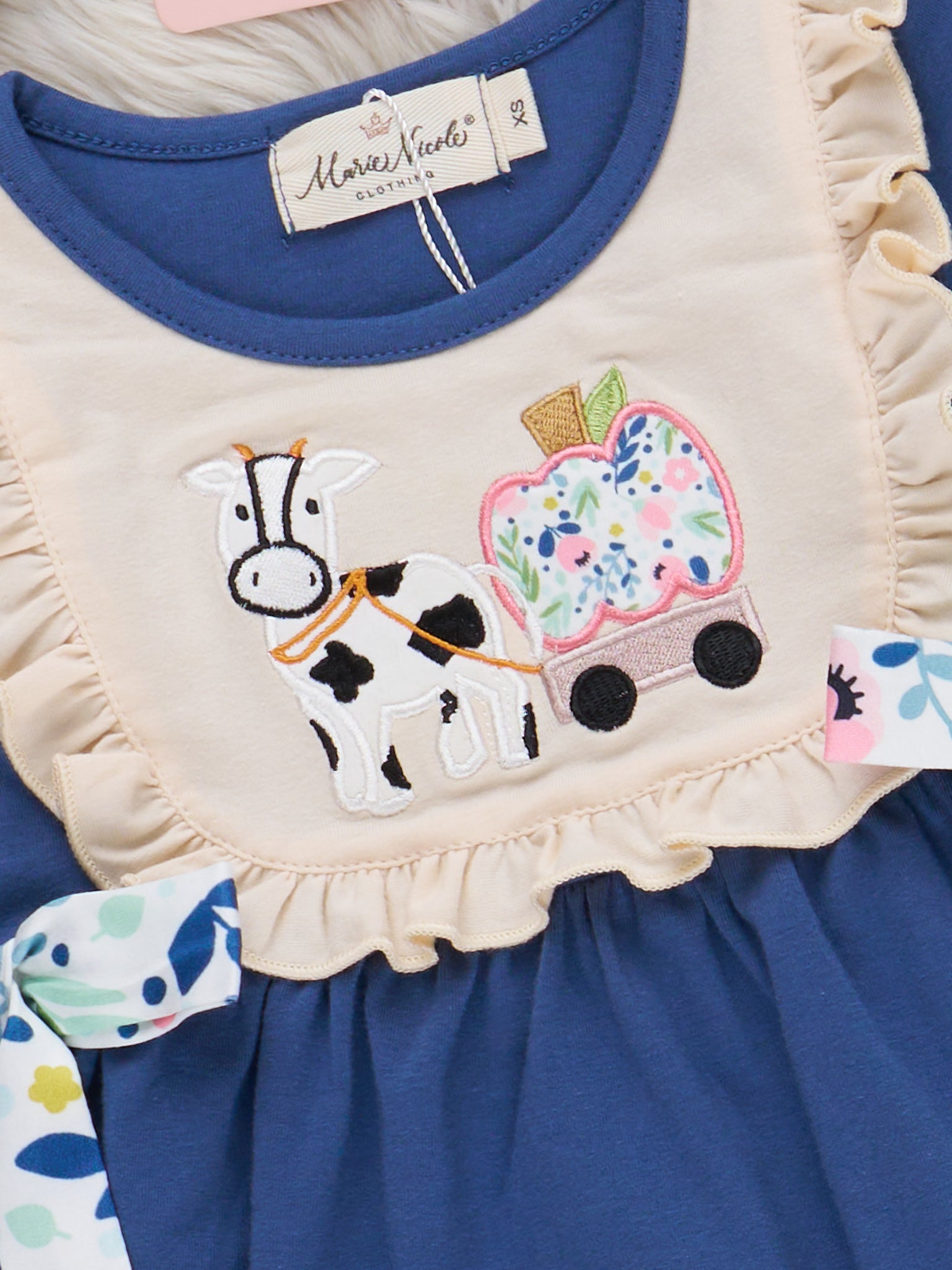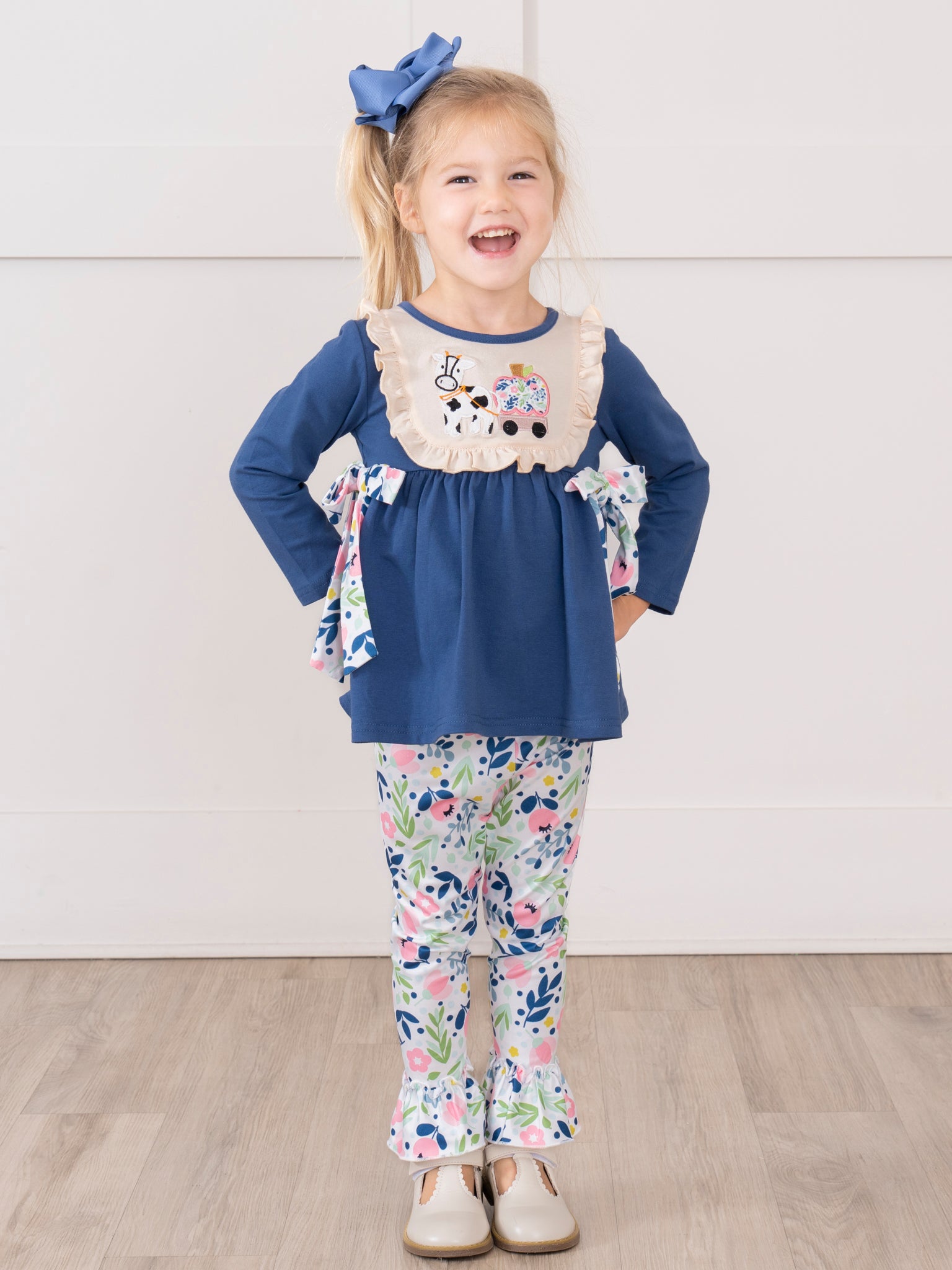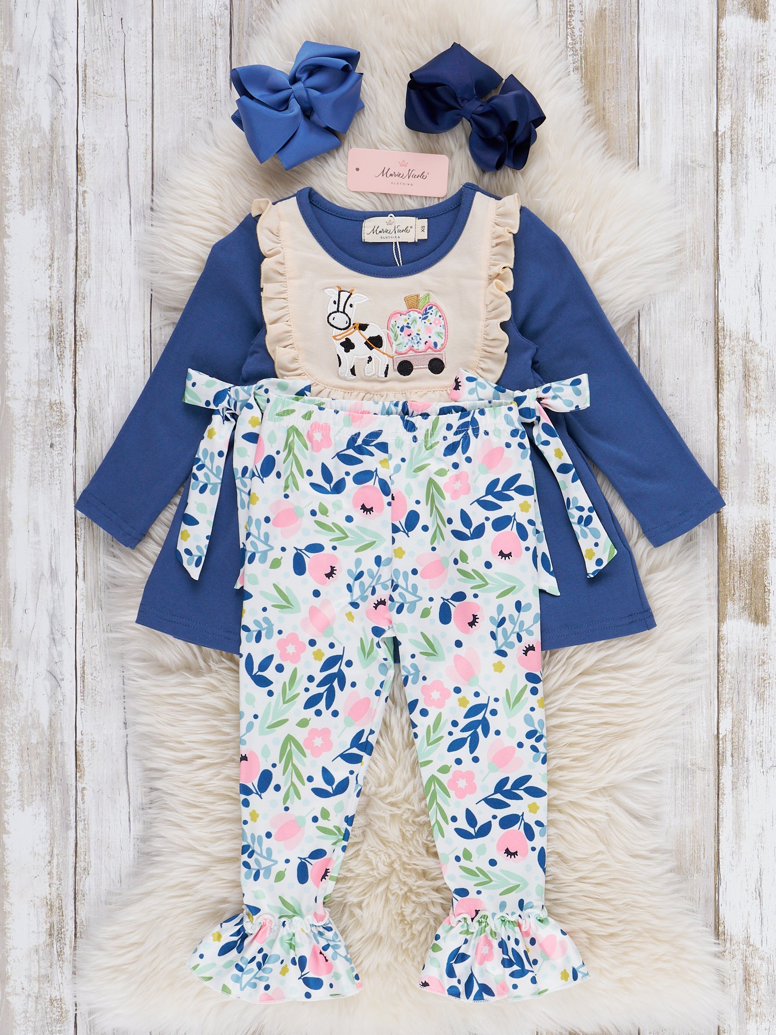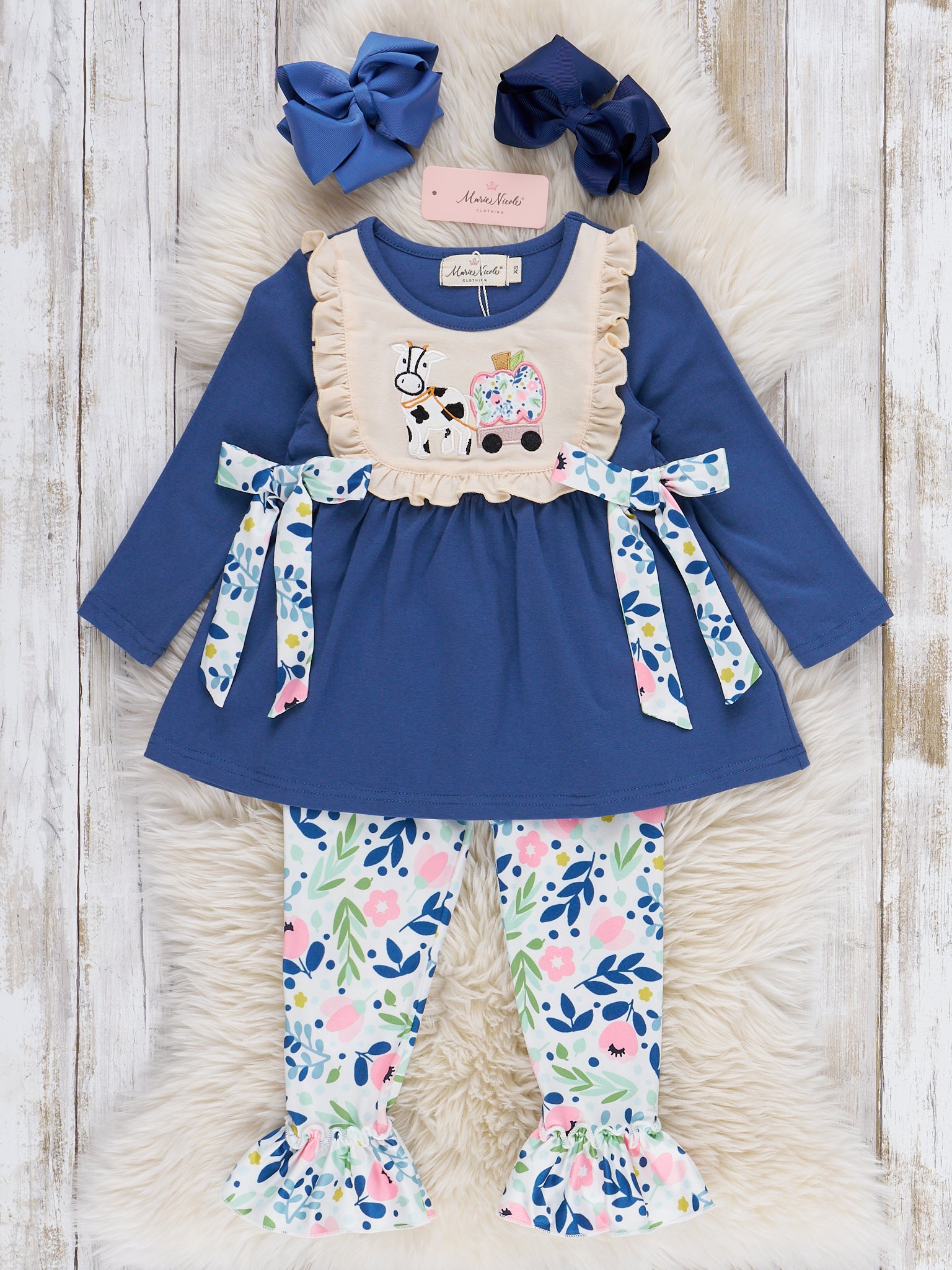 The Farm Friends Pumpkin Ride Embroidered Ruffle Outfit by Marie Nicole Clothing features a top with embroidered farm animal and pumpkin motifs, lace-trimmed bodice, and playful patterned side ties, paired with coordinating patterned pants. This set brings whimsical fall charm and comfort, making it perfect for seasonal outings, farm visits, and capturing cheerful autumn memories.