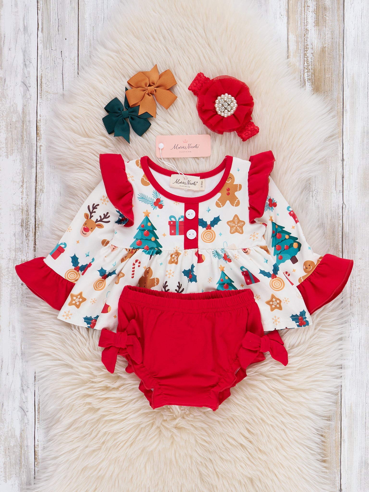 The Holiday Delights Bow Bloomers Outfit by Marie Nicole Clothing is a charming set with a festive long-sleeve top featuring gingerbread, trees, stars, and presents, finished with bright ruffle accents and playful buttons. Paired with solid bloomers with side bows, this outfit is made for cozy celebrations and capturing holiday photo memories.