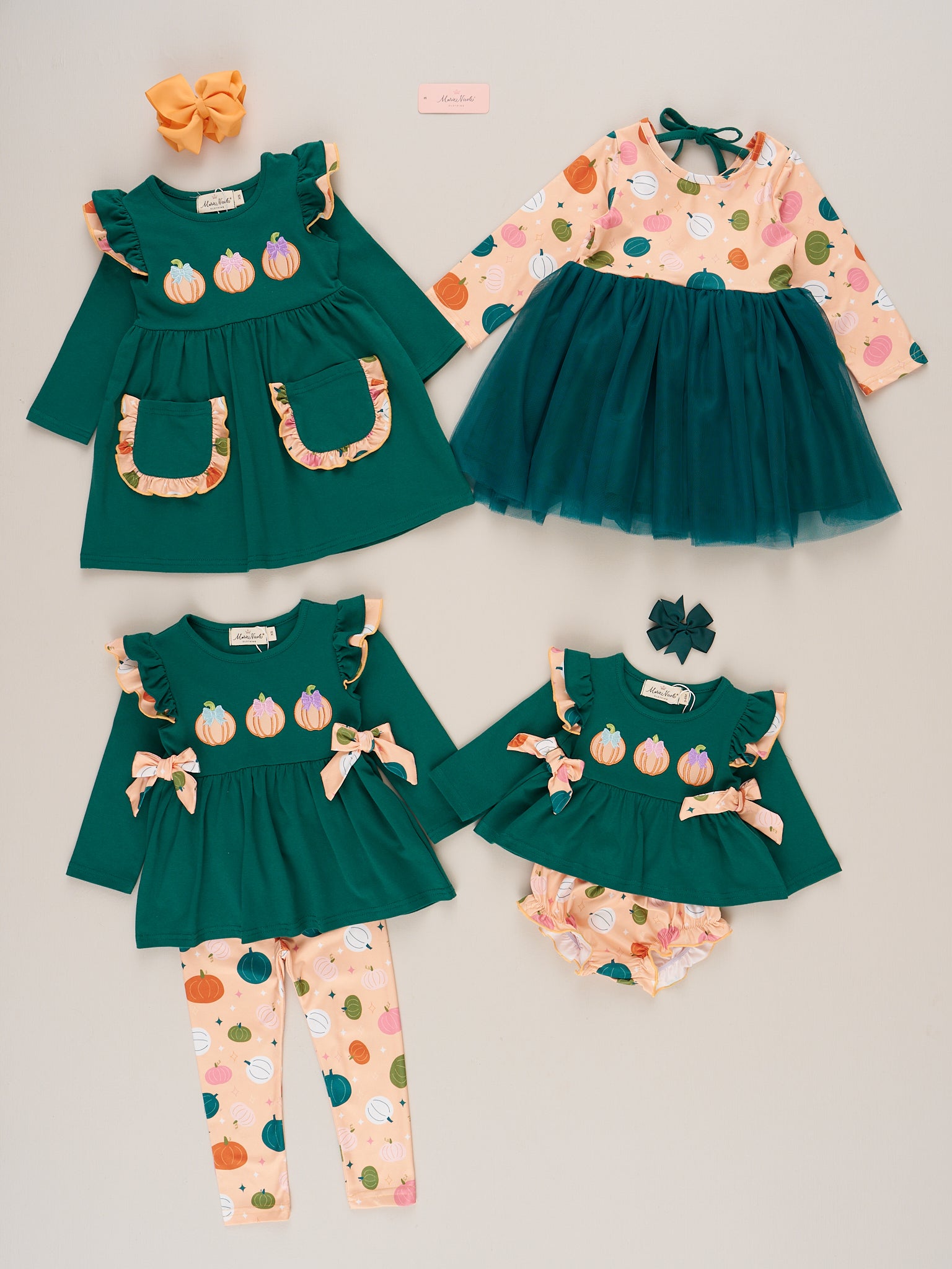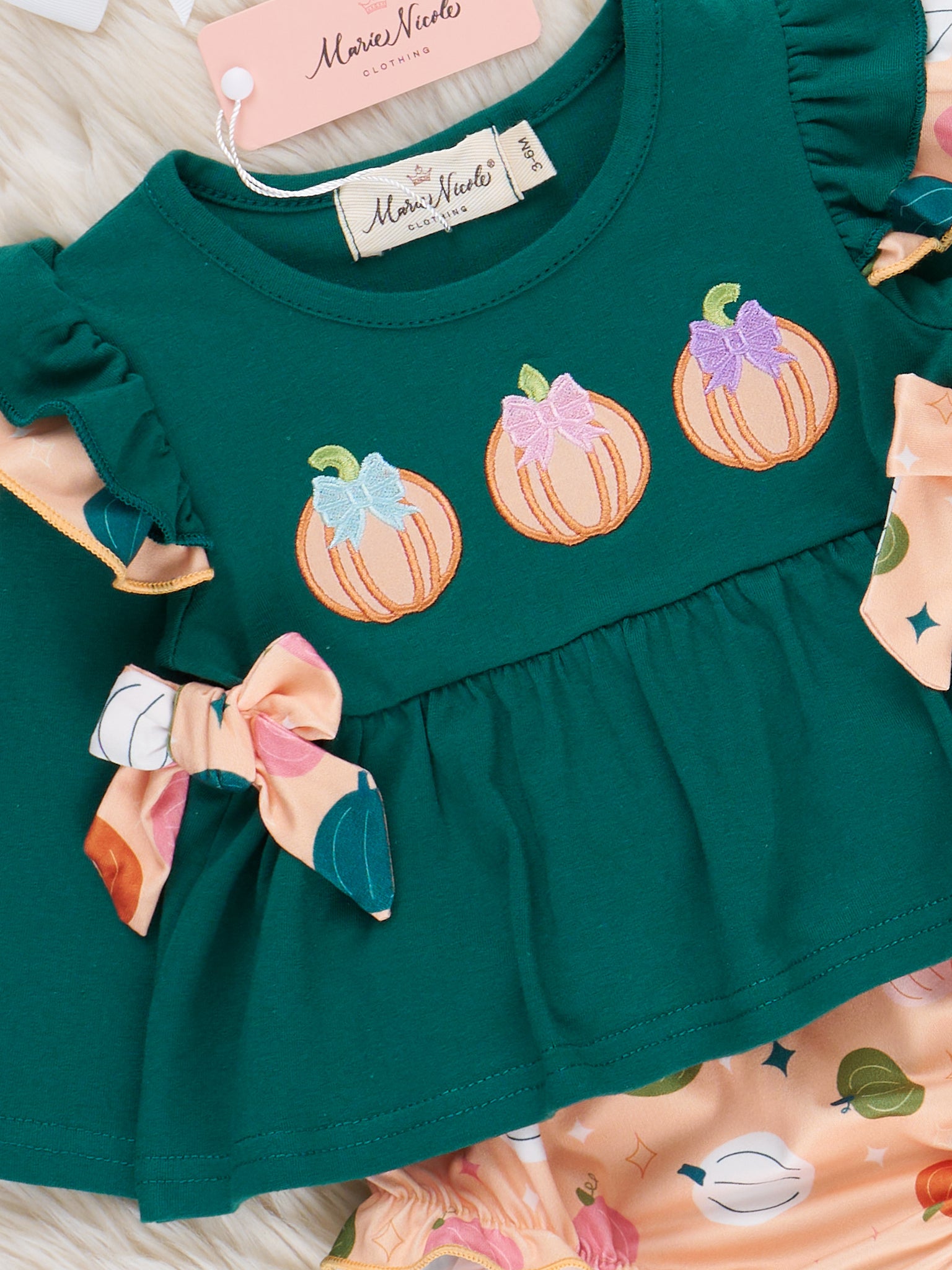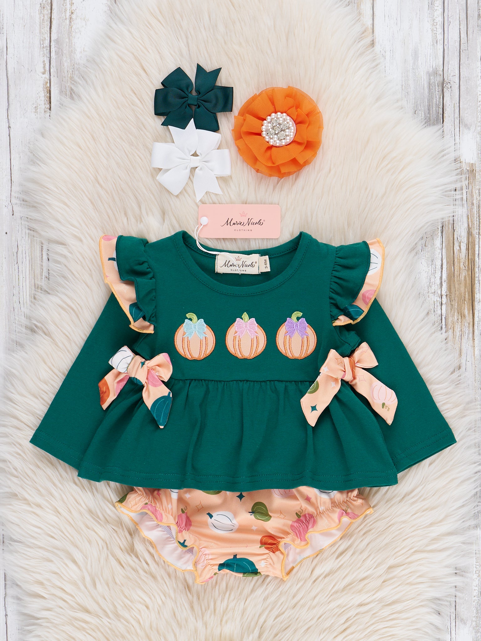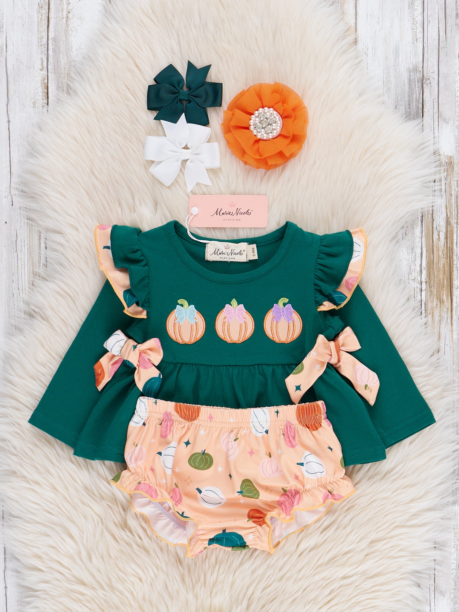 Pick out the perfect pumpkins with the Pick of the Patch Ruffle Bloomers Outfit! Along with pleasant bows, ruffles, and pumpkin patterns, this two-piece set from Marie Nicole Clothing is delicately embroidered with cute pumpkins and designed with comfortable fabric. Your child will stay fun and festive in this outfit for all fall occasions!
