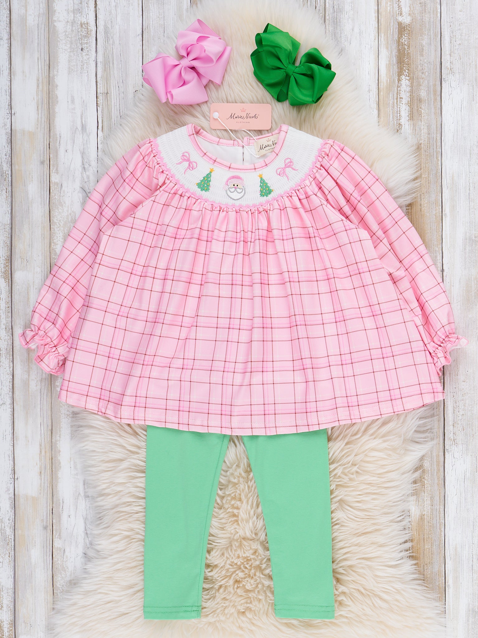 The Plaid Christmas Delight Smocked Outfit by Marie Nicole Clothing features a sweet plaid tunic with delicate smocking and an embroidered collar, paired with soft leggings for all-day comfort. This set brings together timeless plaid charm and playful embroidered details, making it perfect for cheerful occasions and everyday style.