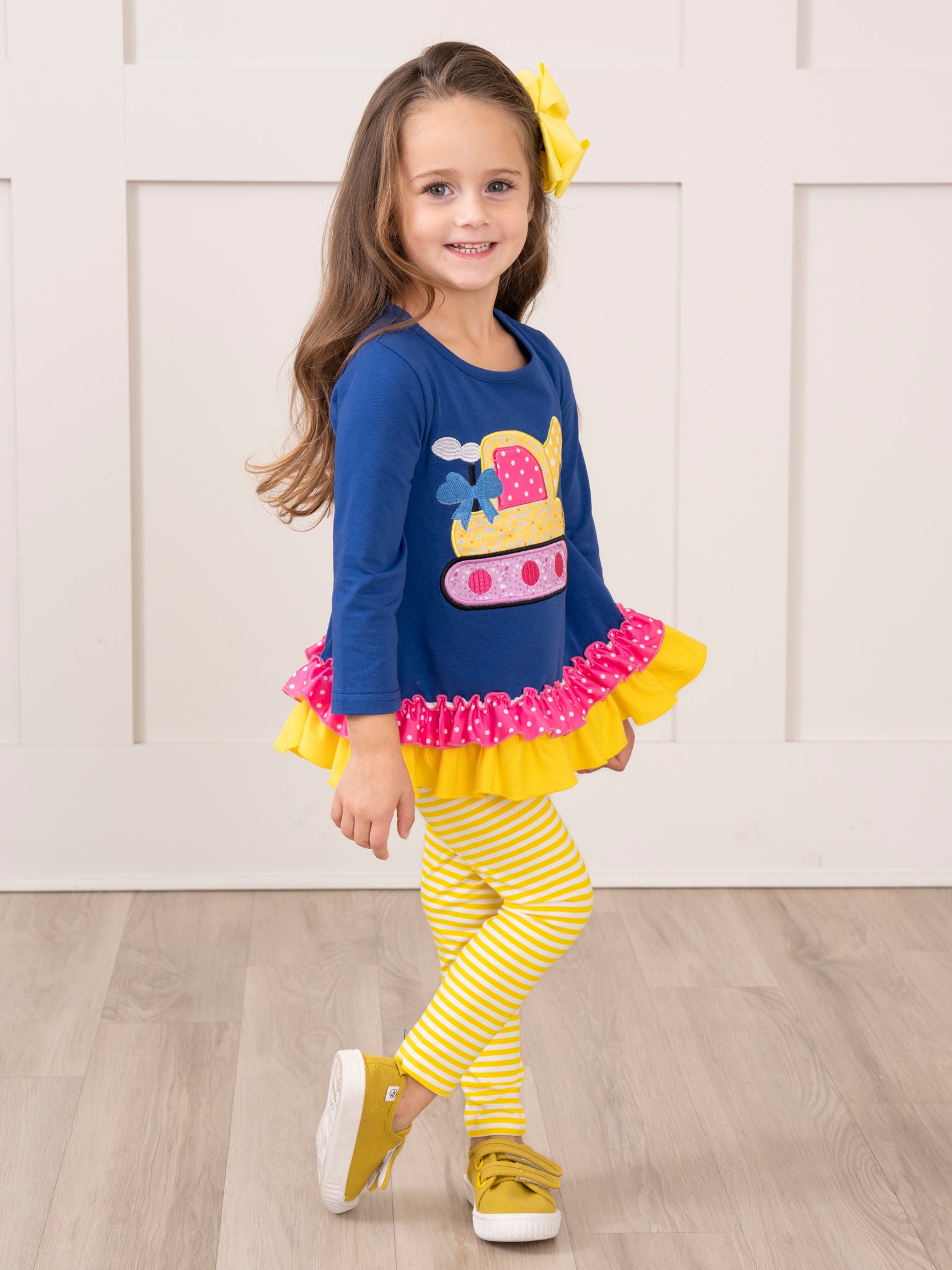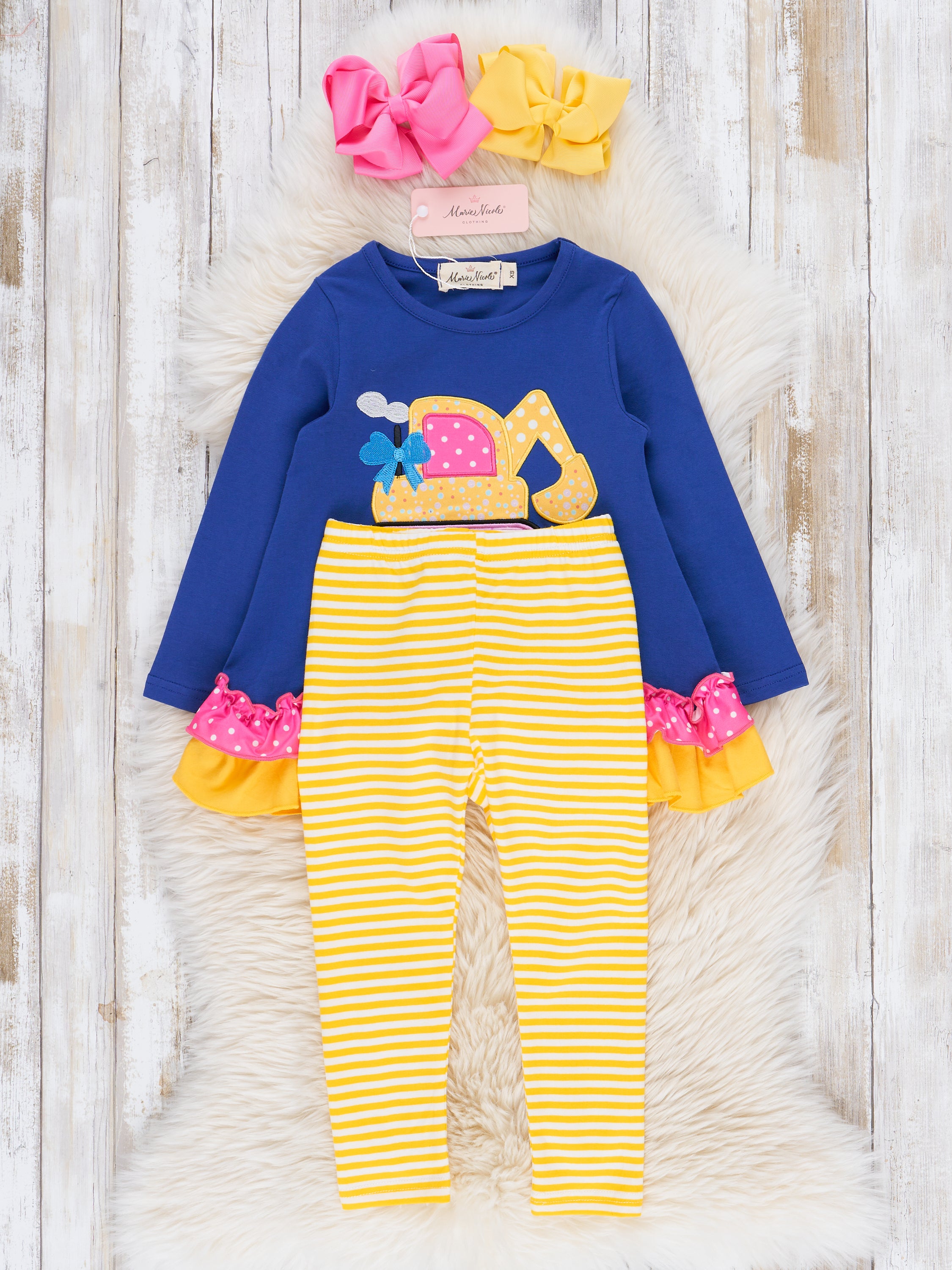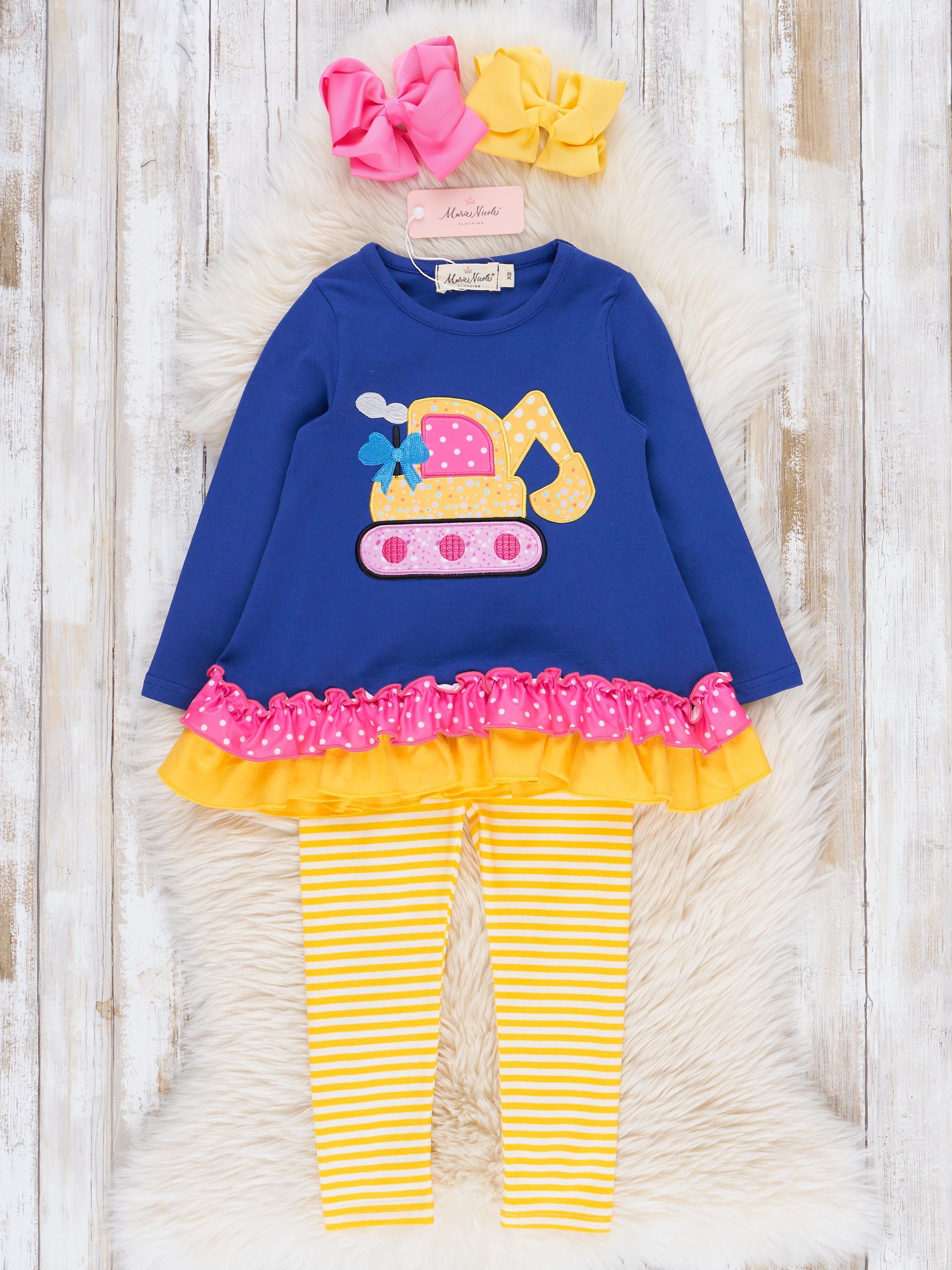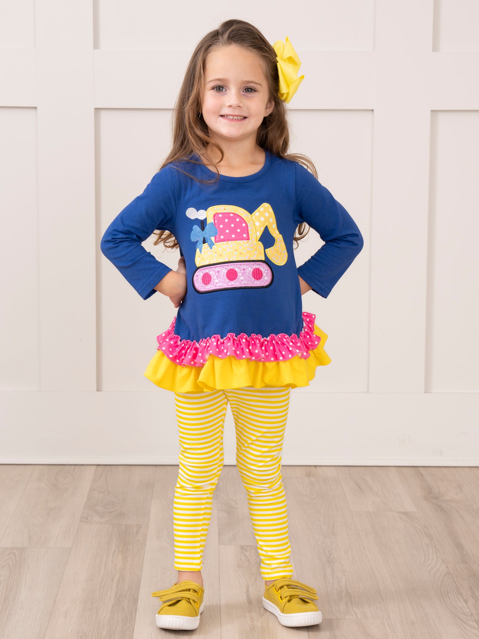 Get ready to dig in style with this sibling set. Perfect for fall, this girls outfit features a blue top with an embroidered excavator design and a playful ruffle hem. The yellow striped leggings add a pop of color and comfort. Let's get to work (and play)!