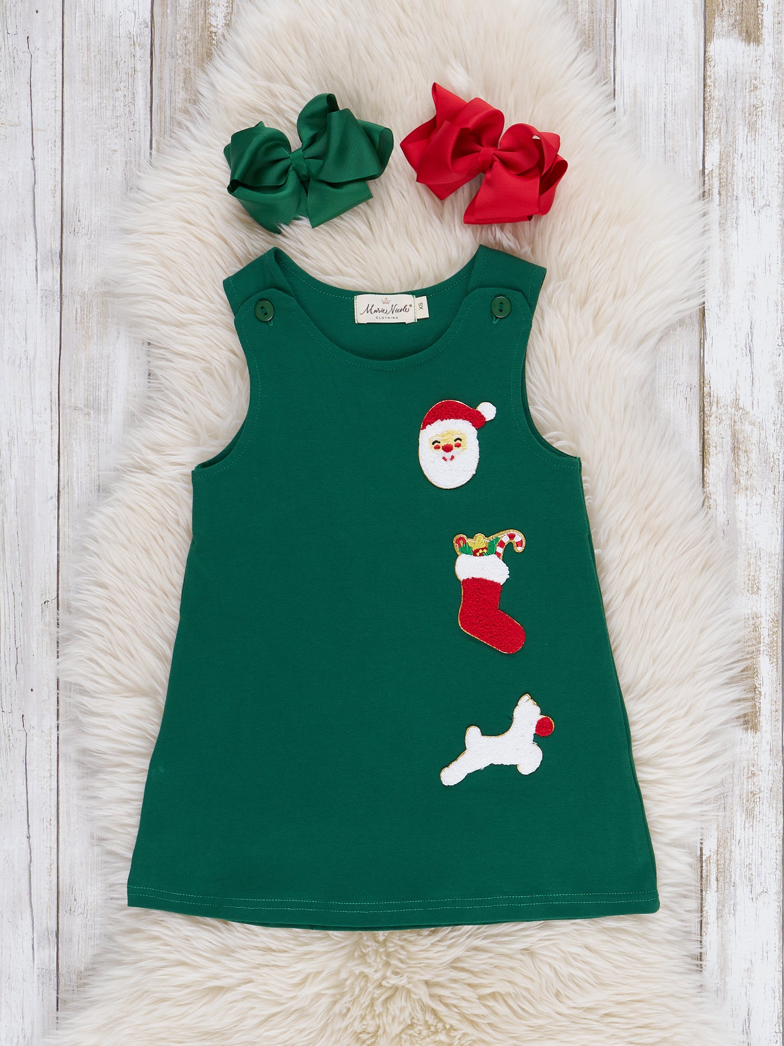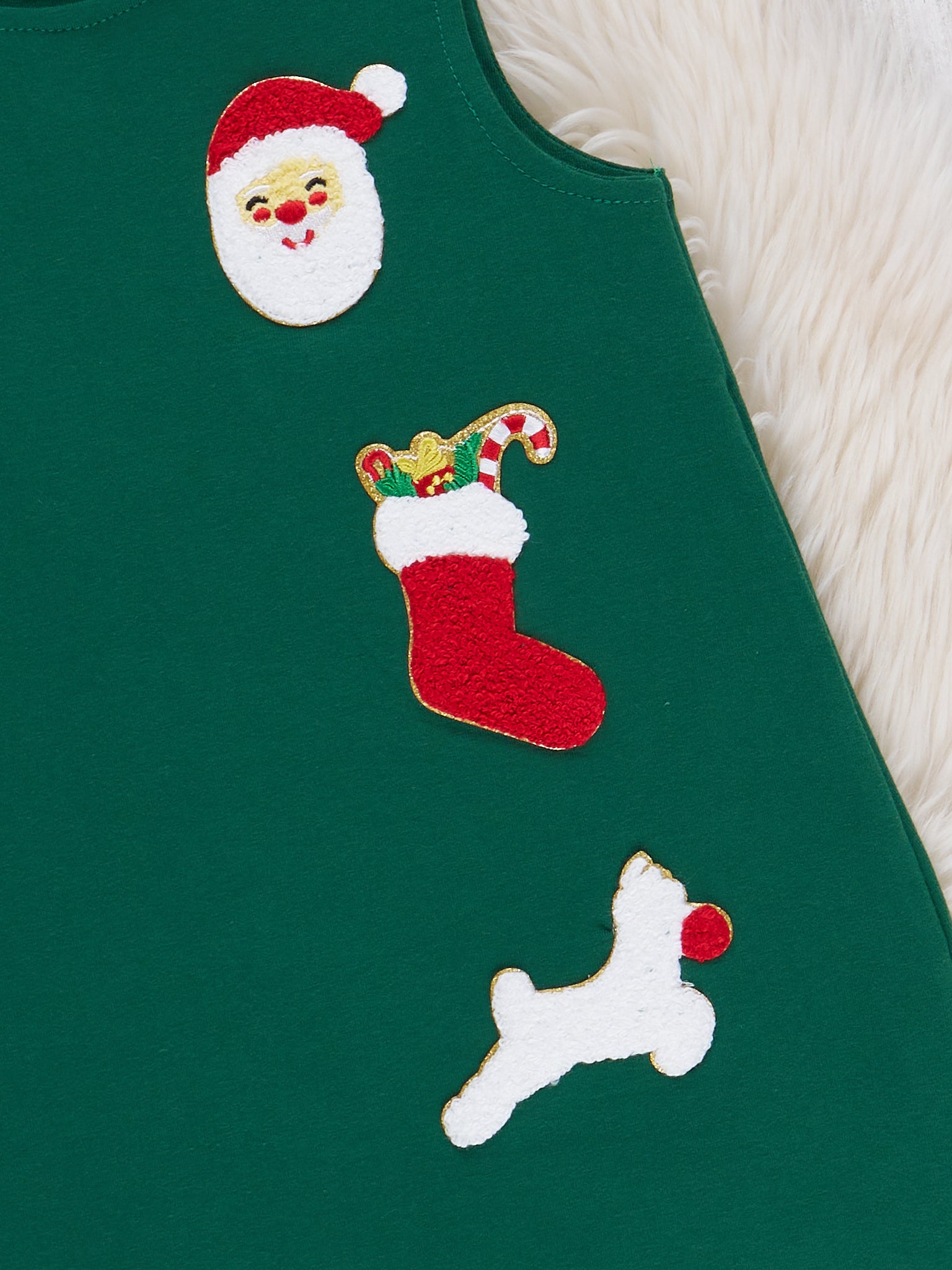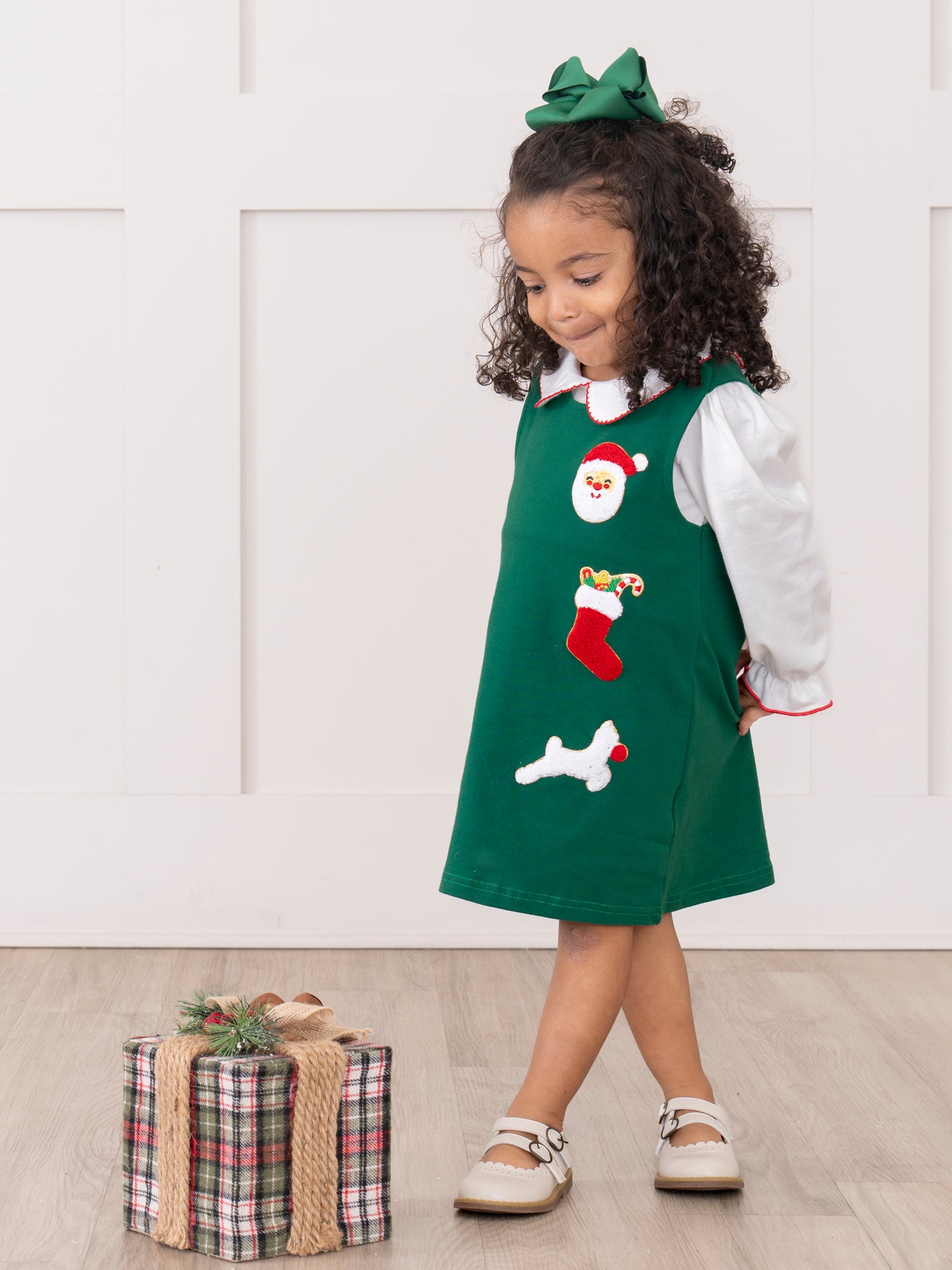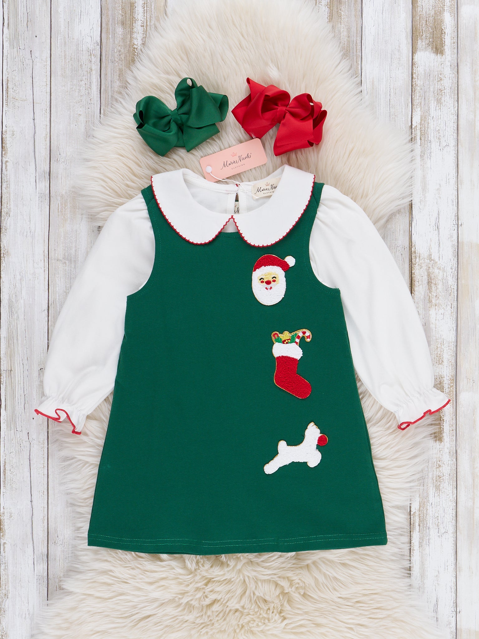 The Stockings & Paws Christmas Ruffle Outfit by Marie Nicole Clothing is a festive charmer, featuring a layered look with a crisp collared top and an attached green jumper adorned with holiday appliques of Santa, a stocking, and a playful bone. Designed with sweet details and a classic holiday style, this outfit is perfect for Christmas gatherings, family photos, and creating warm seasonal memories.