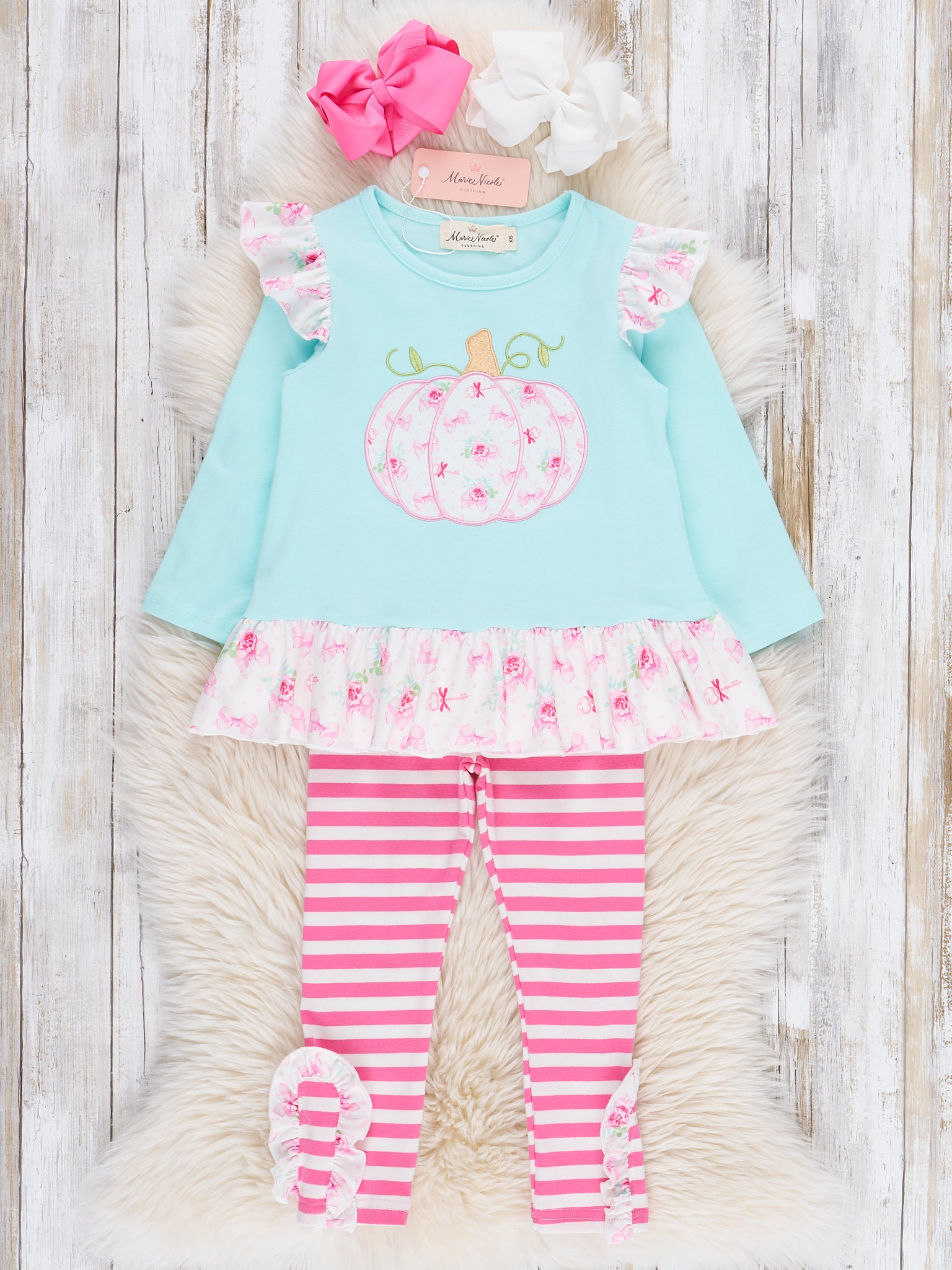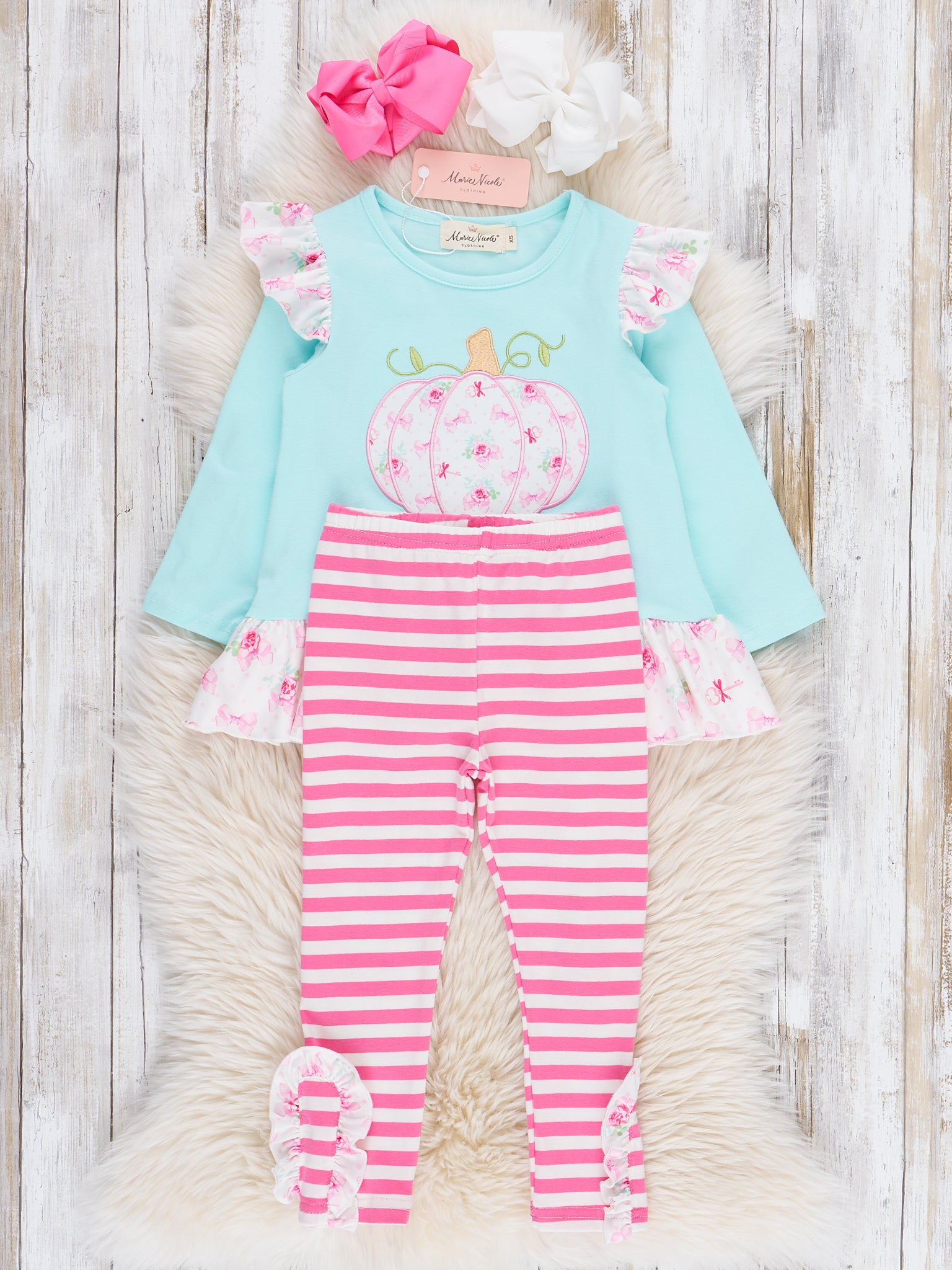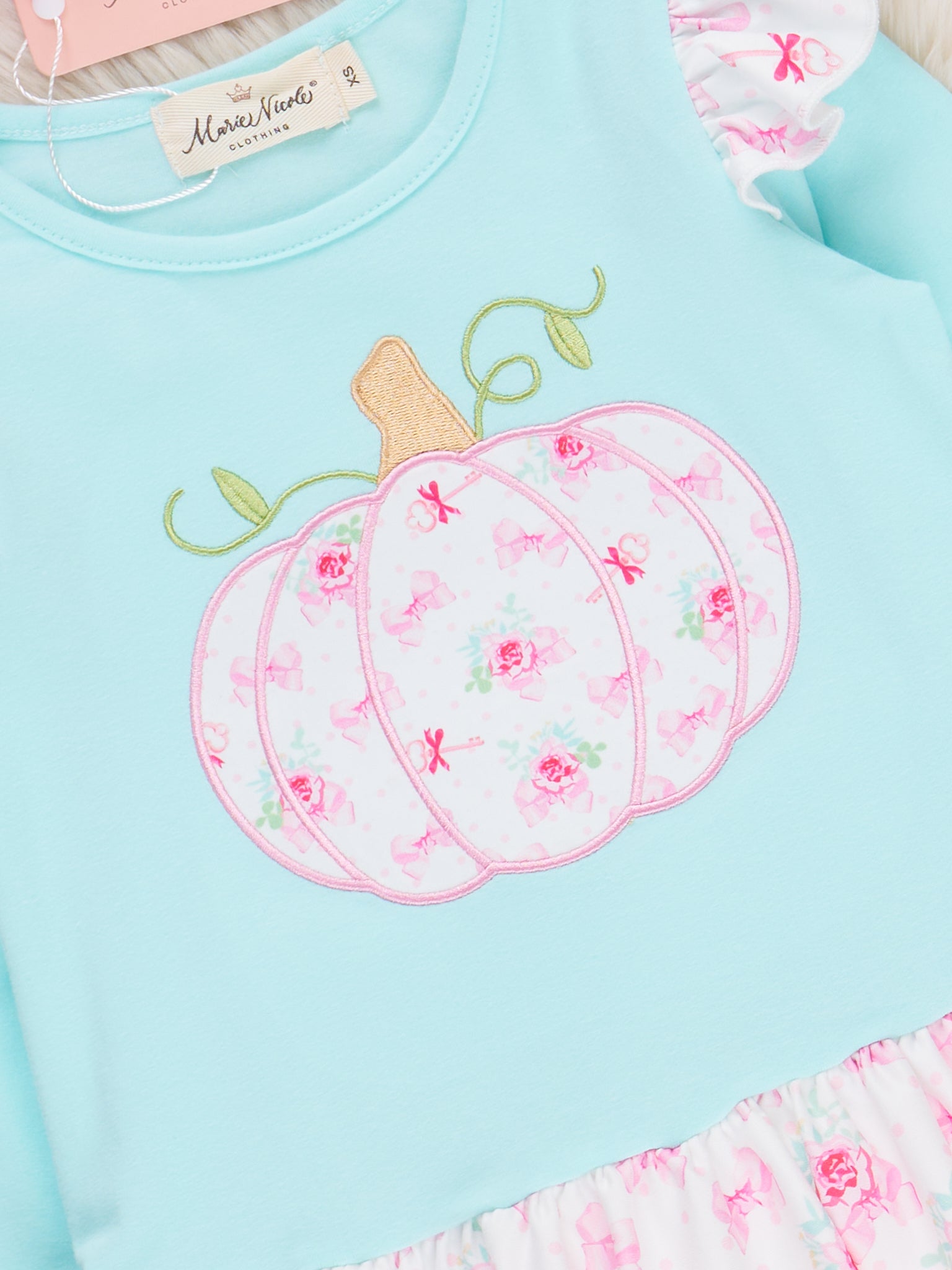 The Blushin’ in the Patch Embroidered Ruffle Outfit is made for fun, the kind that makes your child blush in joy. This set from Marie Nicole Clothing features exuberant ruffles, stripes, and florals as well as vibrant pumpkin embroidery. Designed with long sleeves, full-length pants, and stretchy, comfortable material, your child can play to their heart's content, whether running at the playground, posing for photos, or exploring the pumpkin patch.