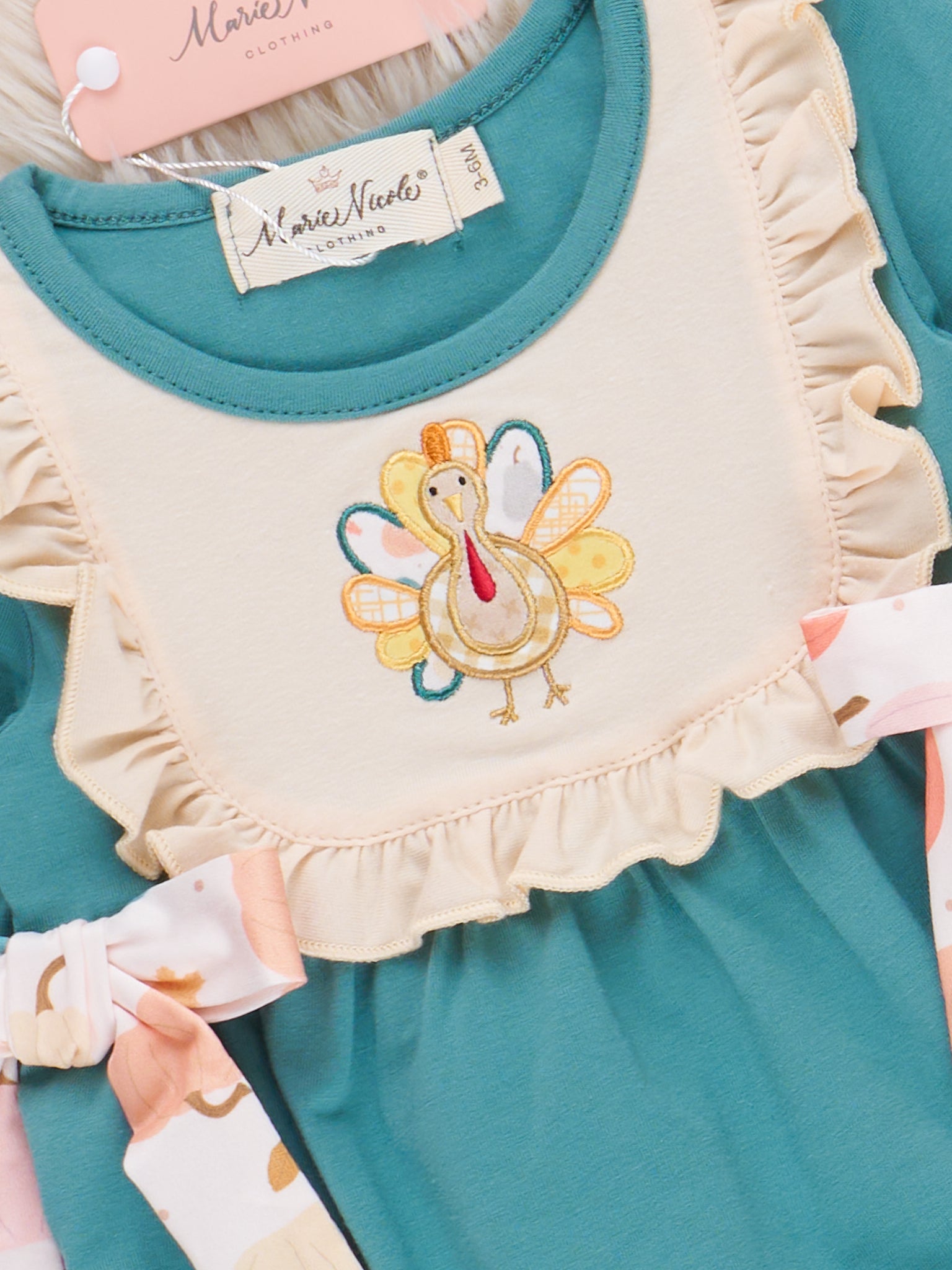 The Gobble Giggles Bow Ruffle Bubble Romper by Marie Nicole Clothing features a teal long-sleeve bubble silhouette with a pumpkin applique on a ruffle-trimmed yoke and decorative bow accents at the waist. This adorable one-piece is perfect for Thanksgiving celebrations, seasonal gatherings, and capturing sweet holiday photos in playful comfort.