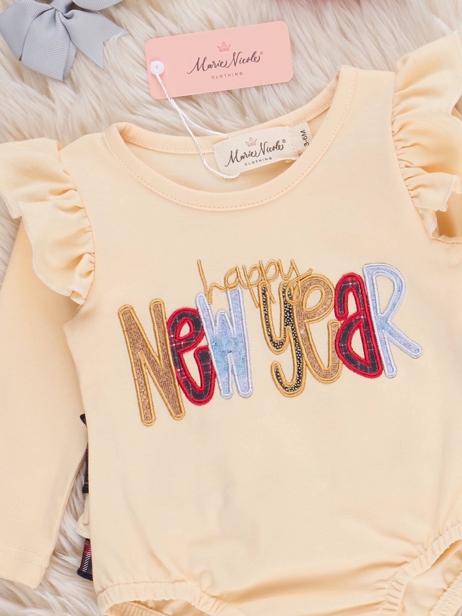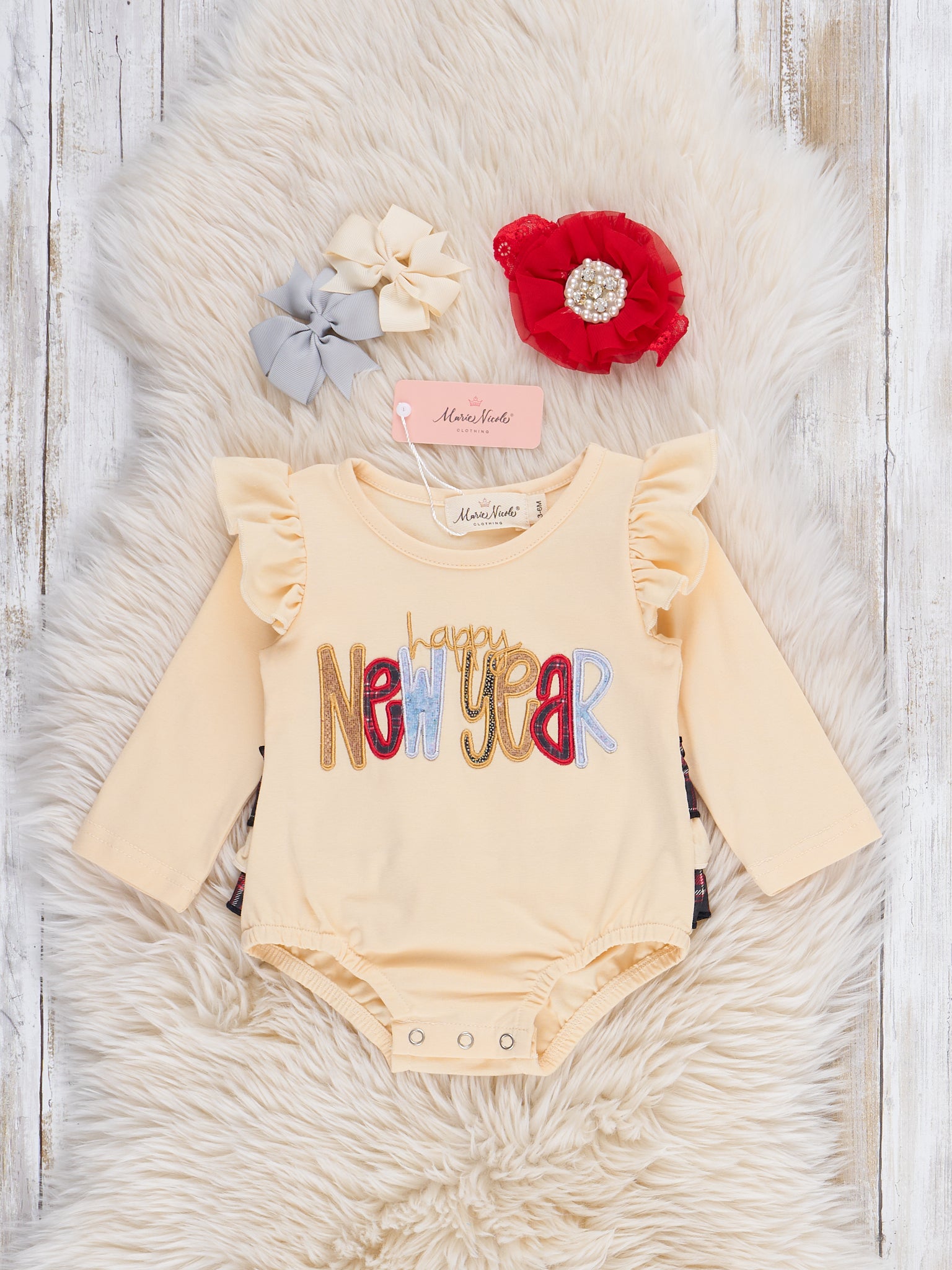 The "Happy New Year" Plaid Embroidered Ruffle Romper by Marie Nicole features a long-sleeve silhouette with playful ruffle accents on the shoulders and a cheerful "New Year" embroidery on the front. Snap closures ensure easy changes, making this festive bubble perfect for welcoming the celebrations in style