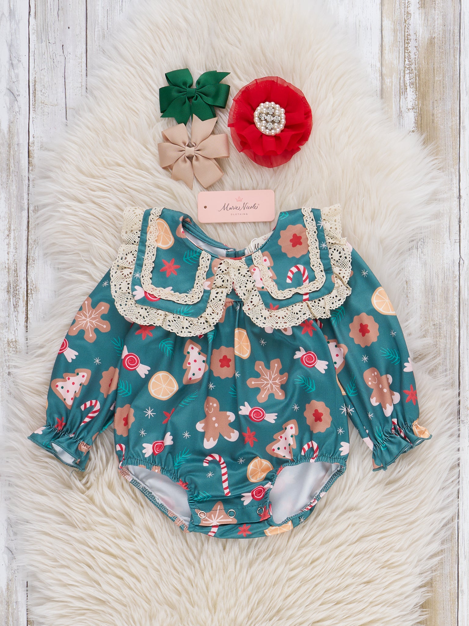 The holidays are a time of sweet dreams and sweet treats. The Holiday Sweet Dreams Lace Bubble Romper brings your little one just that! The charming, vintage collar features a lace edge, and the soft fit gives all the comfort. With cookies, gingerbreads, and candies all over, this one-piece by Marie Nicole Clothing is an adorable pick for the winter season.