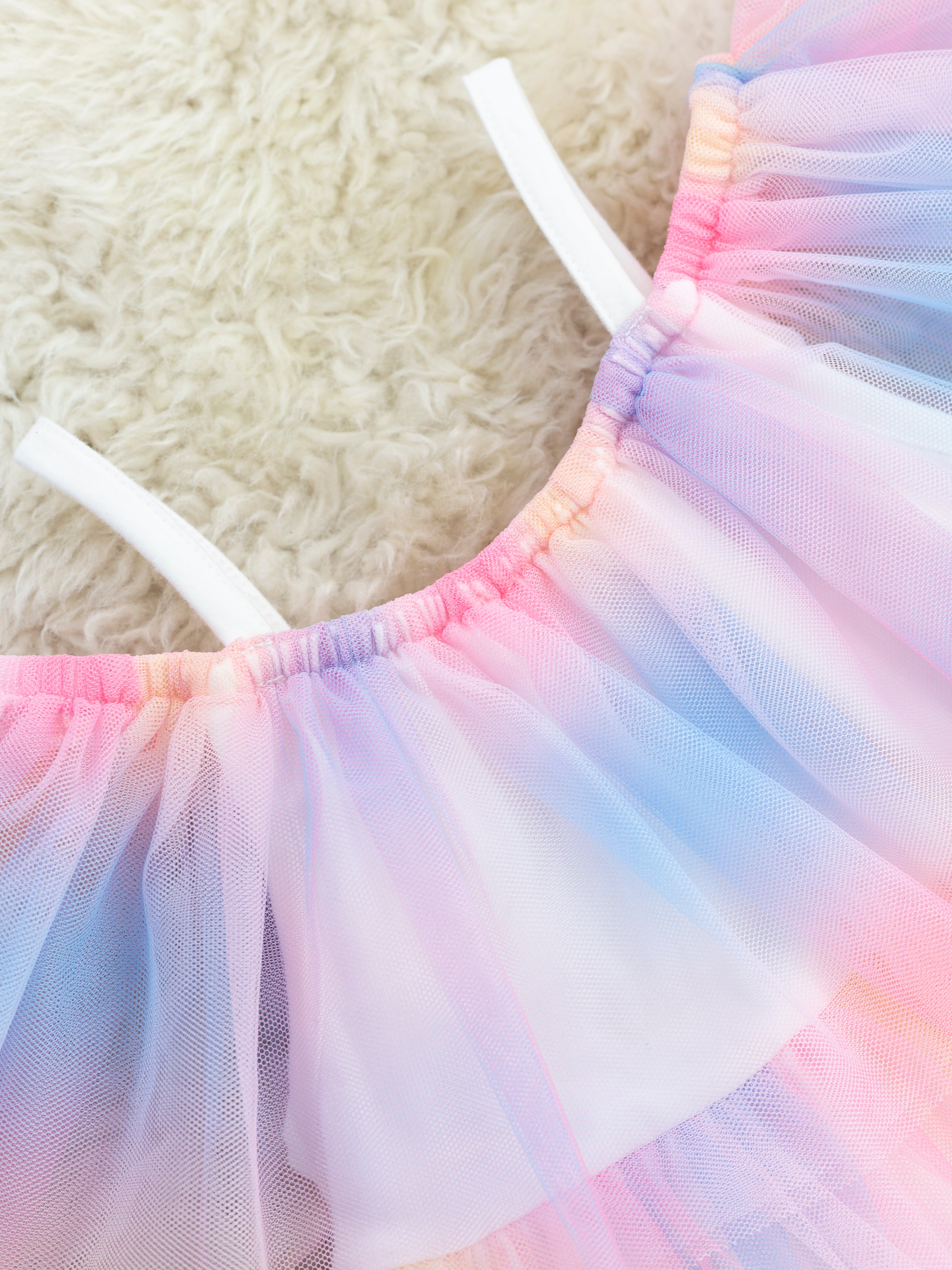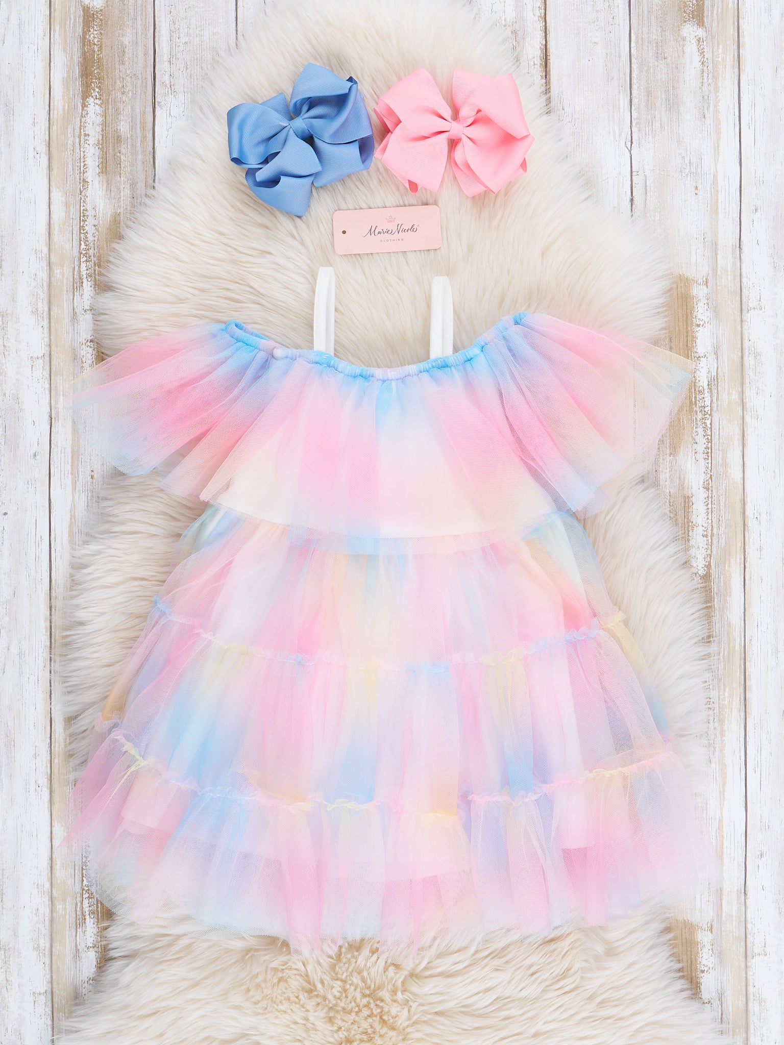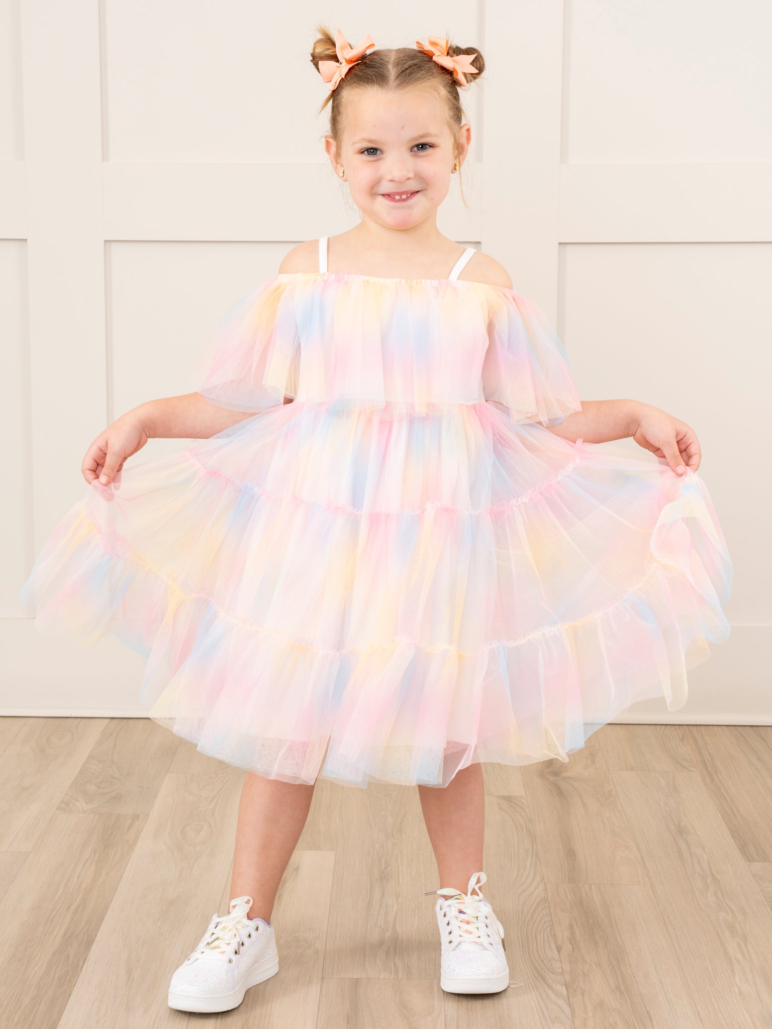 This dress is TULLE cute, we are OBSESSED! This dress features gorgeous rainbow tulle with off-the-shoulder tulle details & is perfect for twirling!