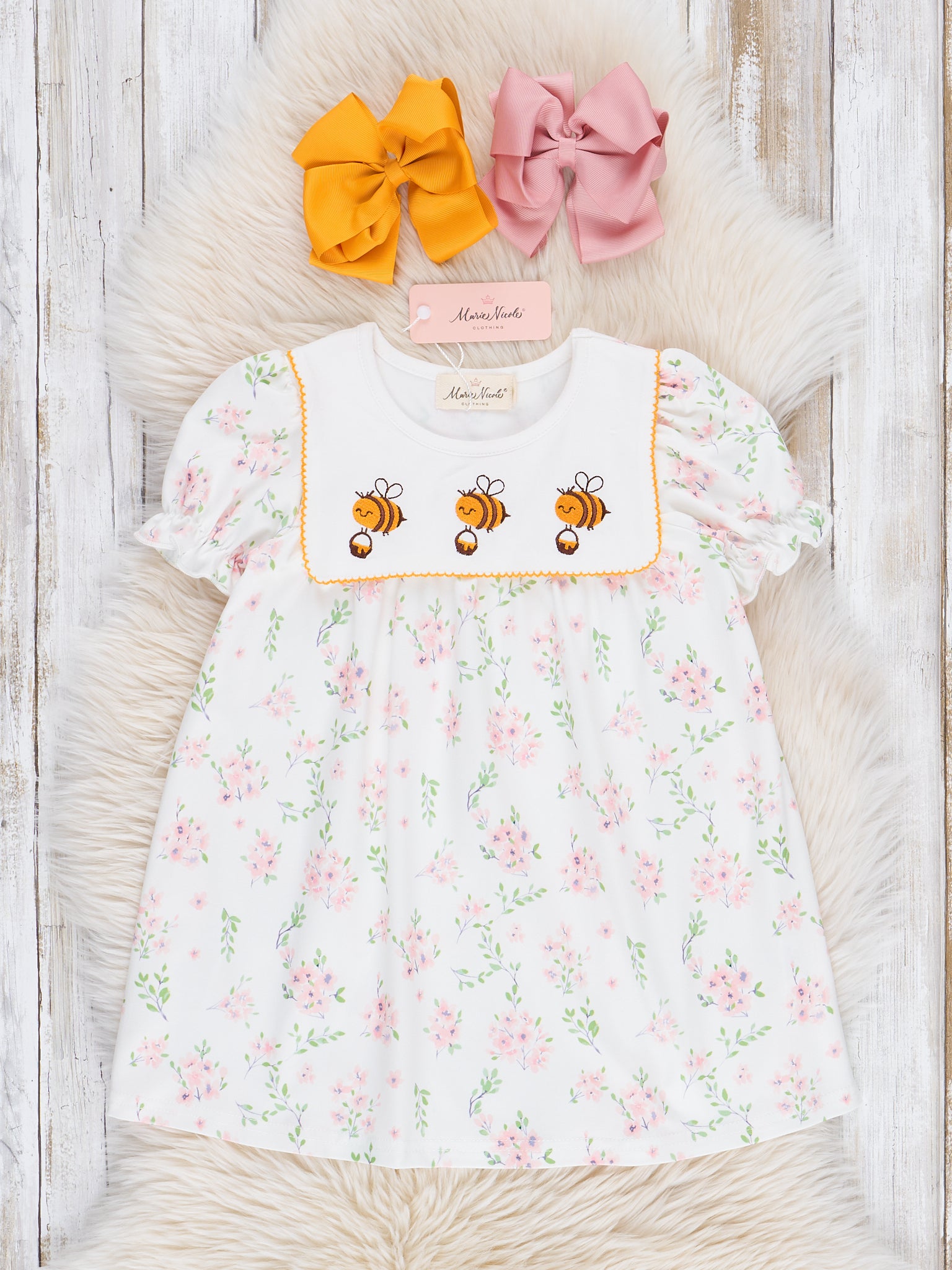 Unleash the buzz with our Bee in Your Bonnet Embroidered Ruffle Dress! This playful girls dress is perfect for spring with its green & pink floral bodice and adorable embroidered bees over the collar. This piece by Marie Nicole Clothing is made for a buzz-worthy look. Don't miss out on the fun!