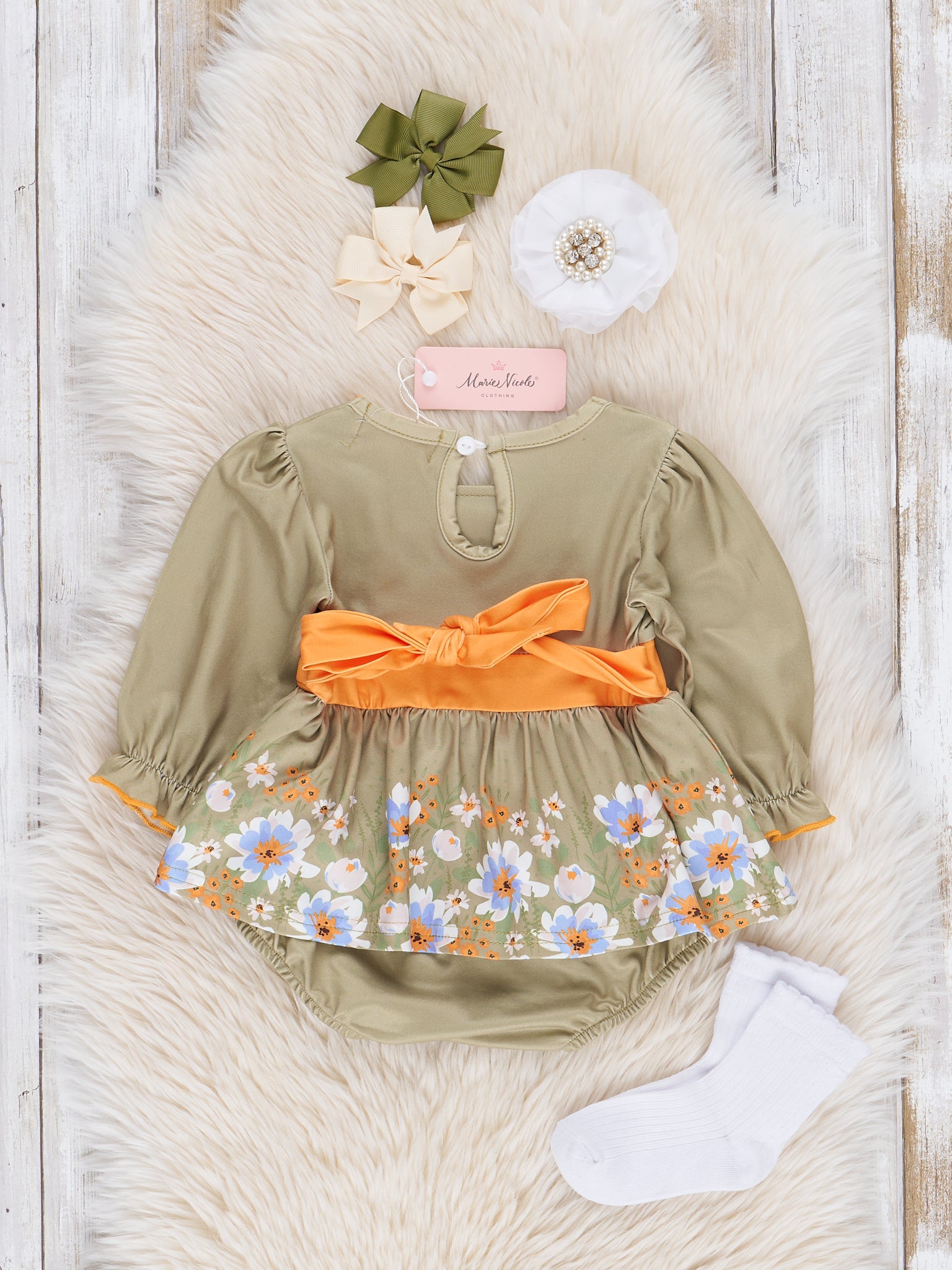 Add a pop of color to your little girl's wardrobe with this green & yellow daisy garden bubble by Marie Nicole Clothing! Featuring a playful ruffled design and orange trim, the Blooming Daisy Garden Bubble also includes a daisy printed peplum detail for added charm. With soft, stretchy fabric, your little one will love playing in this romper!