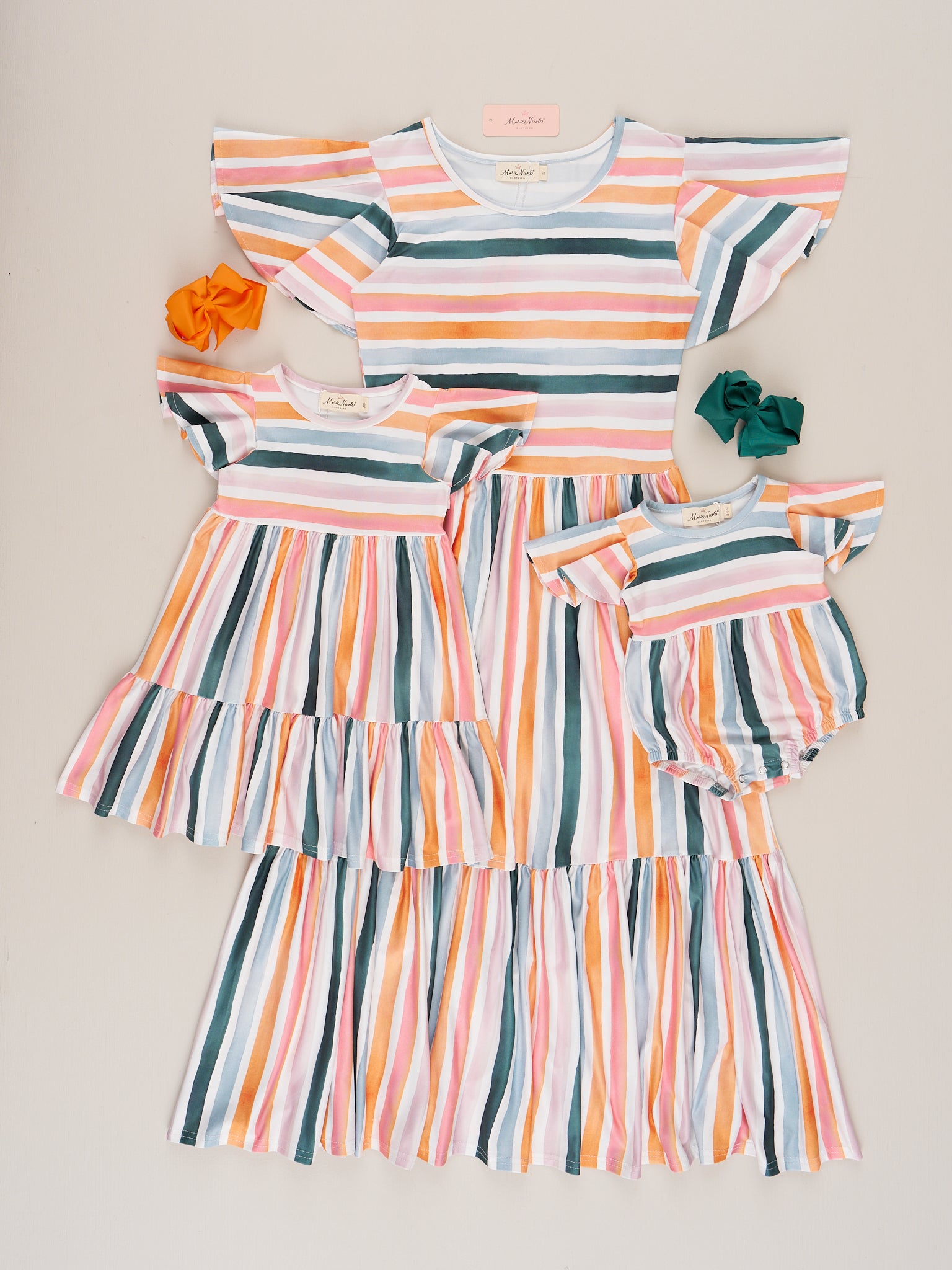This Coastal Tide Tiered Stripe Ruffle Bubble by Marie Nicole Clothing features the sweetest stripes & ruffle trim for a beautiful family match. With colors inspired by the sea foam and sunny beaches, this soft, comfy one-piece is perfect for warmer weather, whether spring or summer. The lovely ruffles make it extra cute. As a Mom & Me set, it is perfect for family matching!