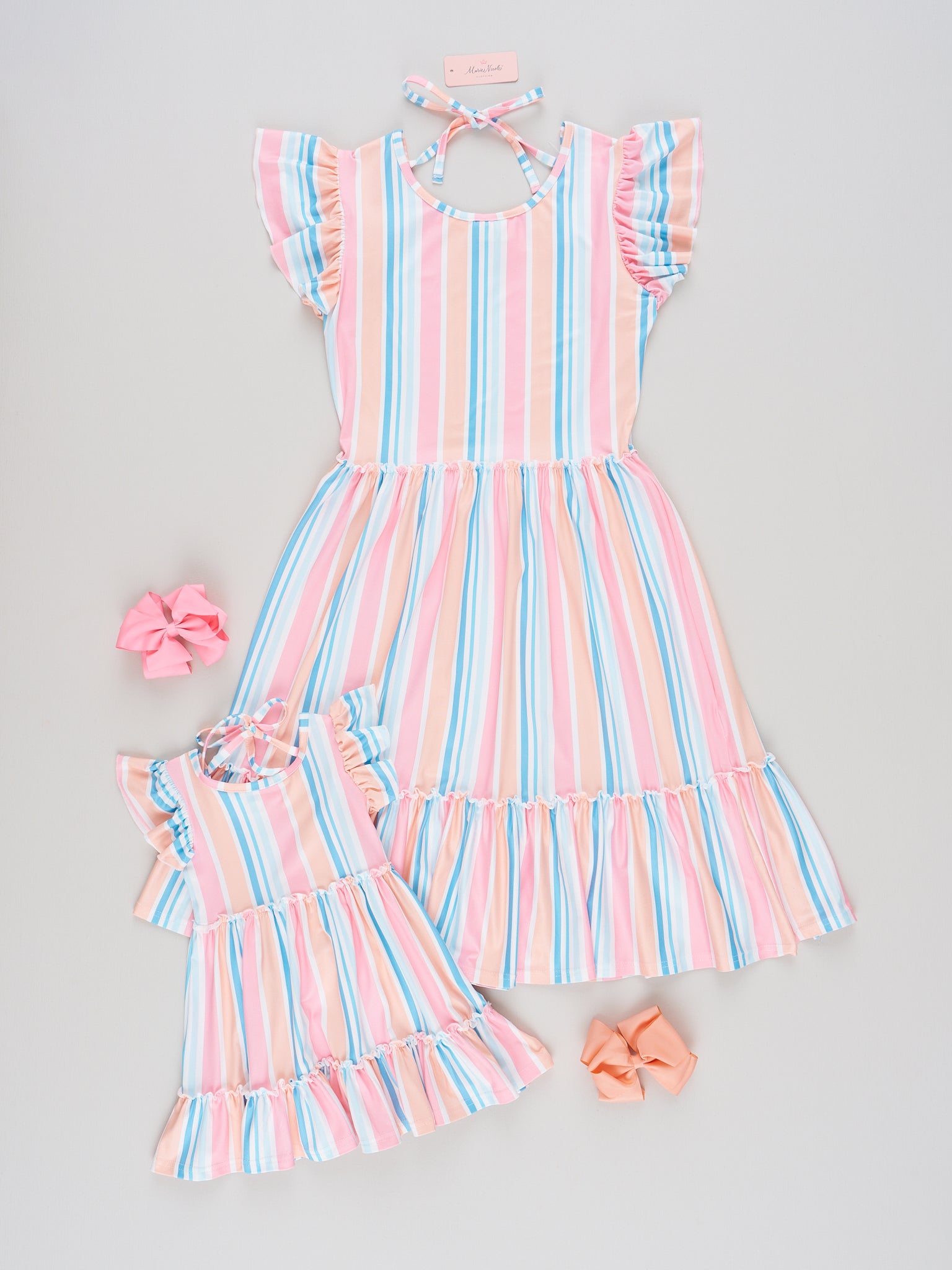 This Day Bloom Tiered Stripe Ruffle Dress by Marie Nicole Clothing features the sweetest stripes & ruffle trim for a beautiful family match. With colors inspired by flower petals and the brightness of spring, this soft, comfy one-piece is perfect for warmer weather. The stylish tie neck make it extra cute. As a Mom & Me set, it is perfect for family matching!