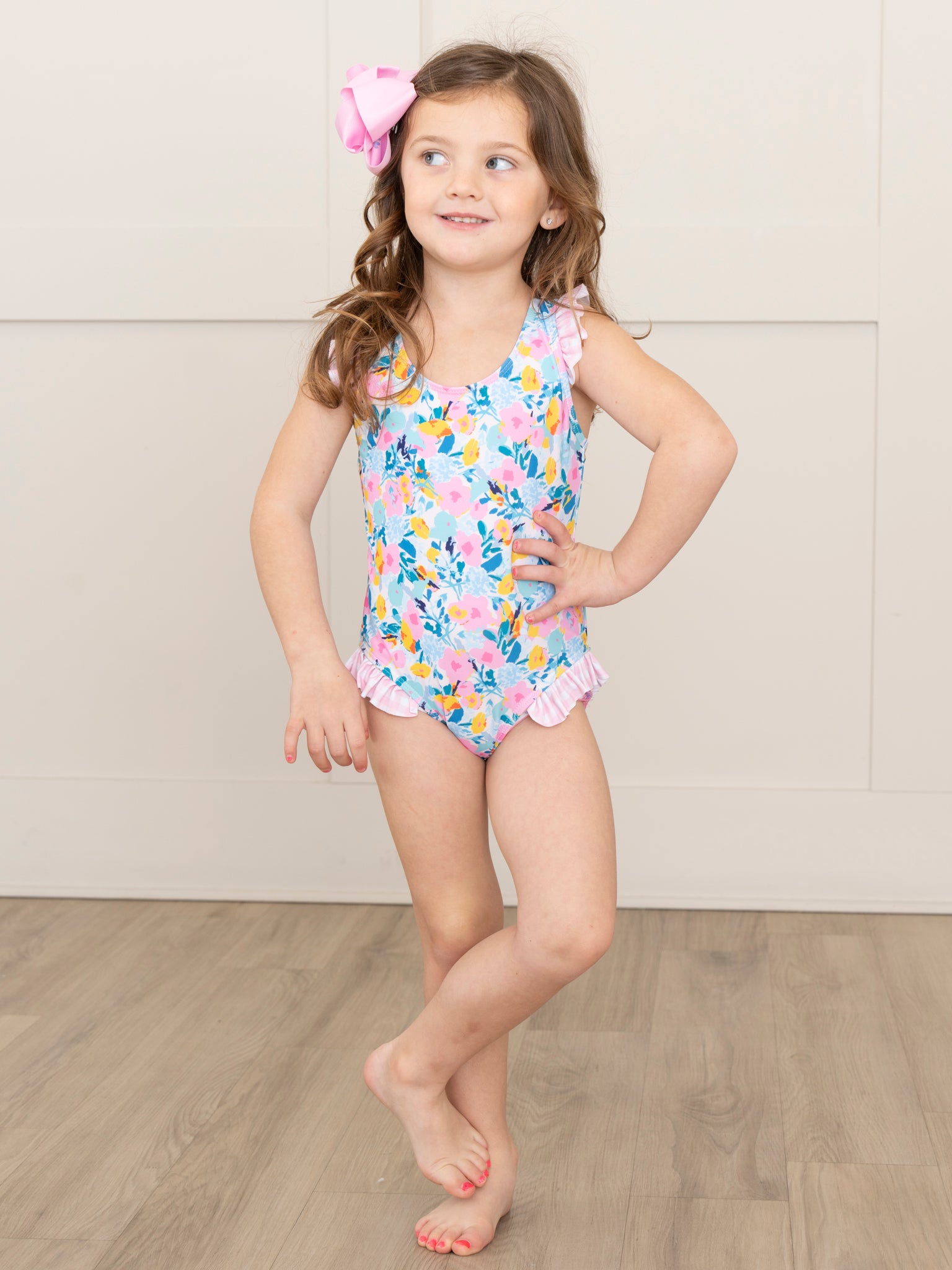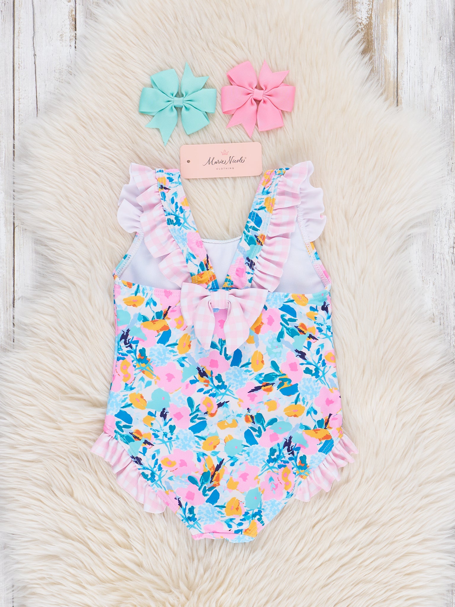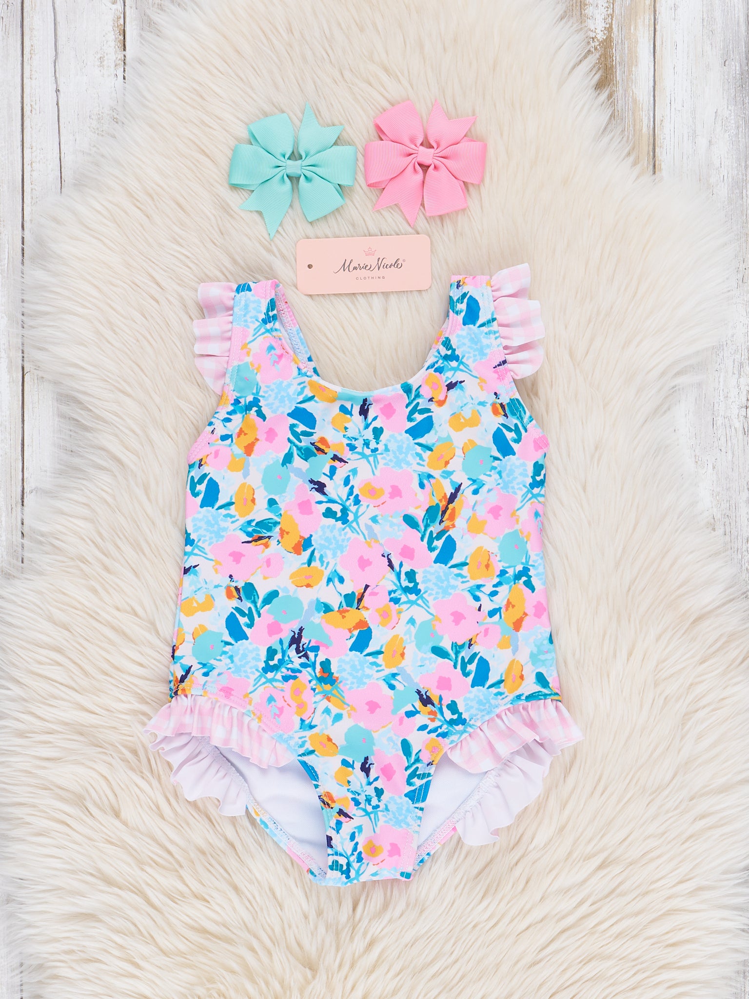 Splash into summer with the Bed of Roses Ruffle Swimsuit! Designed by Marie Nicole Clothing, this one-piece swimsuit features a playful mix of floral doodles and pink gingham ruffle trim. This sweet swimsuit is a must-have for beach and pool days.