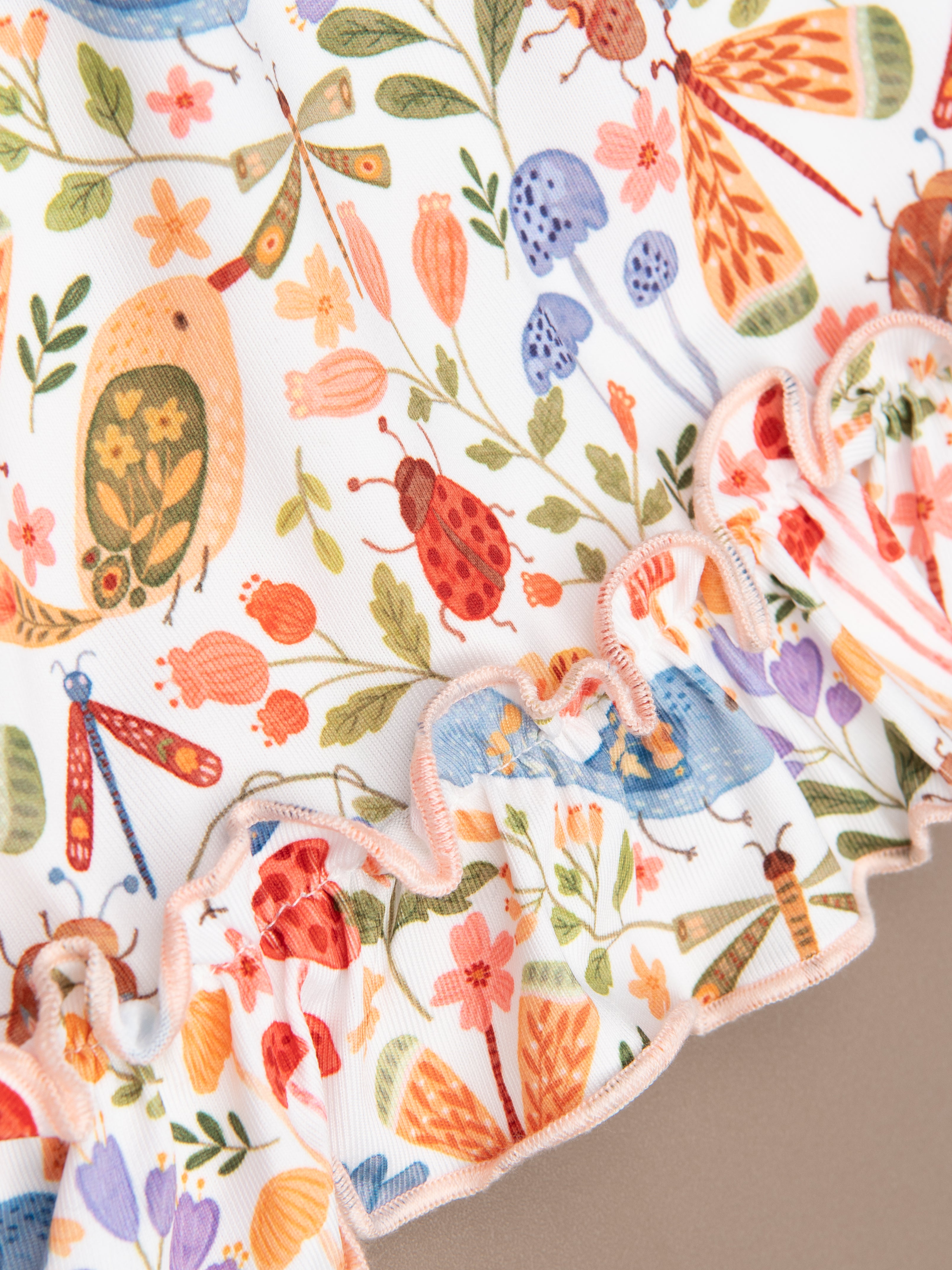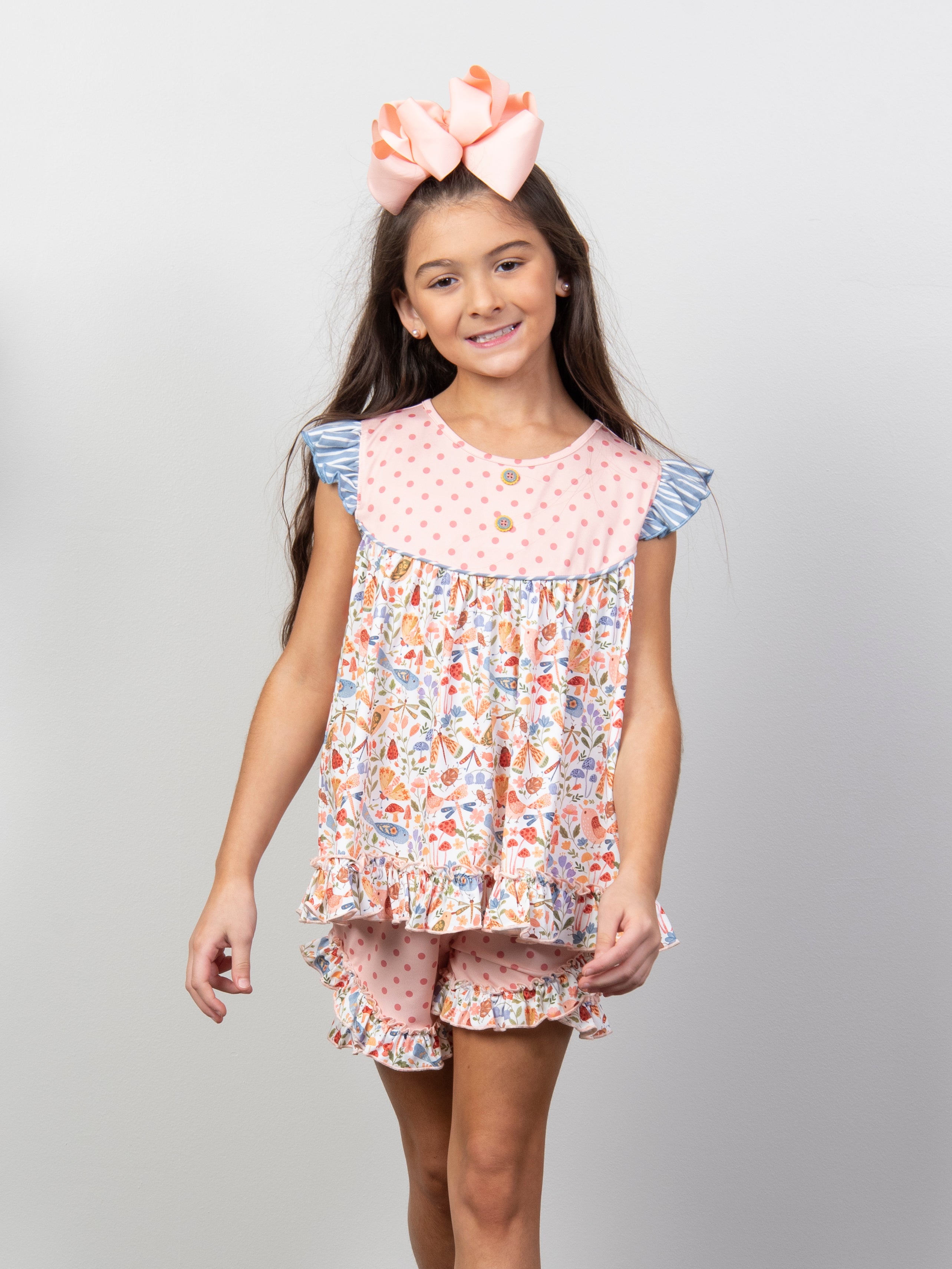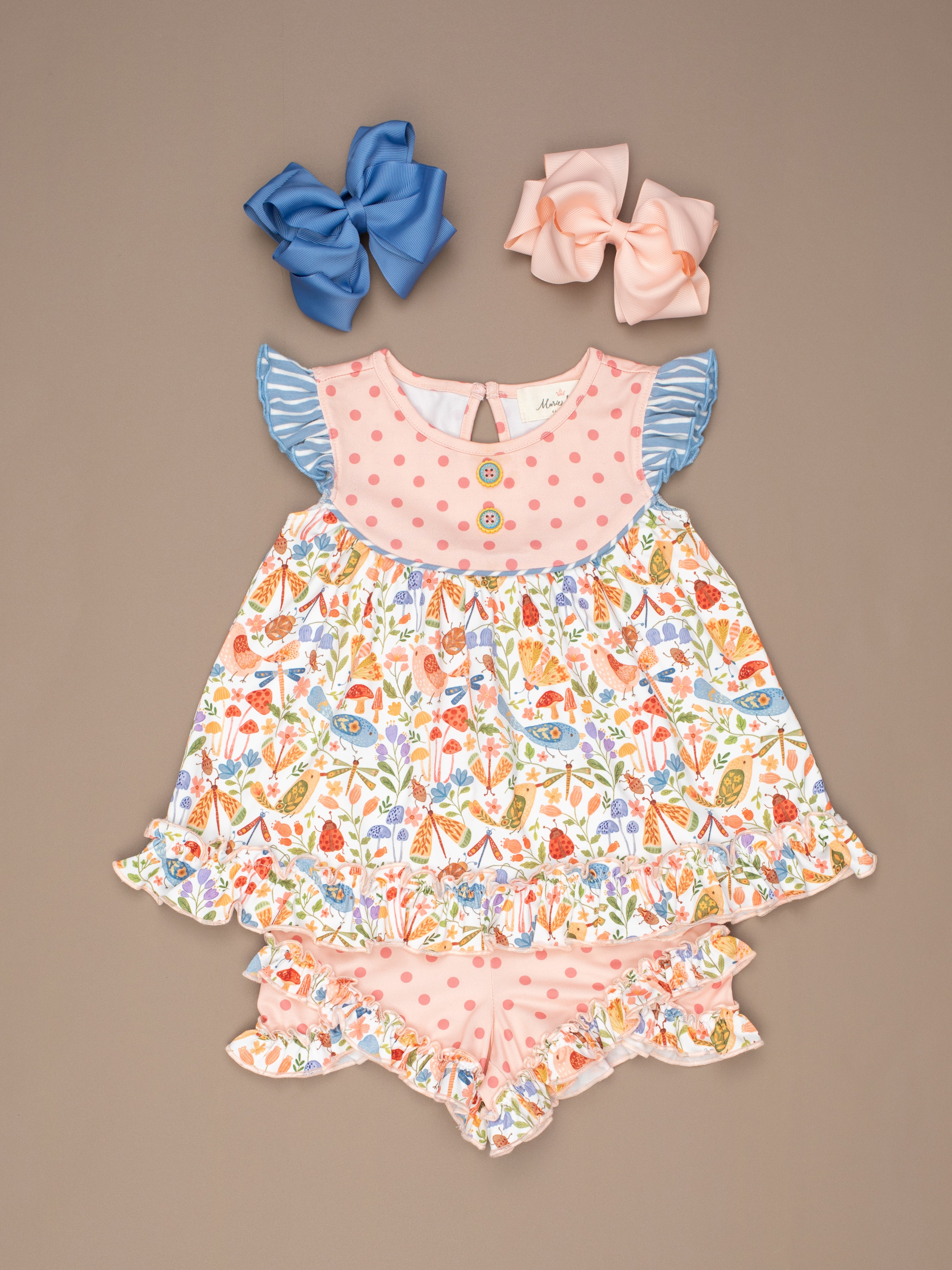 Springtime is just around the corner & this MNC exclusive collection is a MUST-HAVE this season! This high-quality collection has the softest material & is made to grow with your little one! This tunic features our Tennessee Garden print, polka dots, striped ruffle trim, detailed decorative buttons, & a keyhole at the nape of the neck.