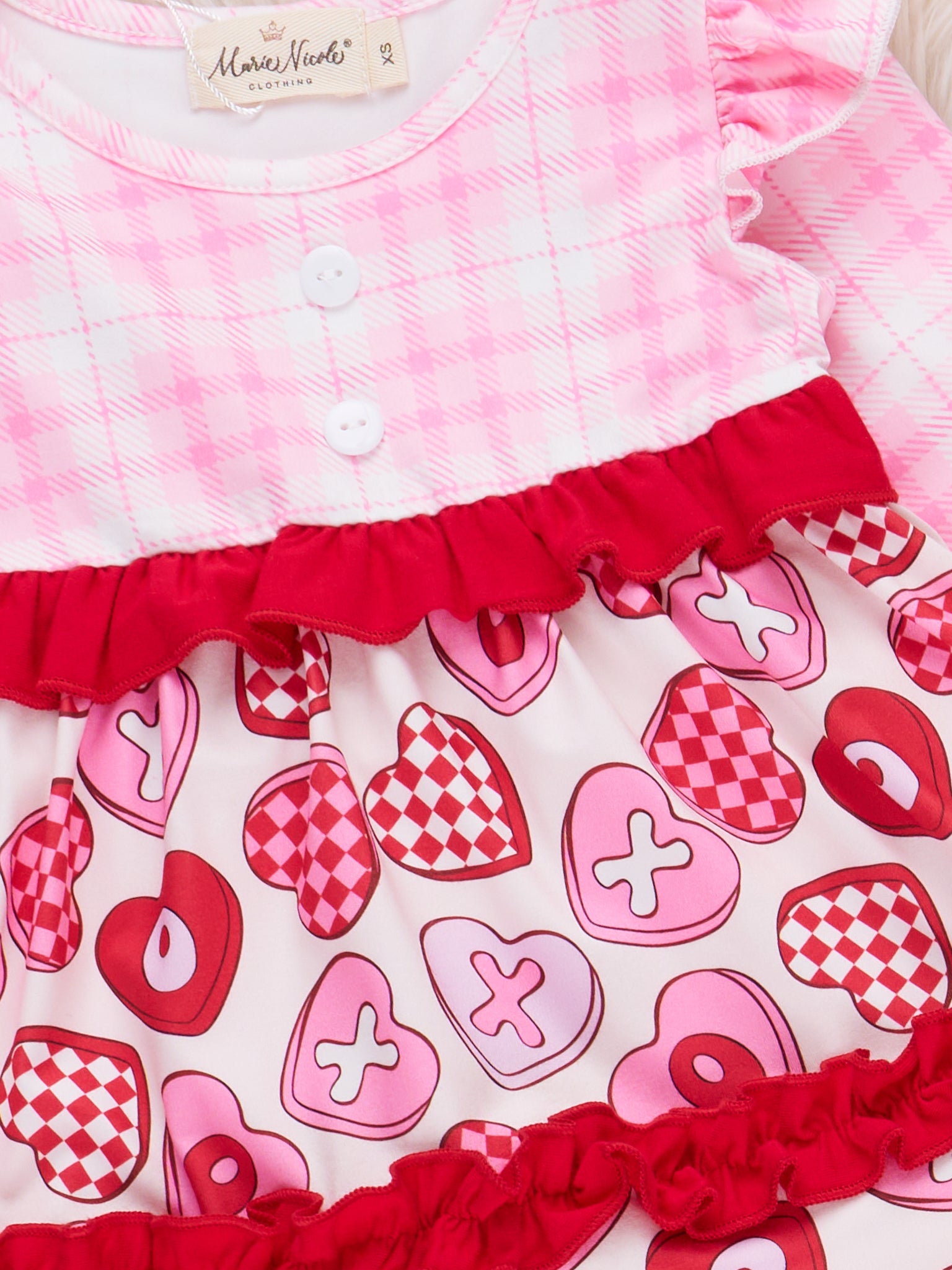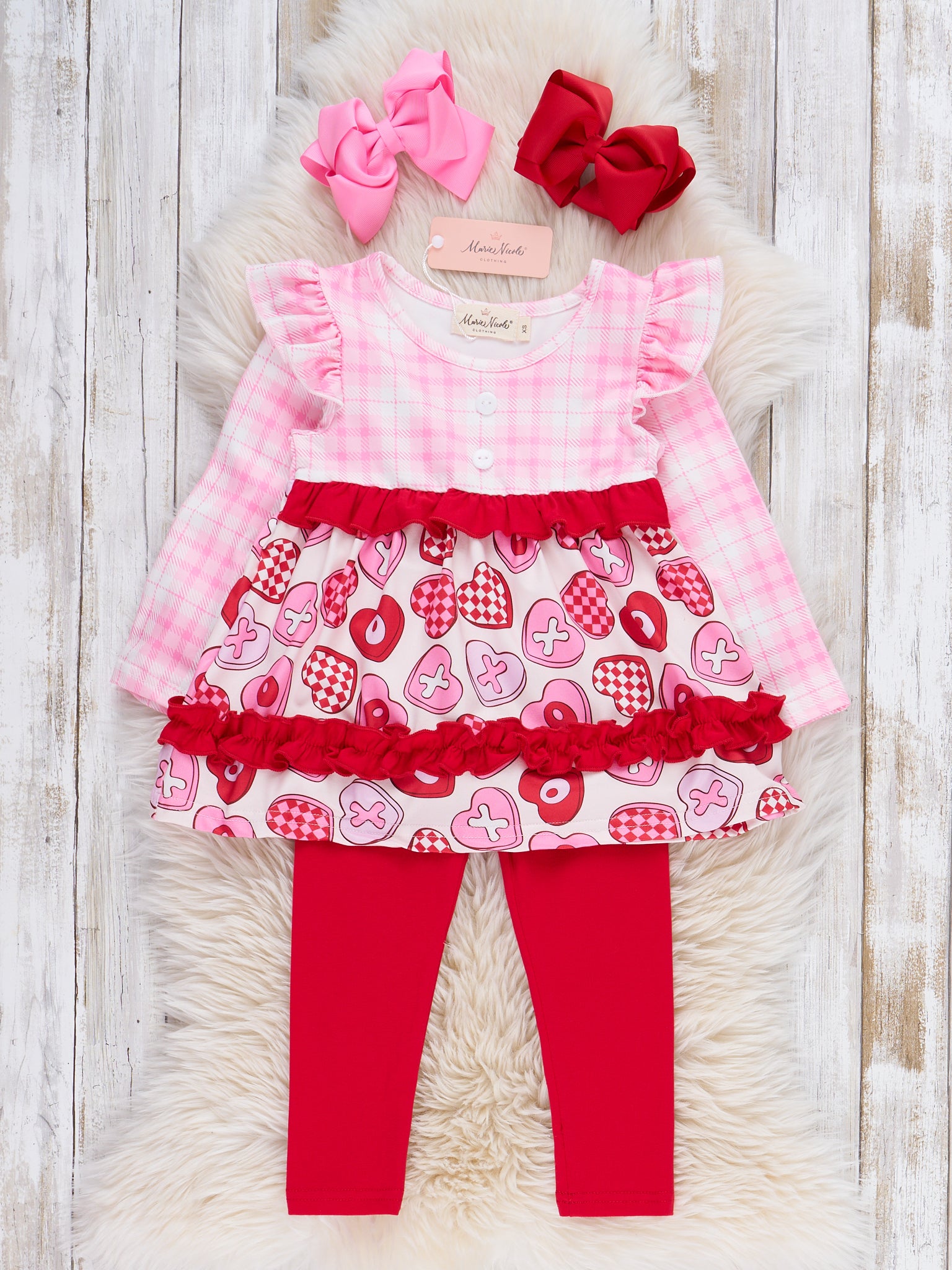 Lovebug Ruffle Plaid Outfit by Marie Nicole Clothing pairs a pretty plaid tunic adorned with heart confections and rows of ruffles, with bold red leggings for a cozy, coordinated look. Designed to make every celebration extra sweet, this outfit brings playful charm and festive Valentine's Day style to any loving occasion or cheerful seasonal gathering.