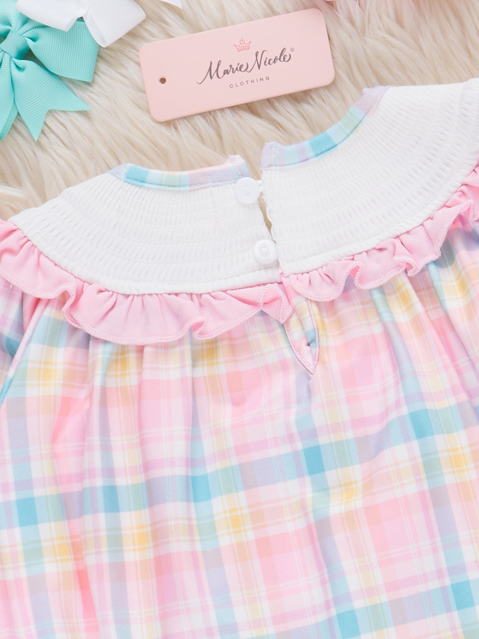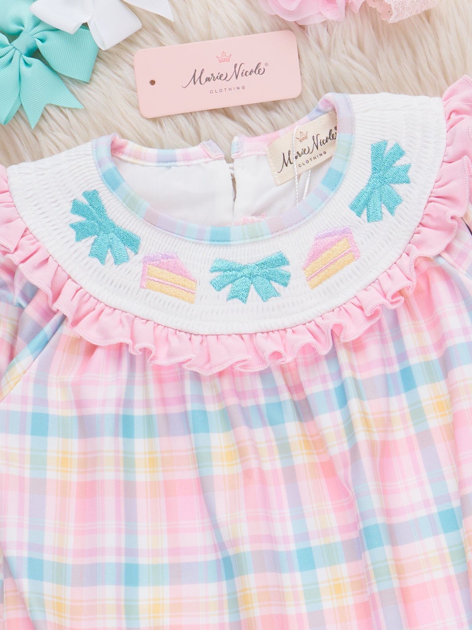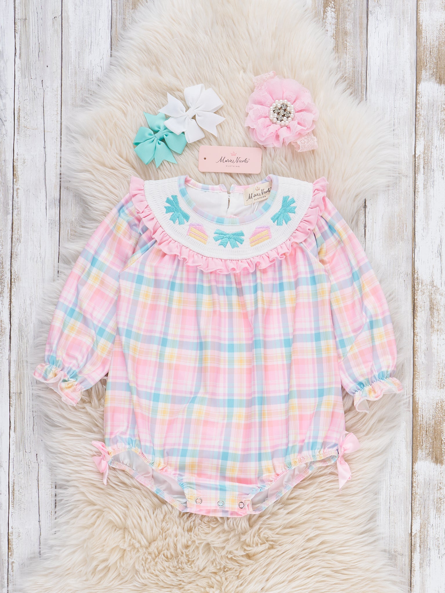 The Bakes and Bows Smocked Bubble Romper by Marie Nicole features a pastel plaid pattern with charming bows and a decorative collar, along with ruffled trim and long gathered sleeves. Adjustable side ties and a bubble silhouette offer comfort and playful style, making it a lovely choice for special occasions or everyday wear.