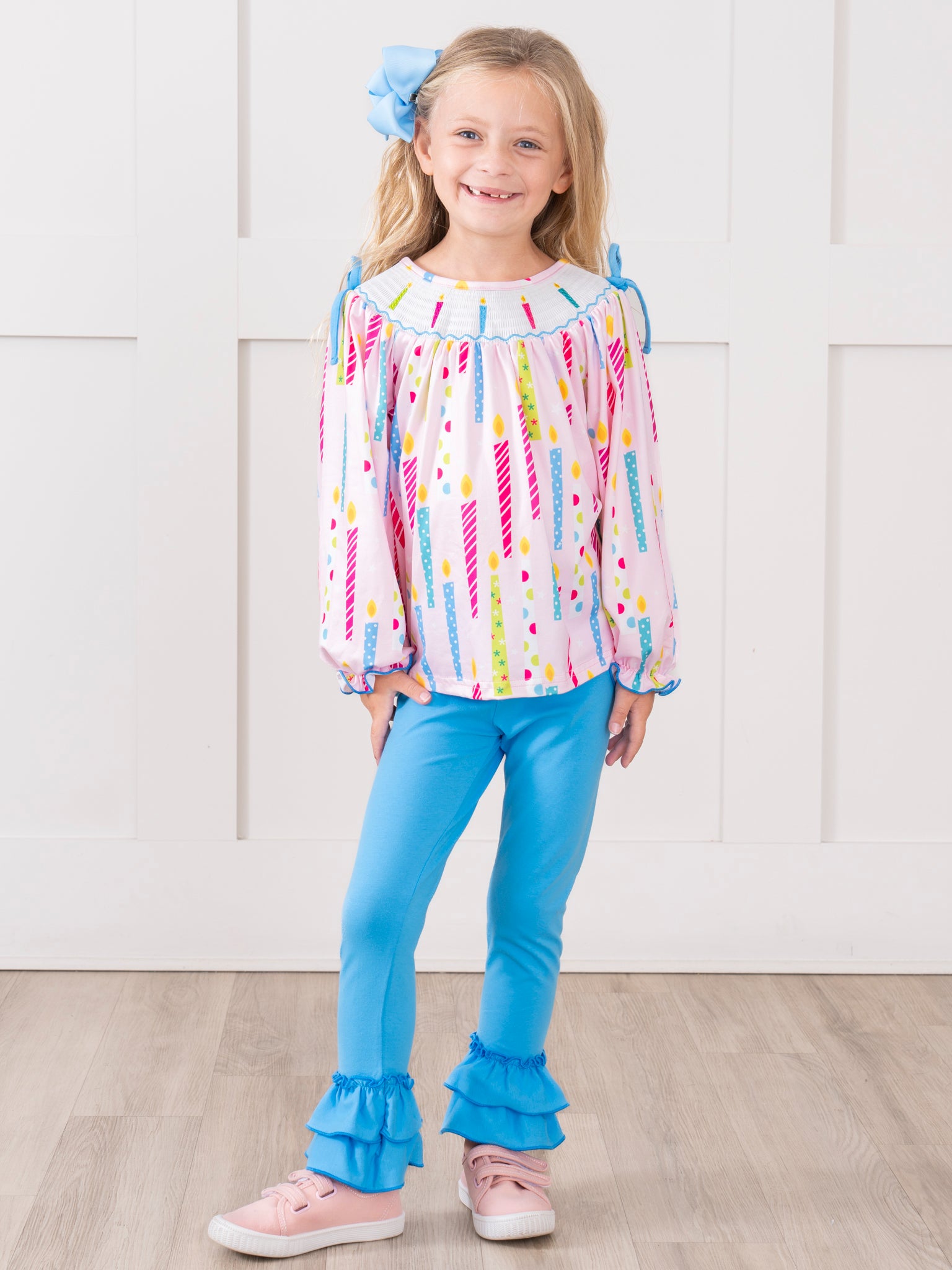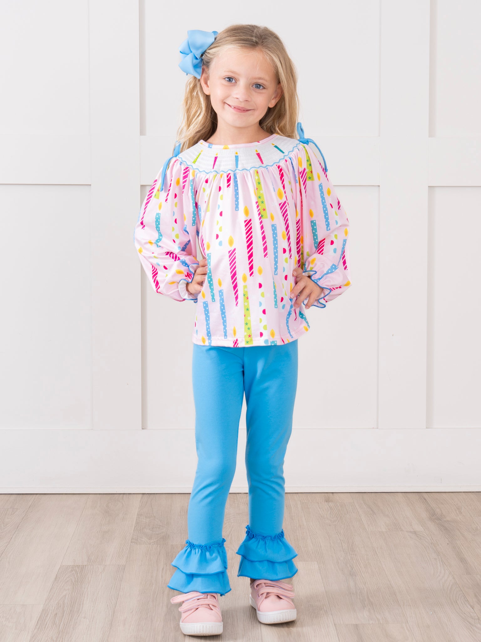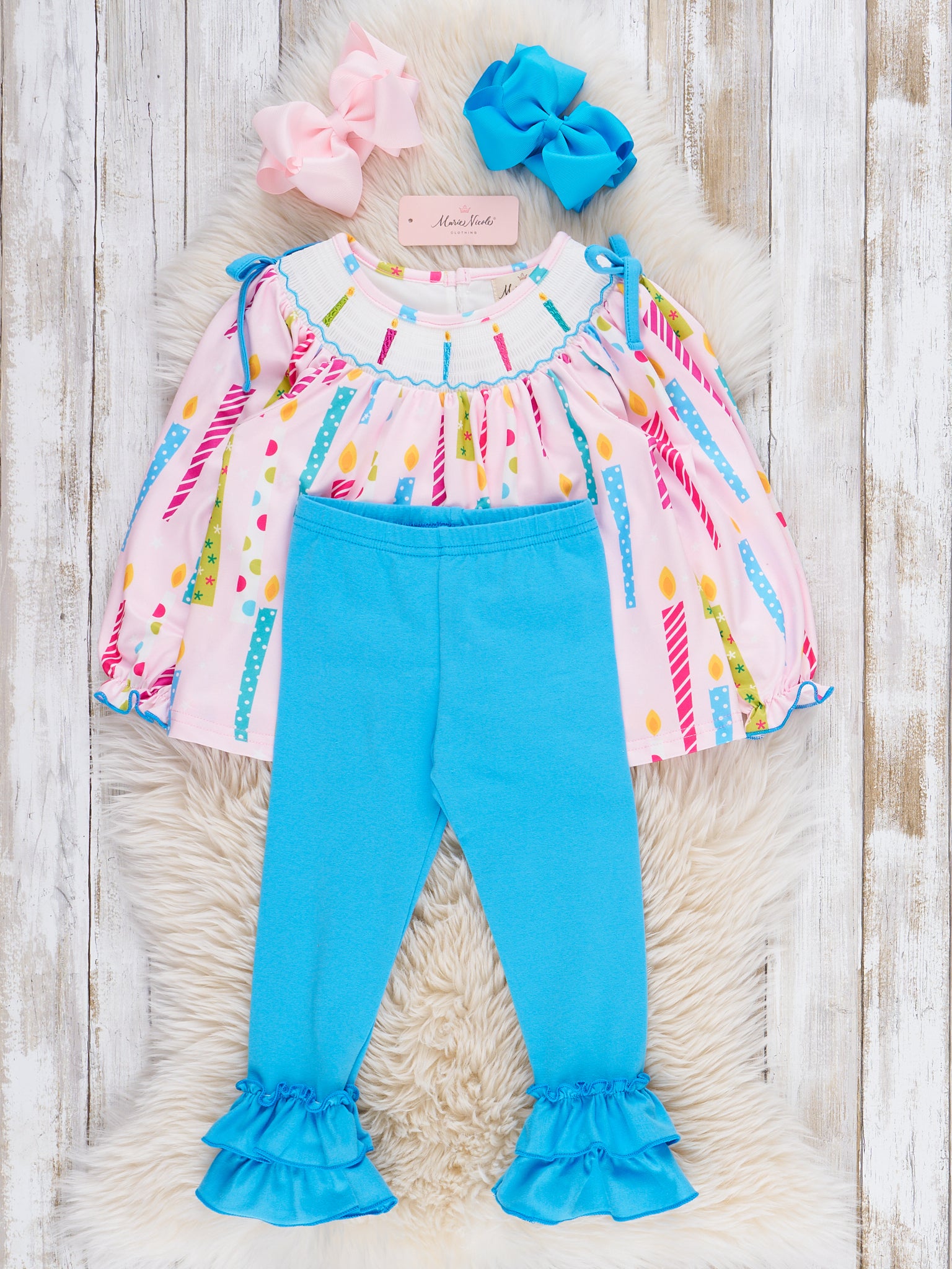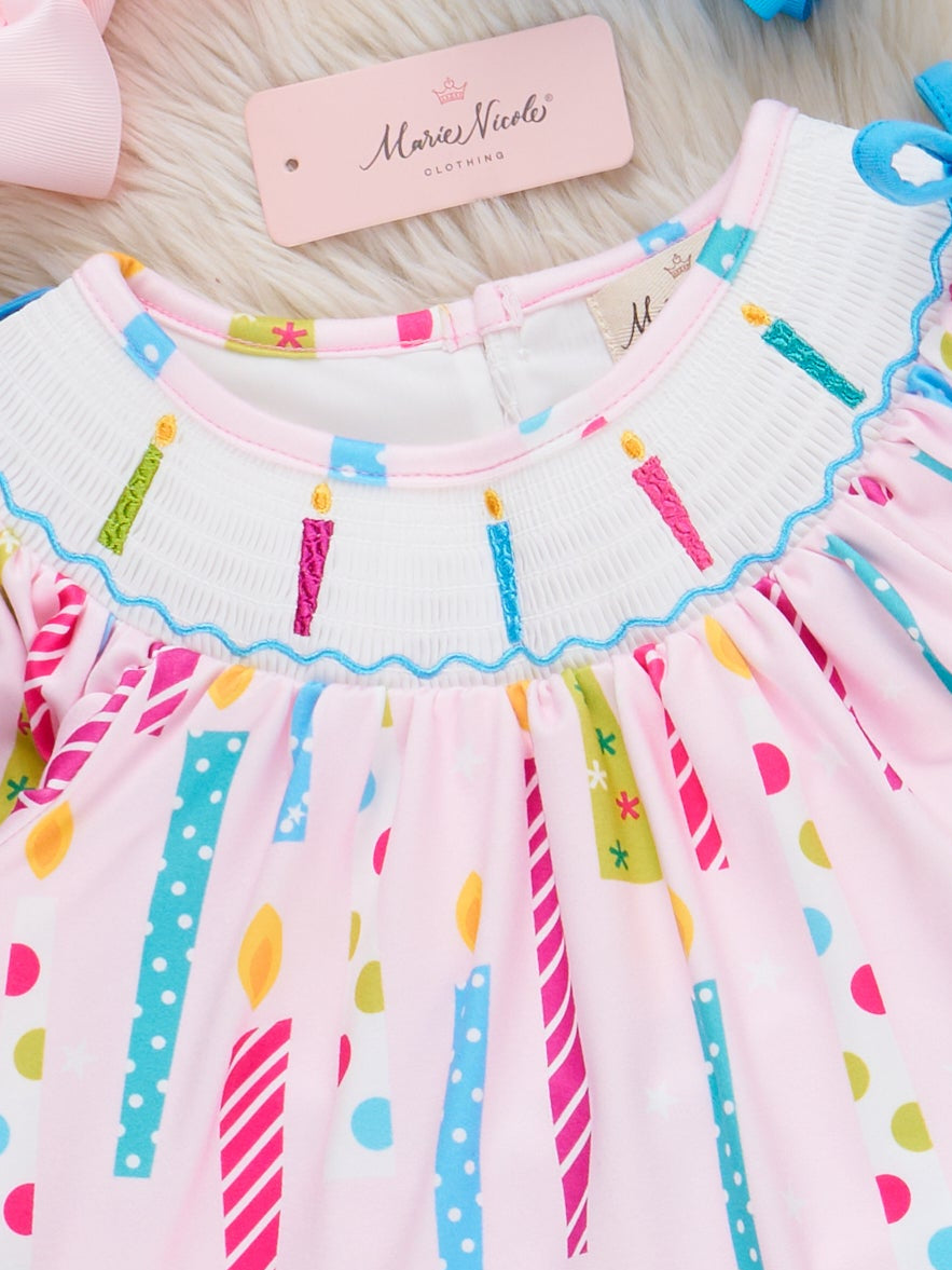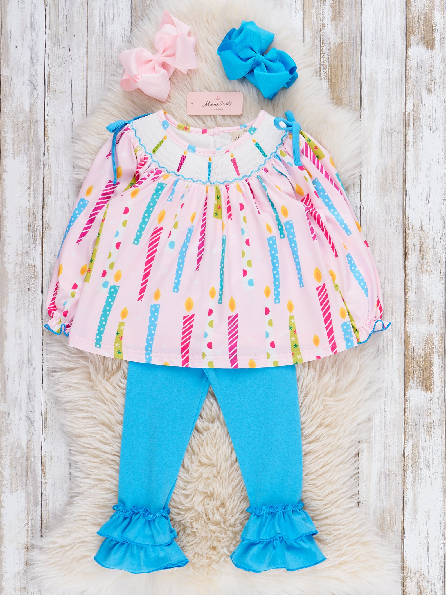 The Wish Upon a Candle Smocked Ruffle Outfit by Marie Nicole Clothing makes every day feel special with its charming candle print and delicate ruffle details. Designed with soft, comfortable fabric and playful bow accents at the shoulders, this set is perfect for birthdays brings a sweet, whimsical touch to any little one’s wardrobe.