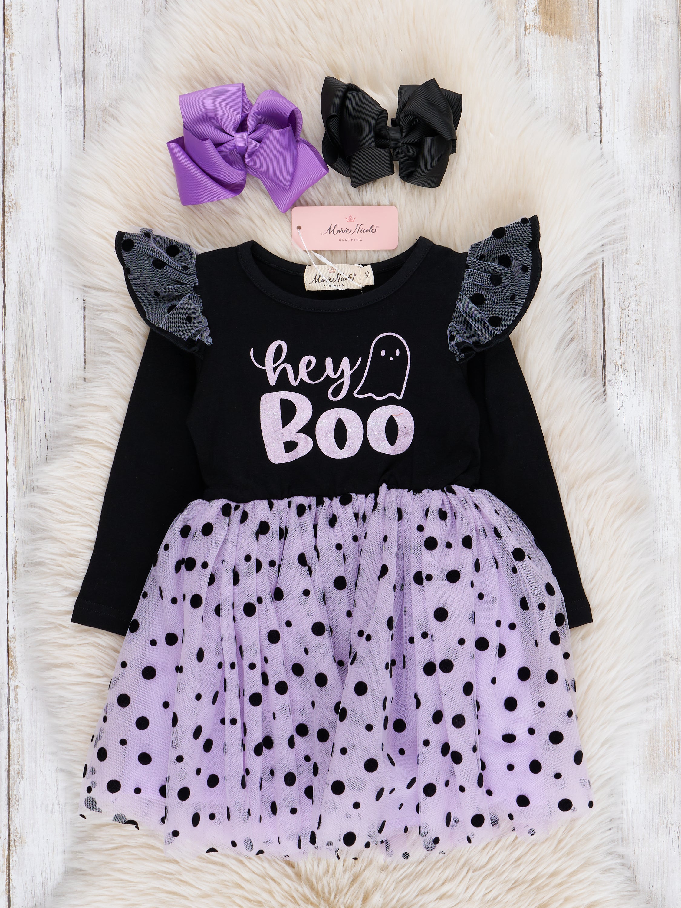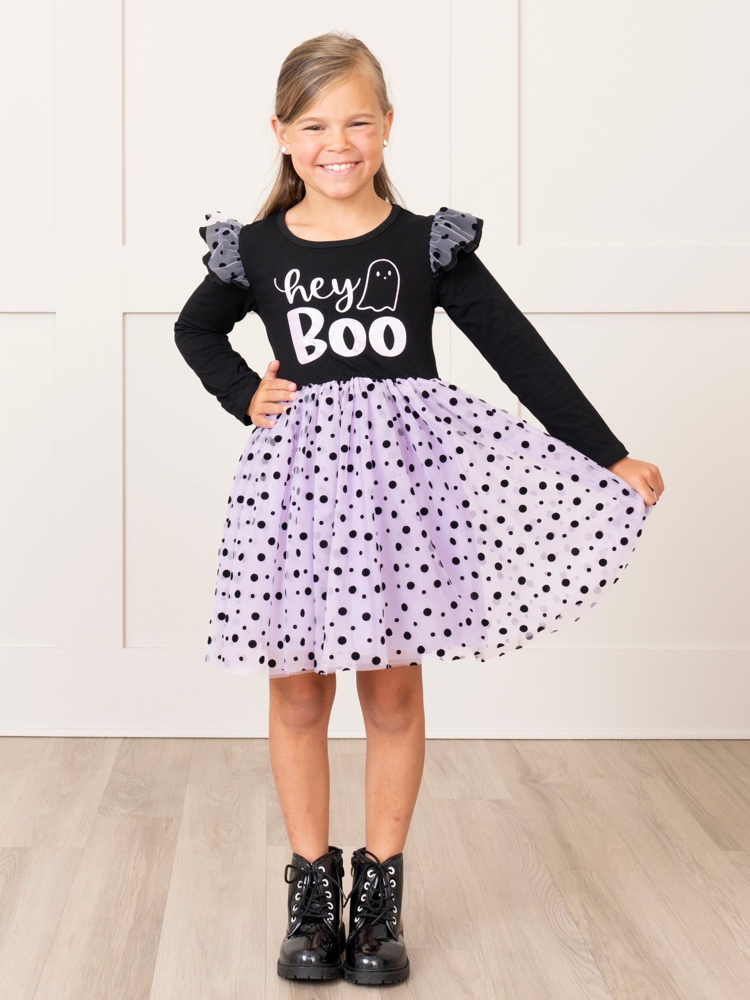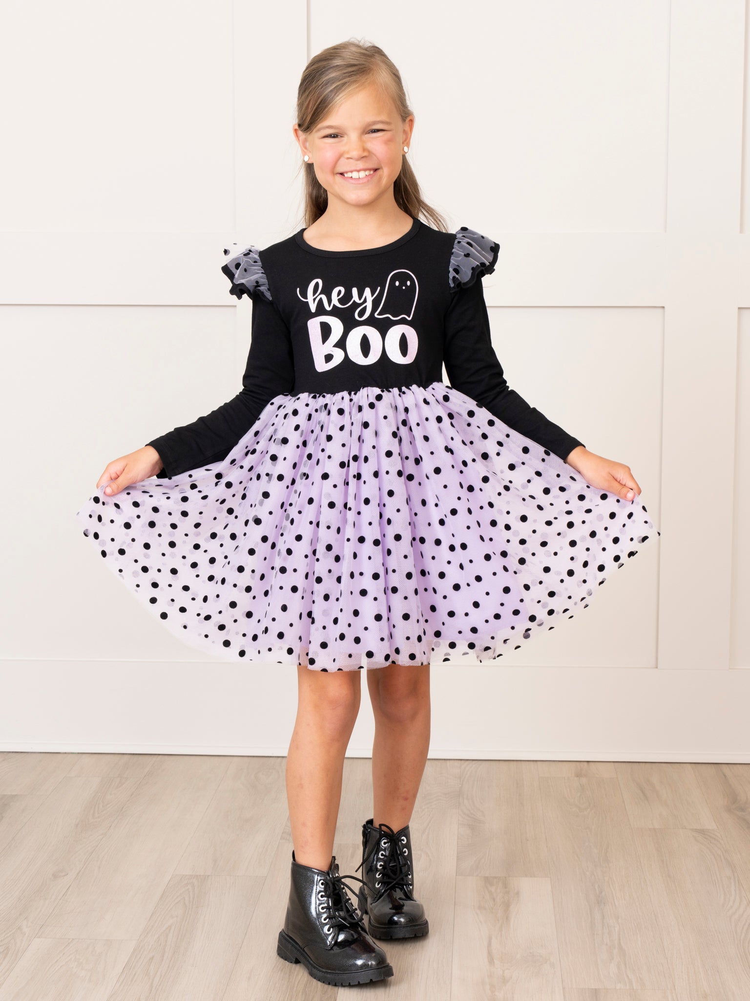 Hey Boo! This adorable sister set has something for each of your sassy girlies! This dress features shoulder ruffles and a bright lavender polka dot tulle skirt for twirling right in to spooky season!