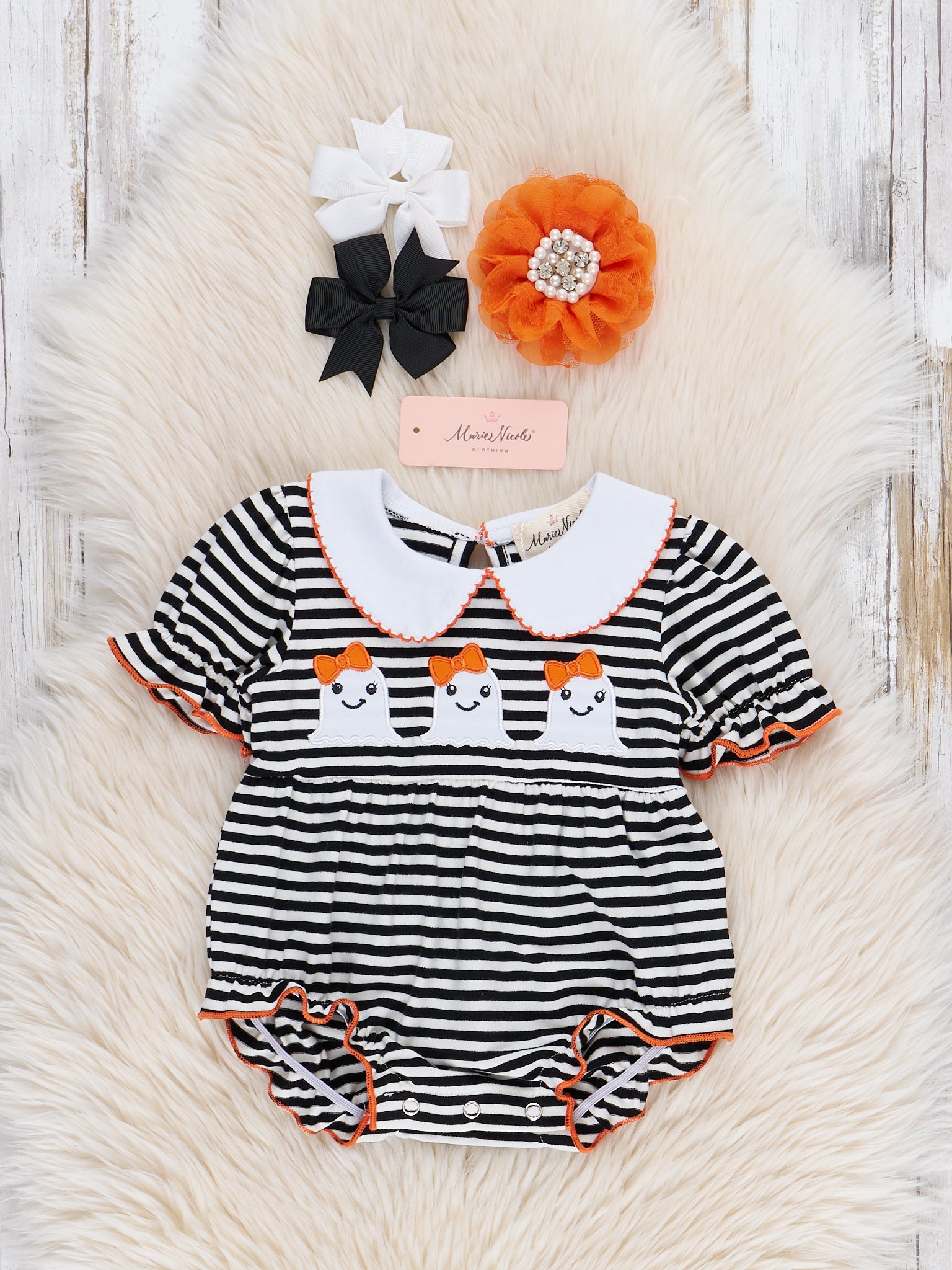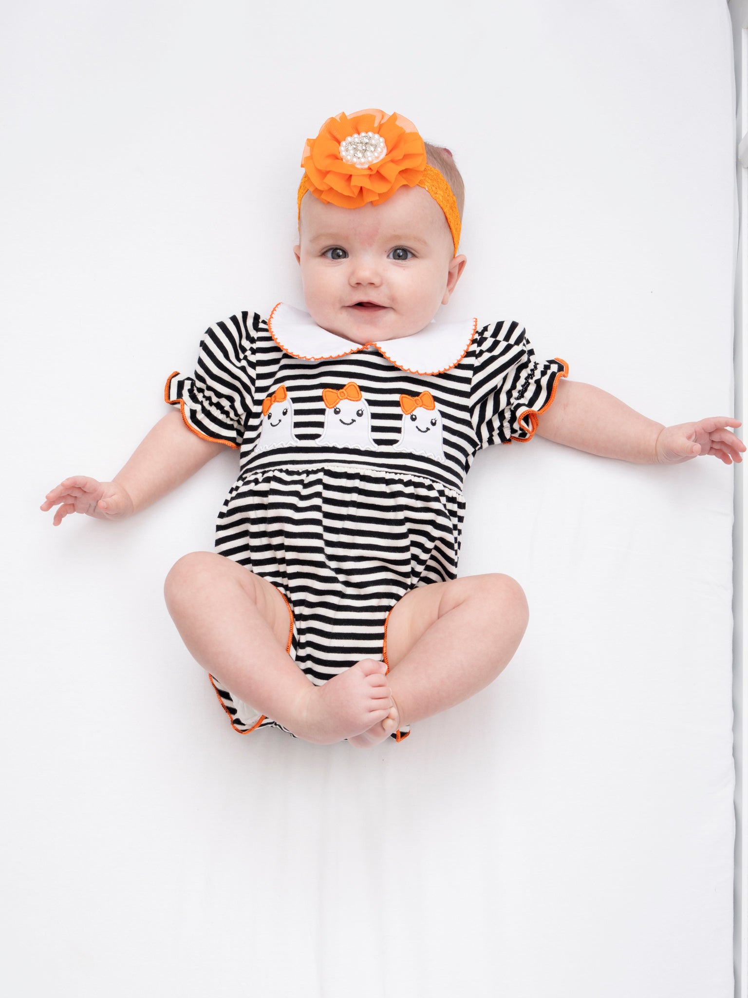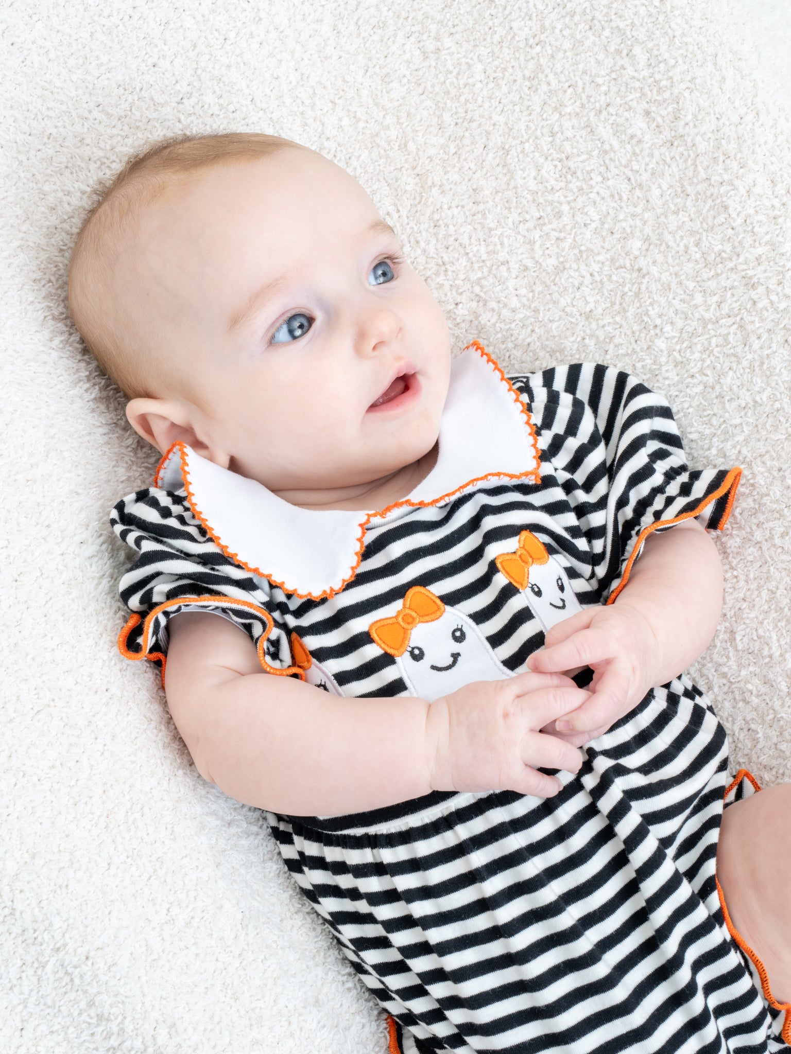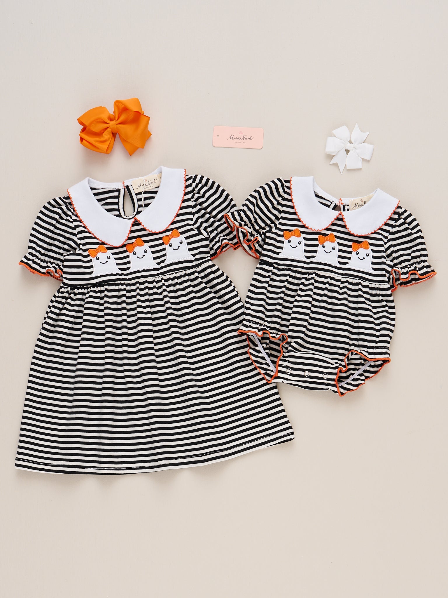 These Sweet Treat Sister Sets are festive but oh so sweet! Featuring a peter pan collar with pom pom border, smocked bodice, and fun, festive embroidered set of ghosts or candy corn over a striped pattern, your girly will love these for spooky season.
