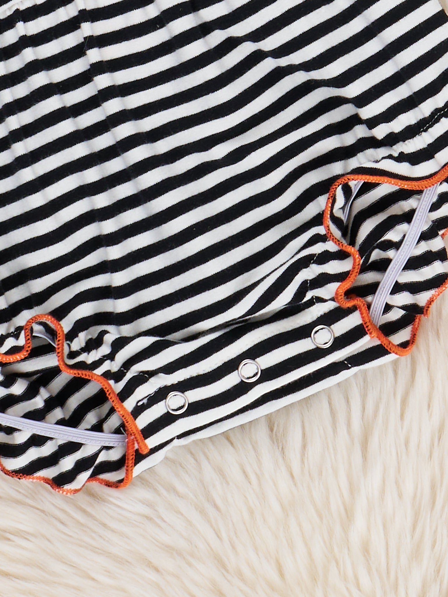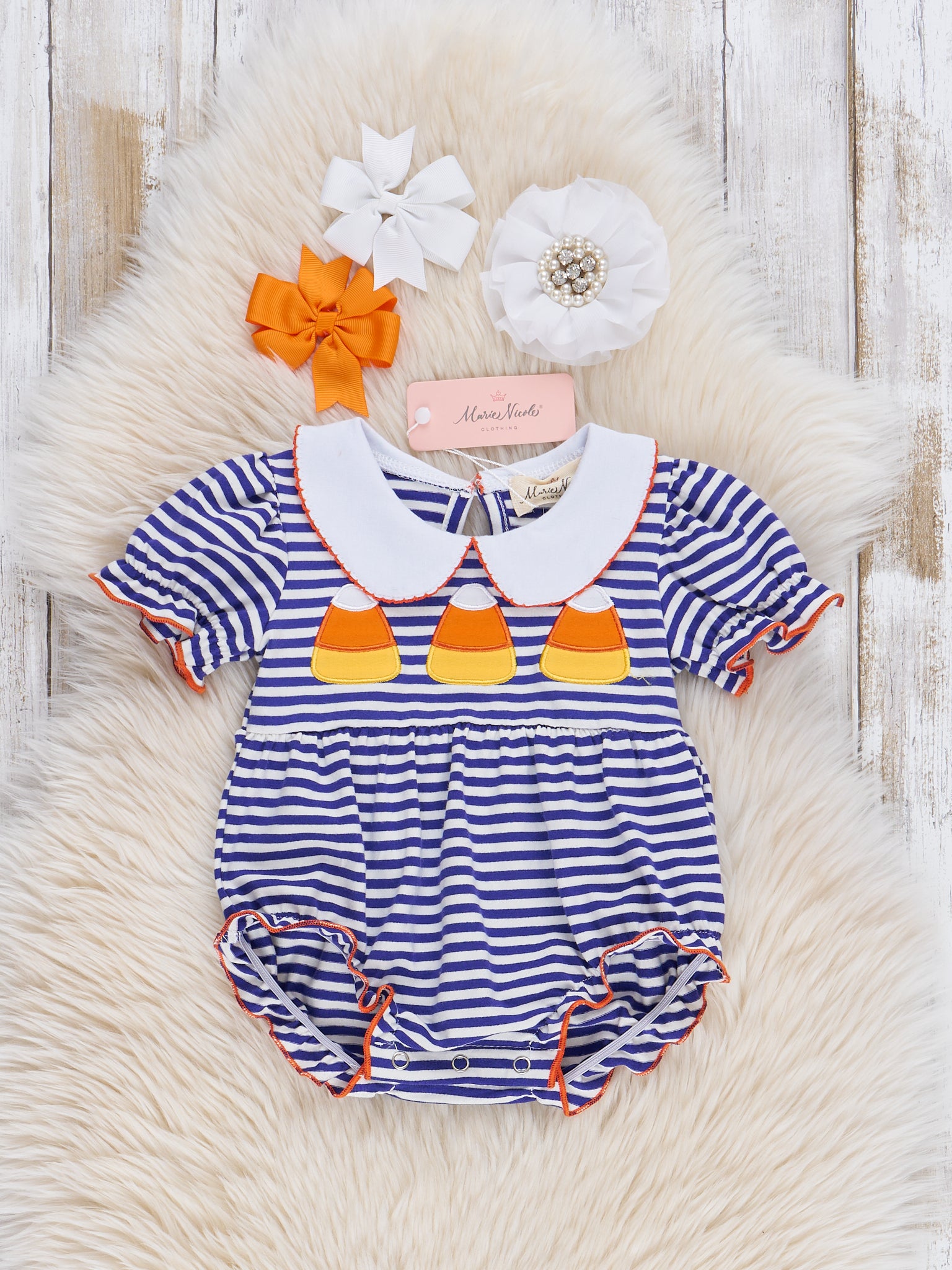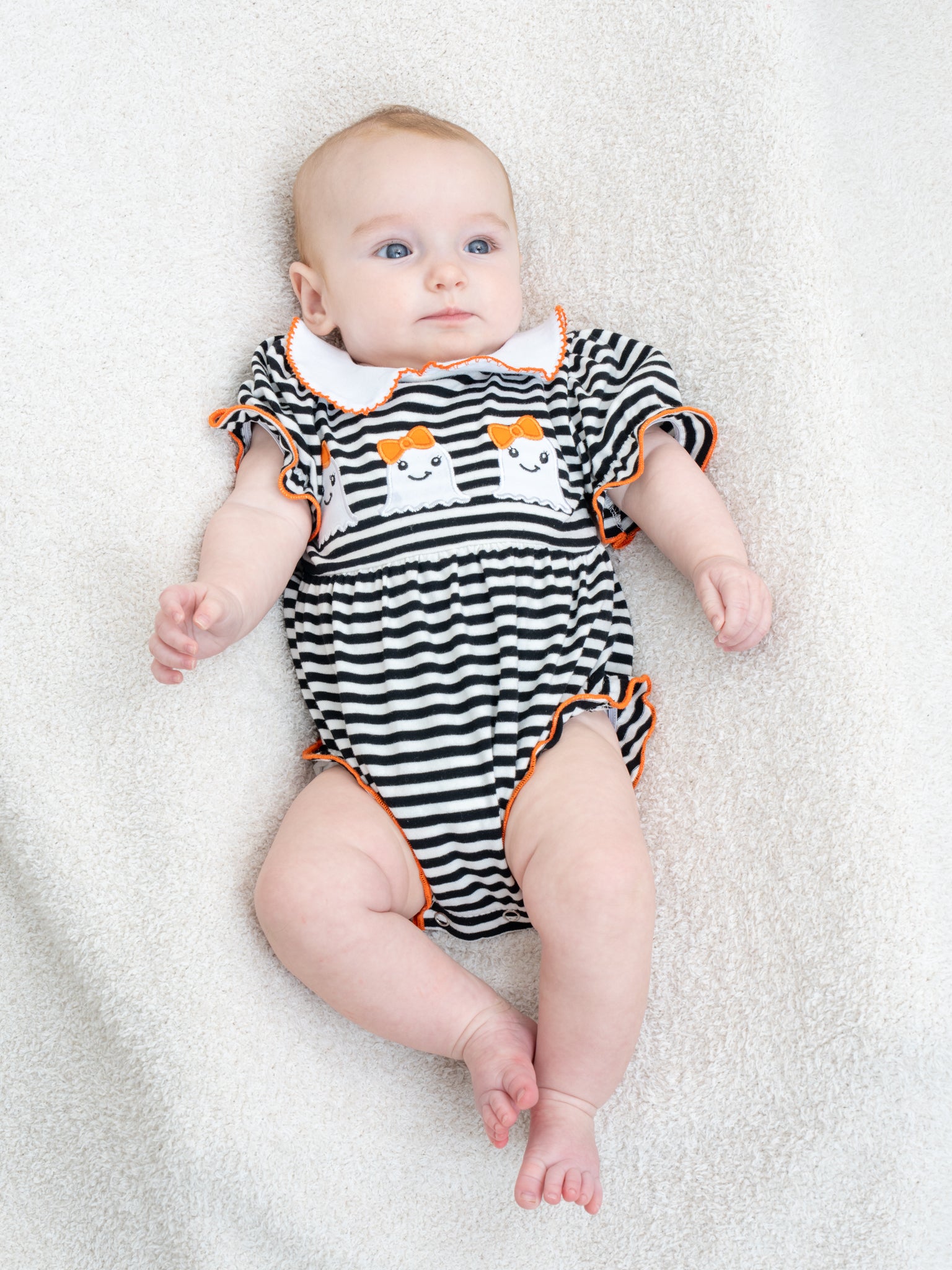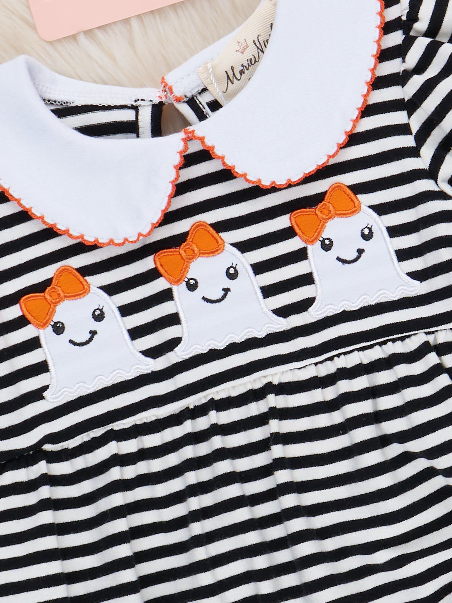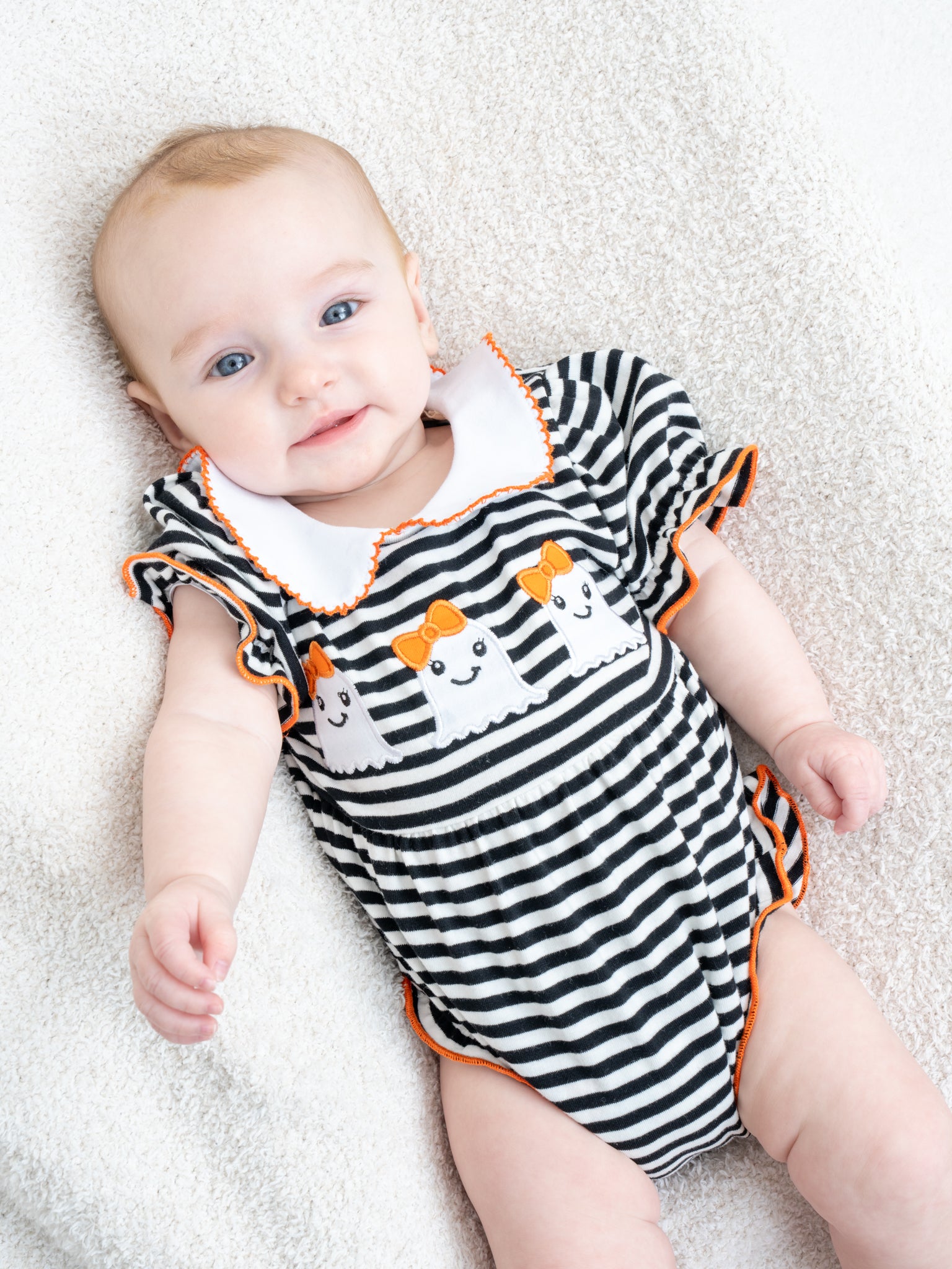 These Sweet Treat Sister Sets are festive but oh so sweet! Featuring a peter pan collar with pom pom border, smocked bodice, and fun, festive embroidered set of ghosts or candy corn over a striped pattern, your girly will love these for spooky season.