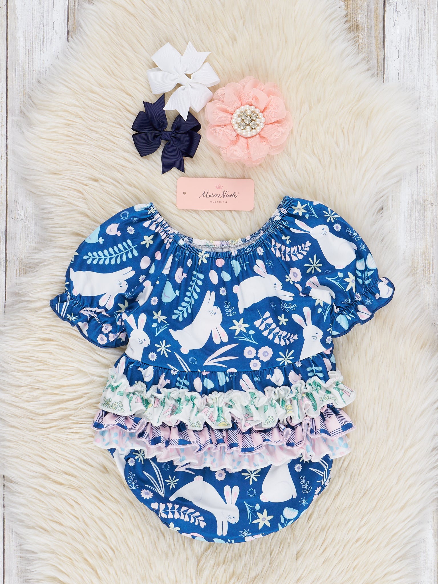 Navy Bunny Leaps Ruffle Bubble Romper