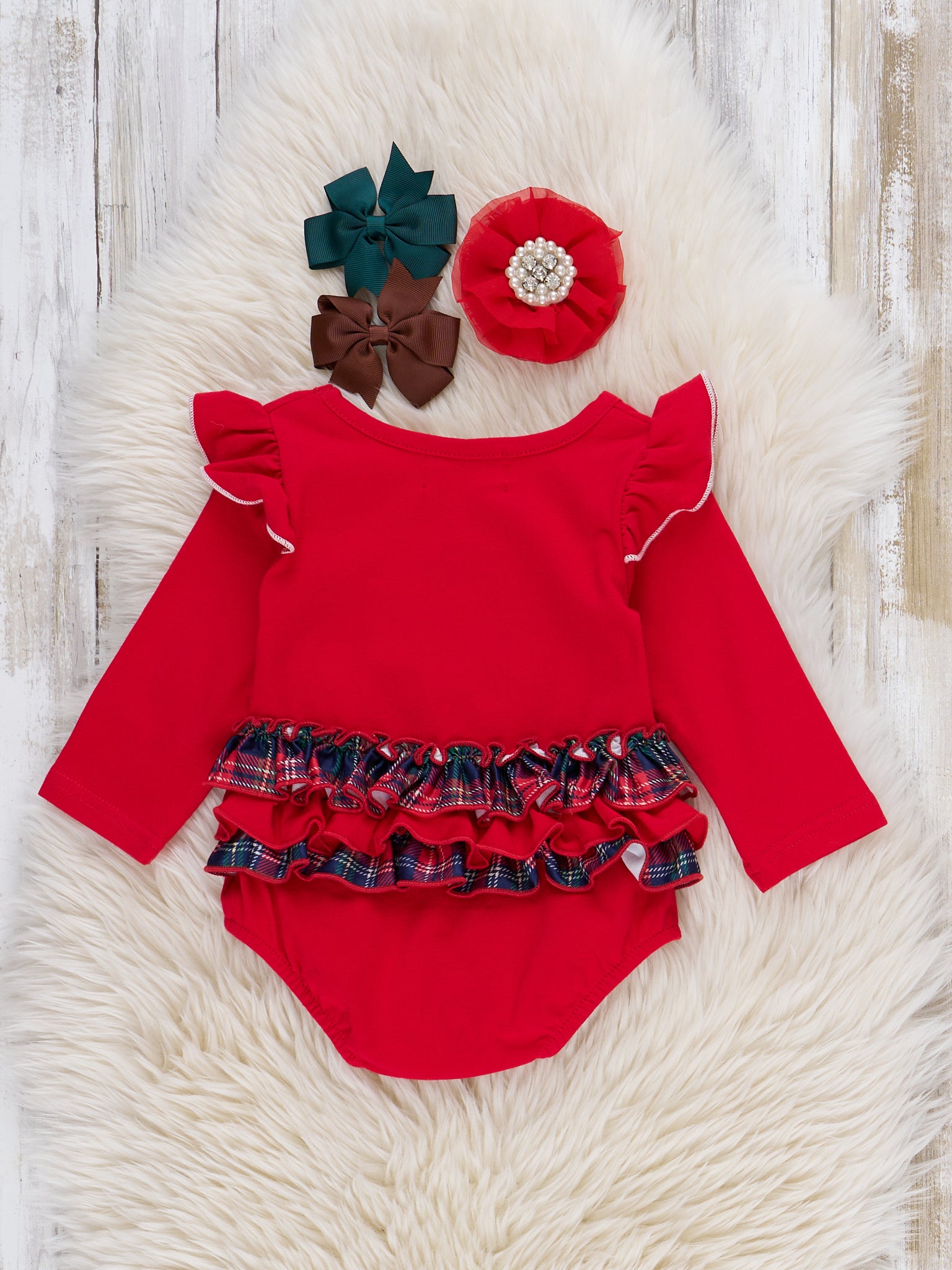 The Big Red Nose Rudolph Ruffle Embroidered Bubble glows like Rudolph's nose! Bright red paired with tartan details, this one-piece is adorably festive for the holidays with its embroidered reindeer and ruffled shoulders. Also made with soft, comfortable fabric, your little girl will love this bubble romper during the winter days and Christmas time.