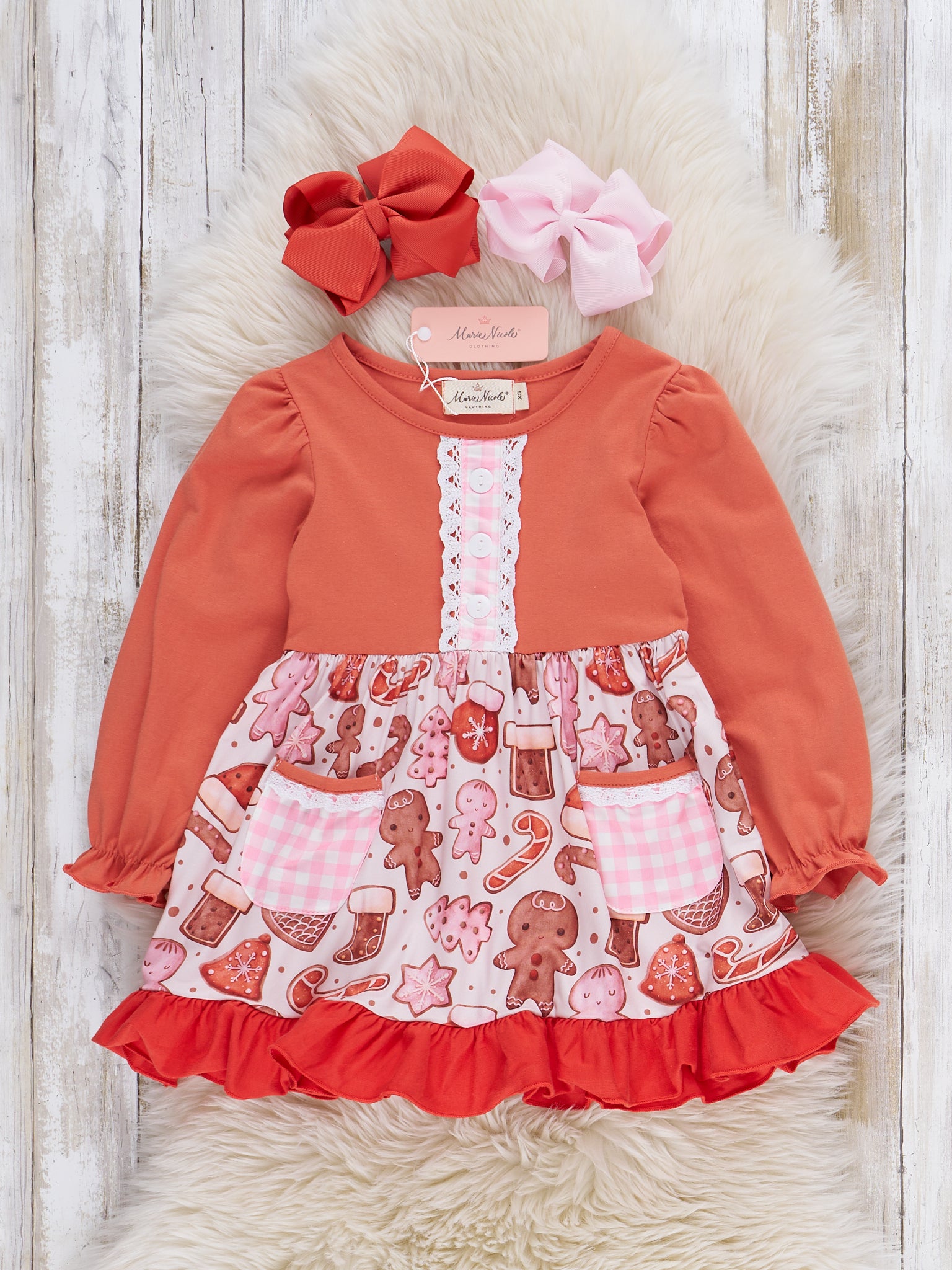 The Christmas Bakery Bubble Dress by Marie Nicole Clothing is for the sweethearts that love sweets! This quaint, cottagecore-style piece evokes the joy of making, enjoying, and sharing desserts during this holiday season, all while being dressed for comfort. Whether she is helping bake or munching, your little girl will be cute and fashionable while doing it!