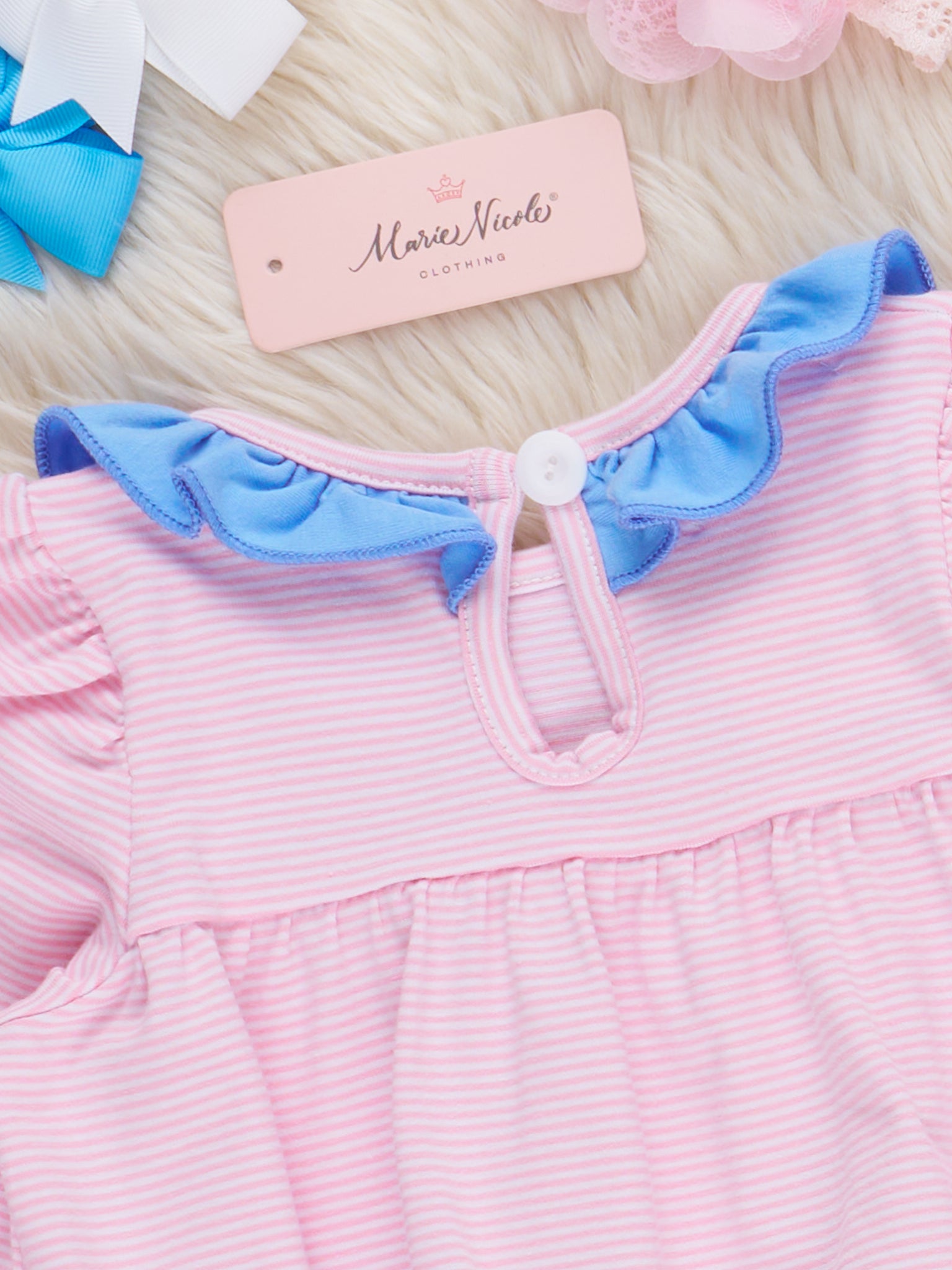 The Dreaming Santa Embroidered Bubble by Marie Nicole features a long-sleeve silhouette with cheerful Santa embroidery on the front pockets, a sweet ruffle neckline, and gently gathered sleeves. Designed with easy snap closures, this bubble offers both adorable holiday charm and comfortable everyday style.