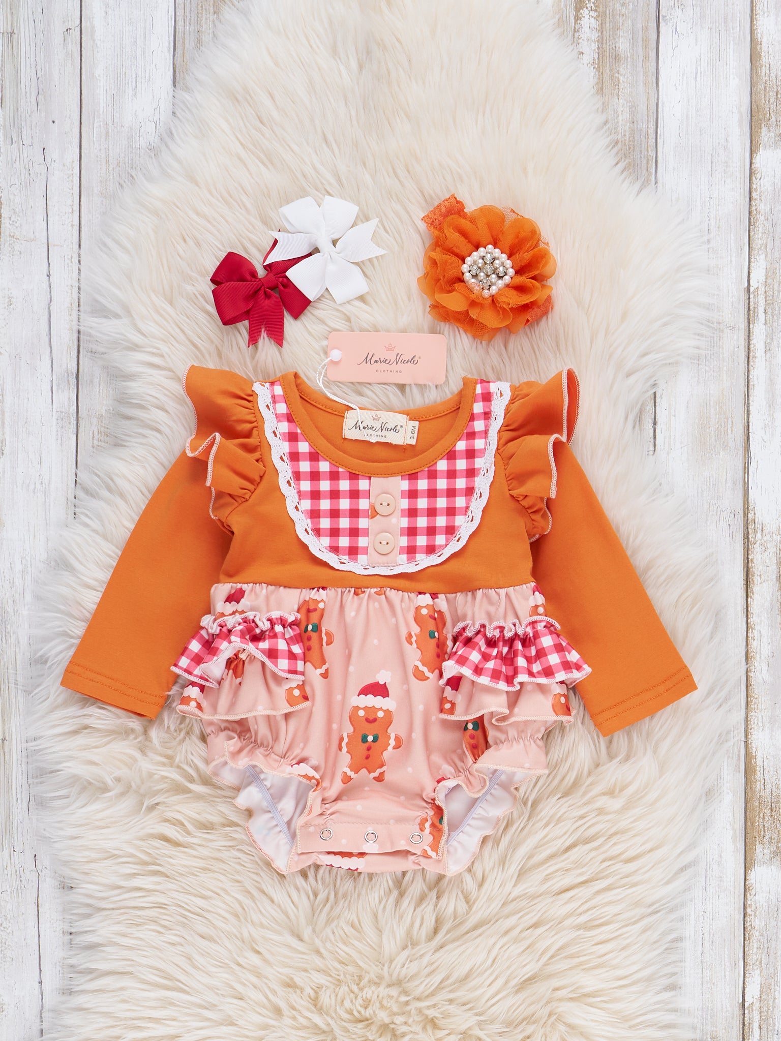 The Gingerbread Delight Plaid Ruffle Bubble is festively styled for the holiday season, featuring playful ruffle accents and delightful plaid trimming with gingerbread-inspired detailing. Crafted by Marie Nicole Clothing, this bubble is designed for easy movement and cheerful comfort, making it ideal for creating adorable holiday memories at family gatherings or seasonal events.
