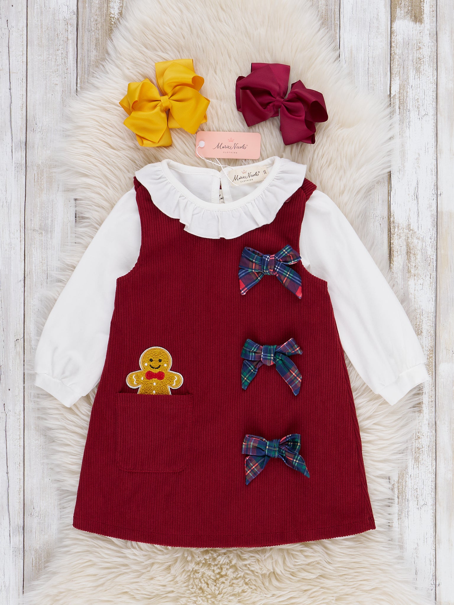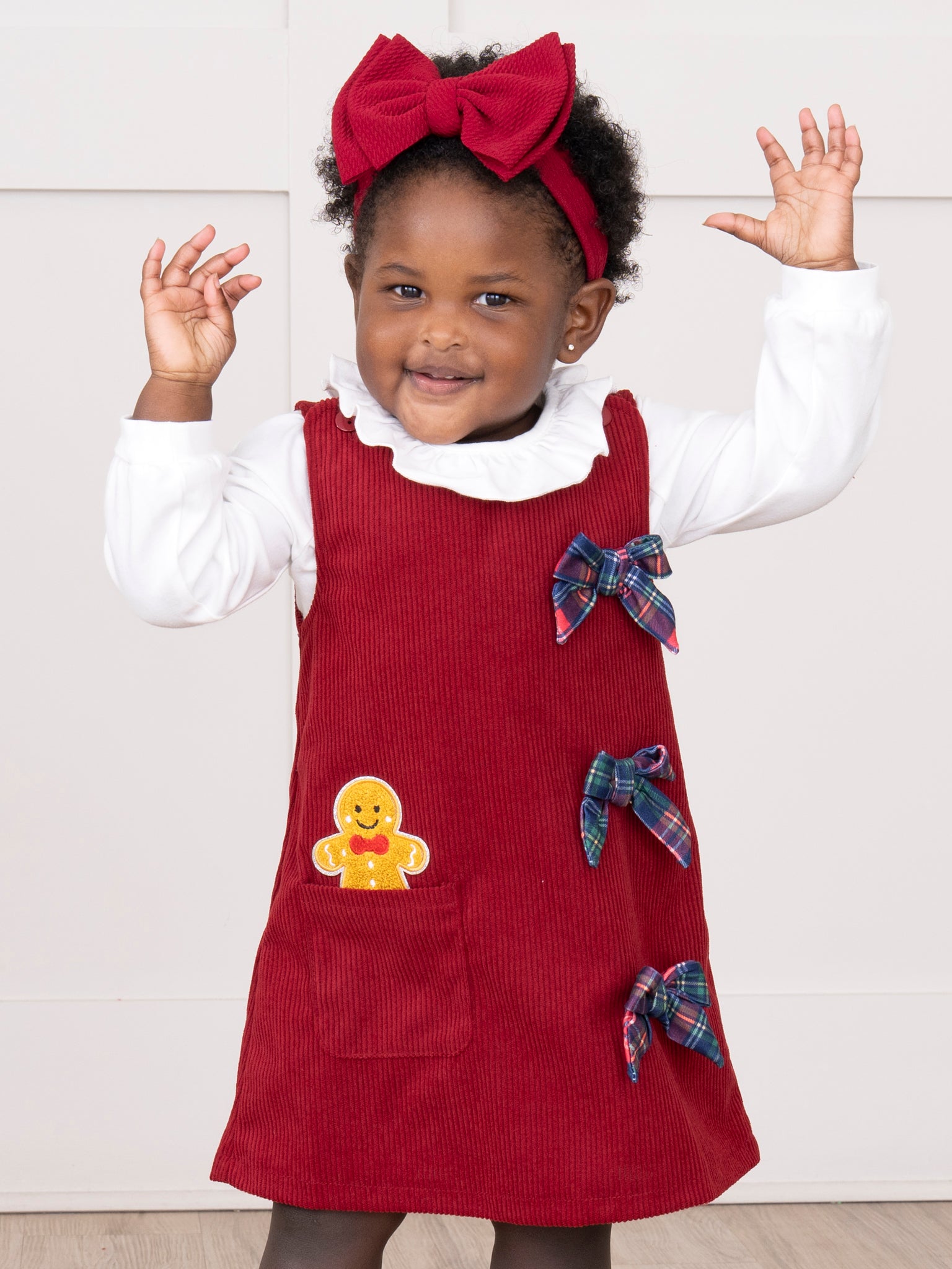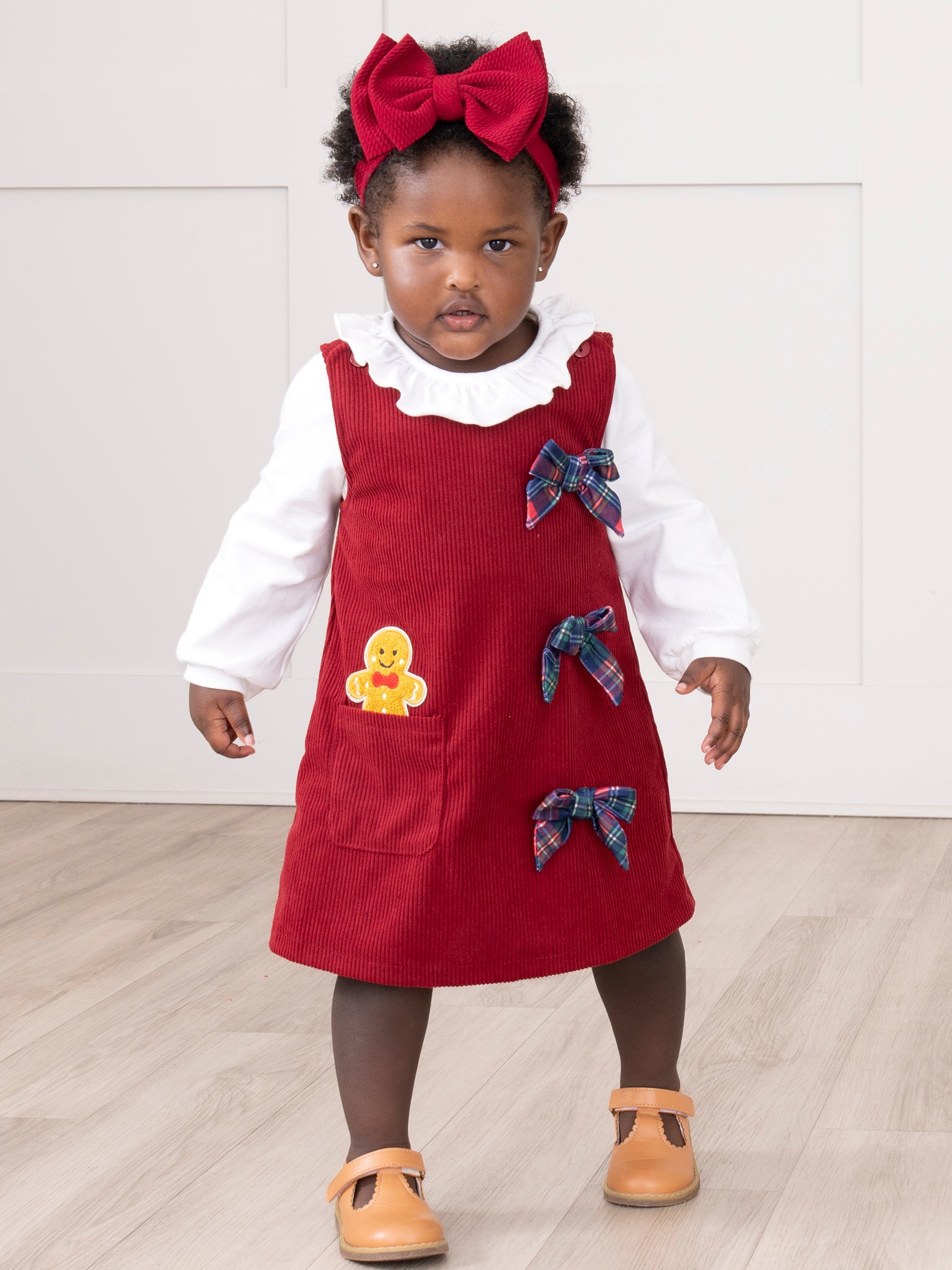 The Gingerbread Peak-a-boo Skirtall Outfit is a festive ensemble that brings sweet holiday charm, featuring adorable plaid bows and a gingerbread patch, sitting in the pocket. With its playful details and cozy style, this overall dress set by Marie Nicole Clothing is perfect for winter celebrations, seasonal photos, or baking gingerbread cookies with loved ones.
