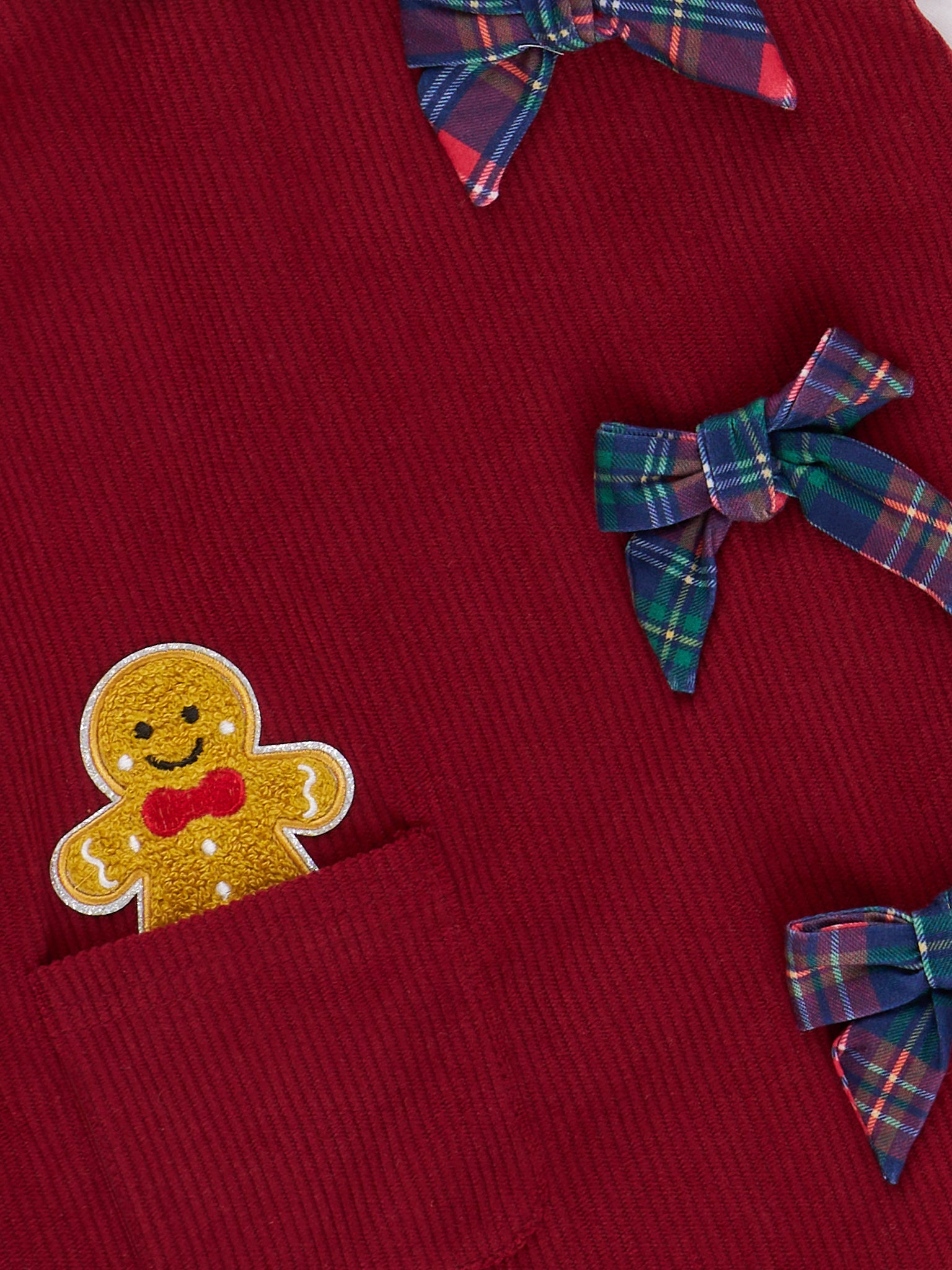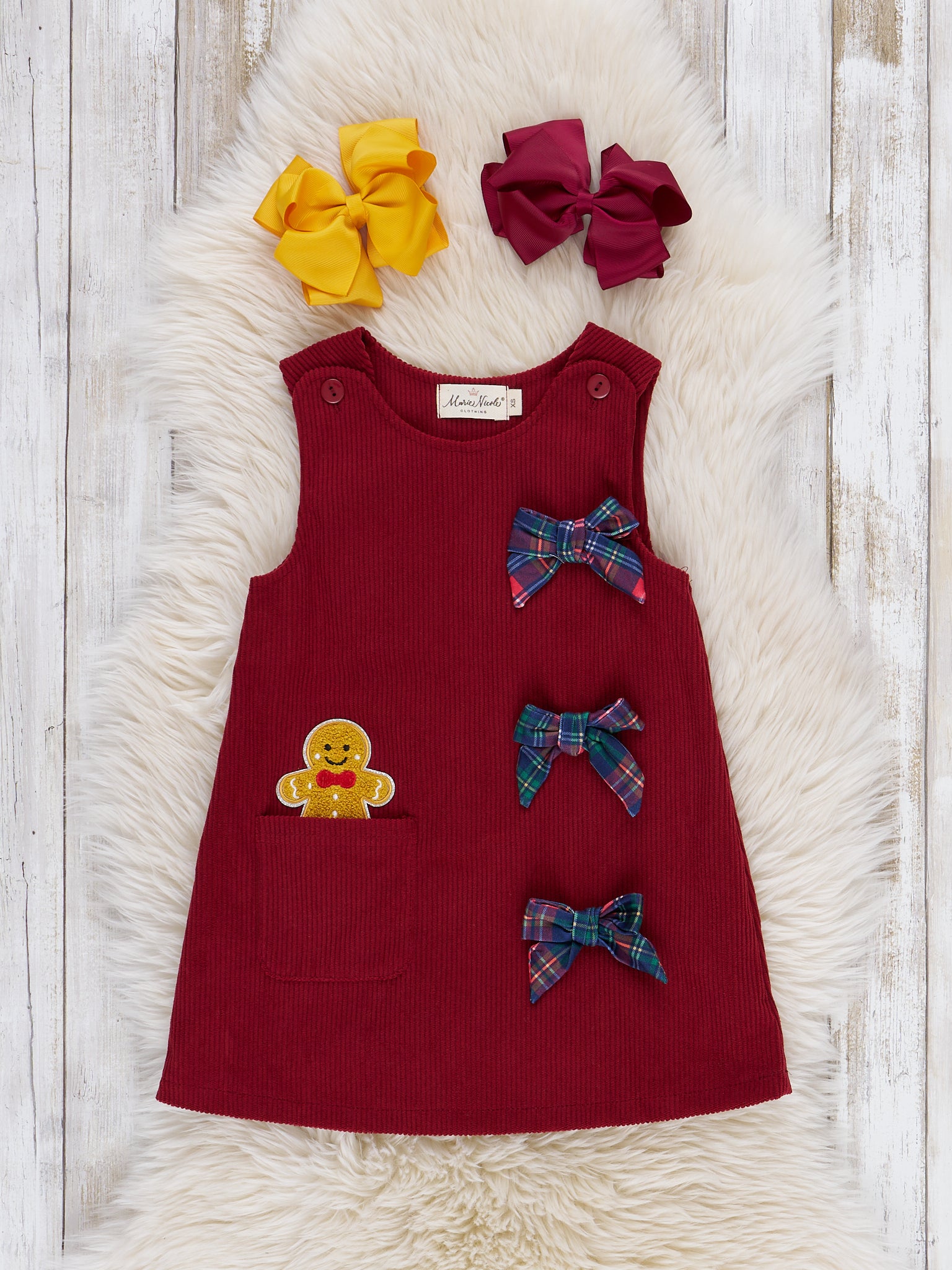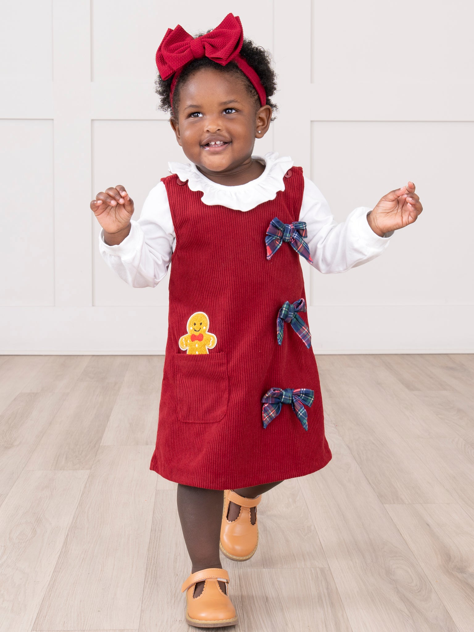 The Gingerbread Peak-a-boo Skirtall Outfit is a festive ensemble that brings sweet holiday charm, featuring adorable plaid bows and a gingerbread patch, sitting in the pocket. With its playful details and cozy style, this overall dress set by Marie Nicole Clothing is perfect for winter celebrations, seasonal photos, or baking gingerbread cookies with loved ones.