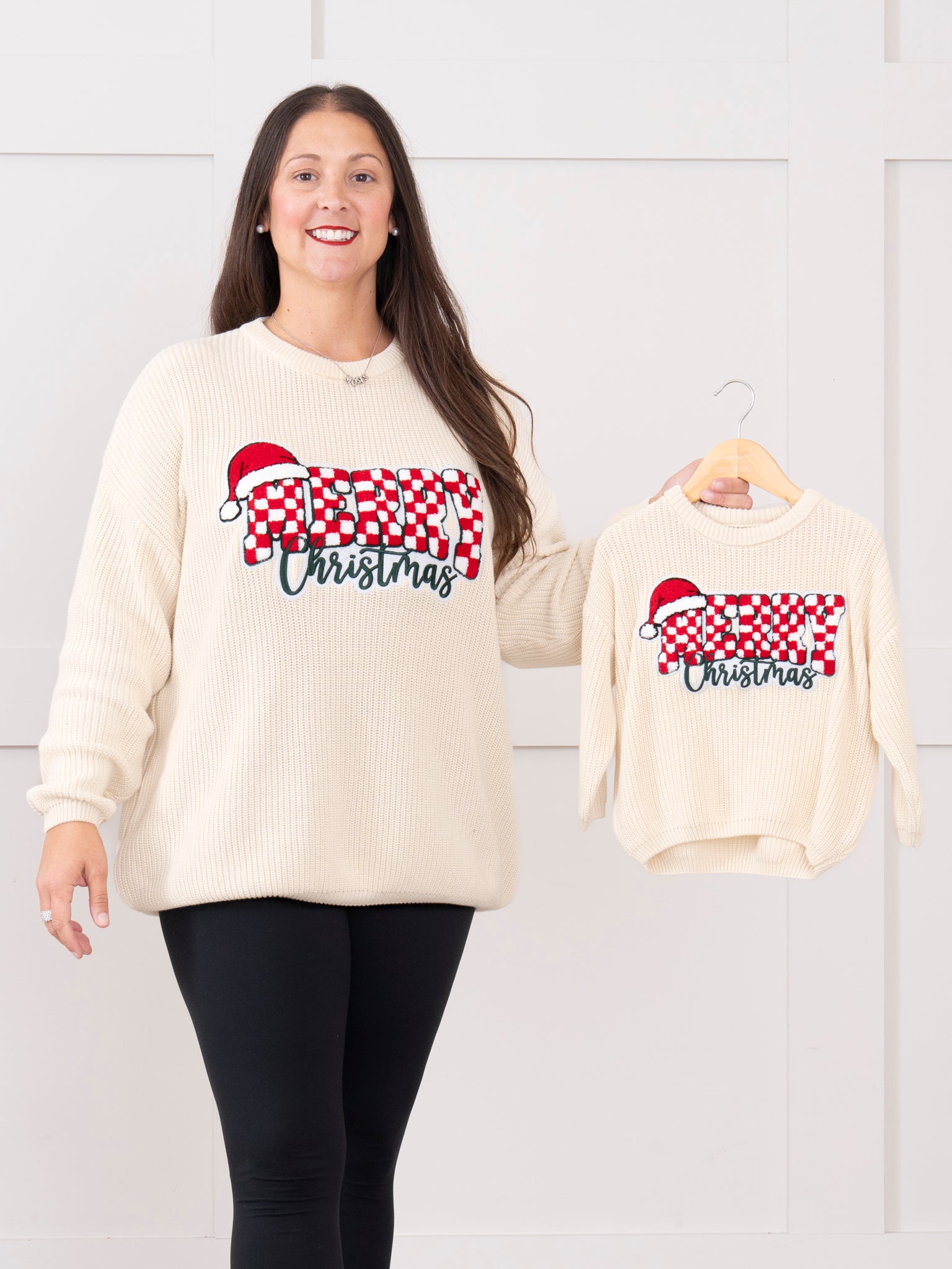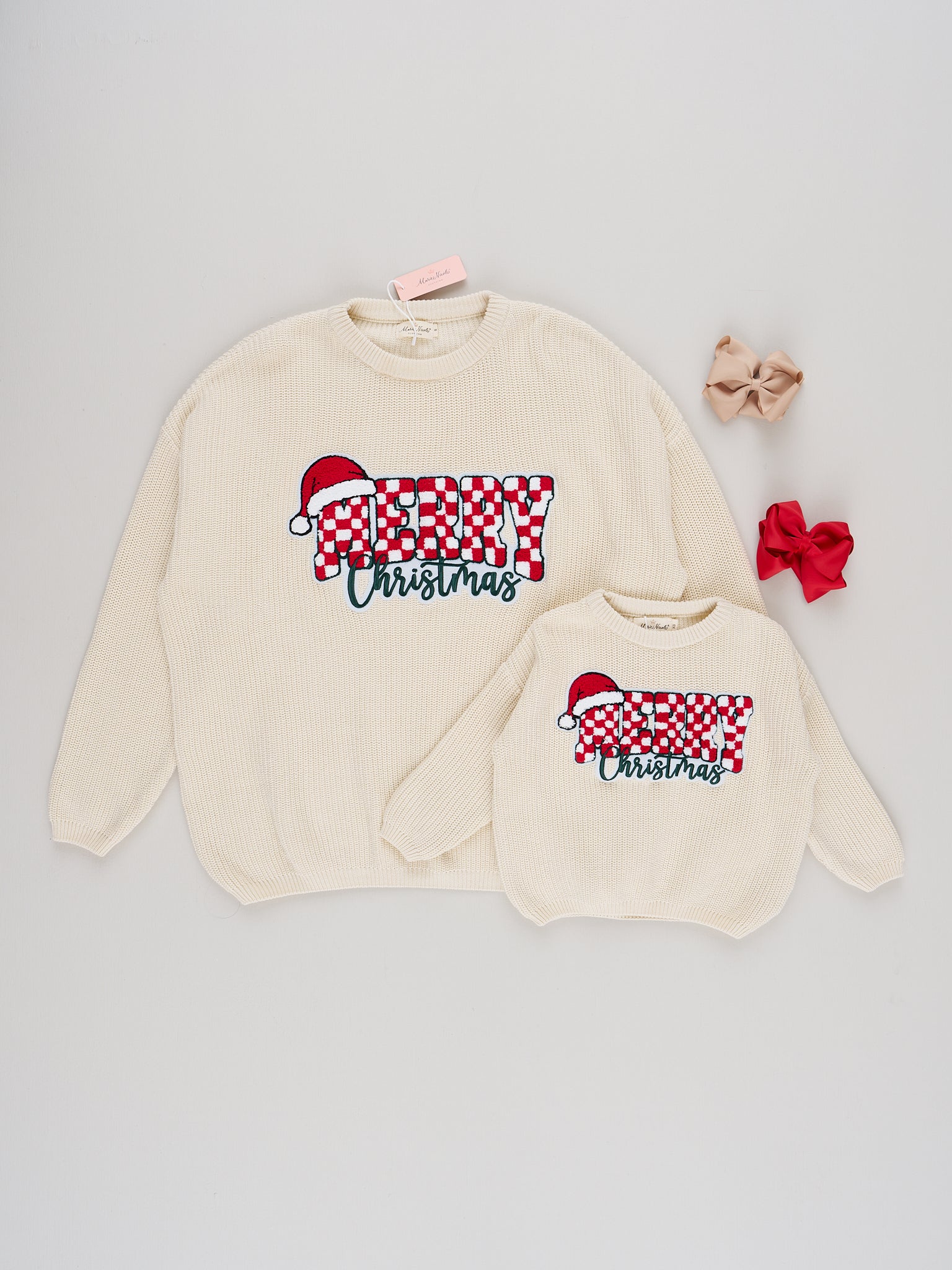 The "Merry Christmas" Checkered Oversized Sweater is a cozy holiday classic, featuring bold, checkered lettering with festive patterns and a Santa hat detail for extra cheer. Soft and comfortable, this sweater from Marie Nicole Clothing is perfect for Christmas gatherings, holiday photos, and keeping your little one warm in seasonal style.