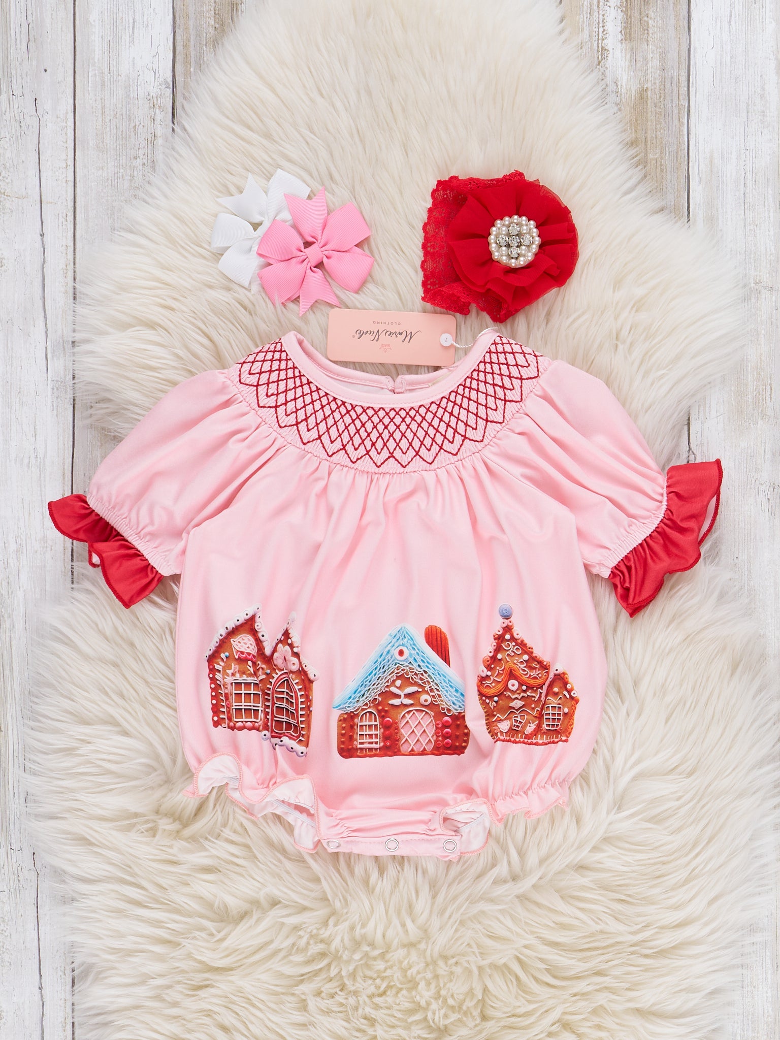 Pink & Red Smocked Gingerbread House Ruffle Bubble
