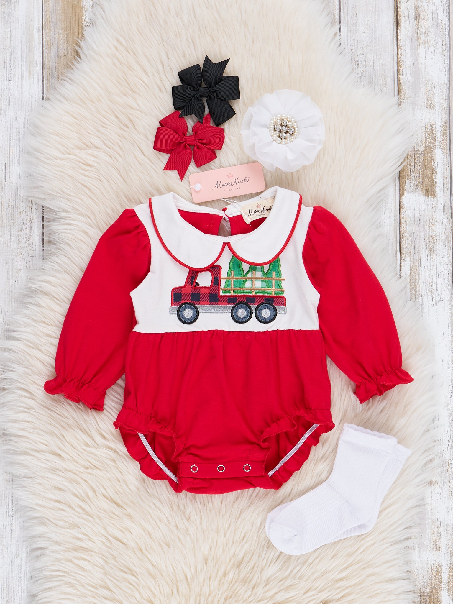 Red Embroidered Christmas Tree Truck Ruffle Bubble