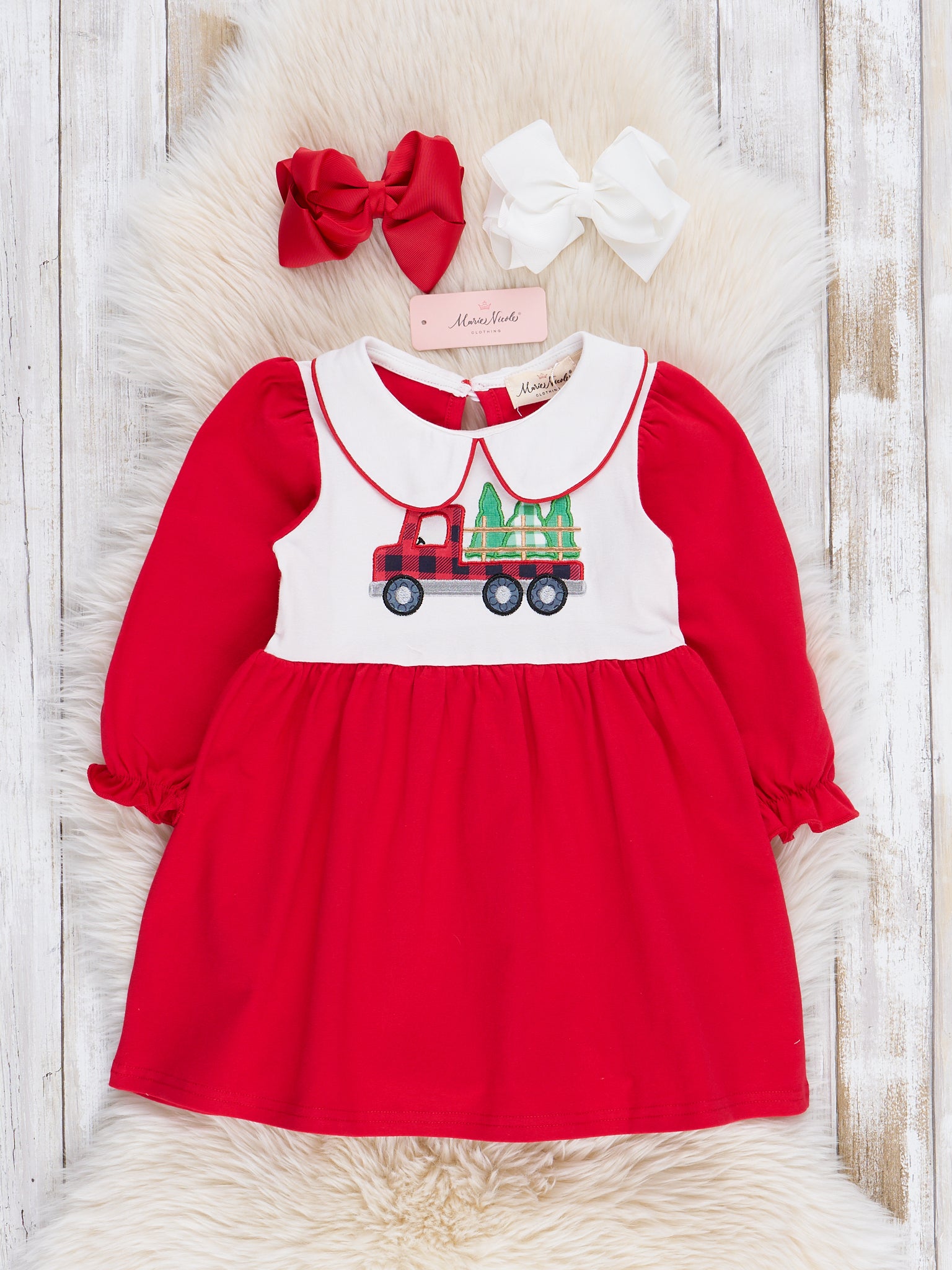 Red Embroidered Christmas Tree Truck Ruffle Dress