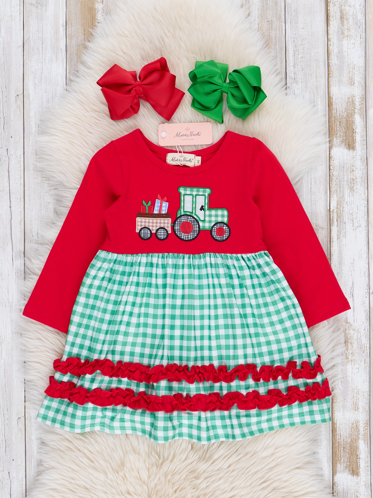 Red & Green Gingham Embroidered Holiday Tractor Ruffle Dress