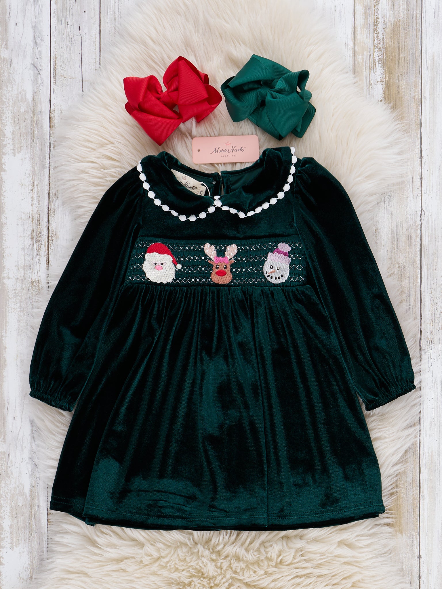 Warm and cozy! The Christmas Buddies Smocked Velvet Dress by Marie Nicole Clothing is a elegantly charming piece for the winter season. An embroidered Santa, Rudolph, and a friendly snowman accompany your little one on the smocked bodice. Crafted with comforting, soft velvet and a snowball peter-pan collar, you don't want to miss out on this dress for your little girl's holiday wardrobe!