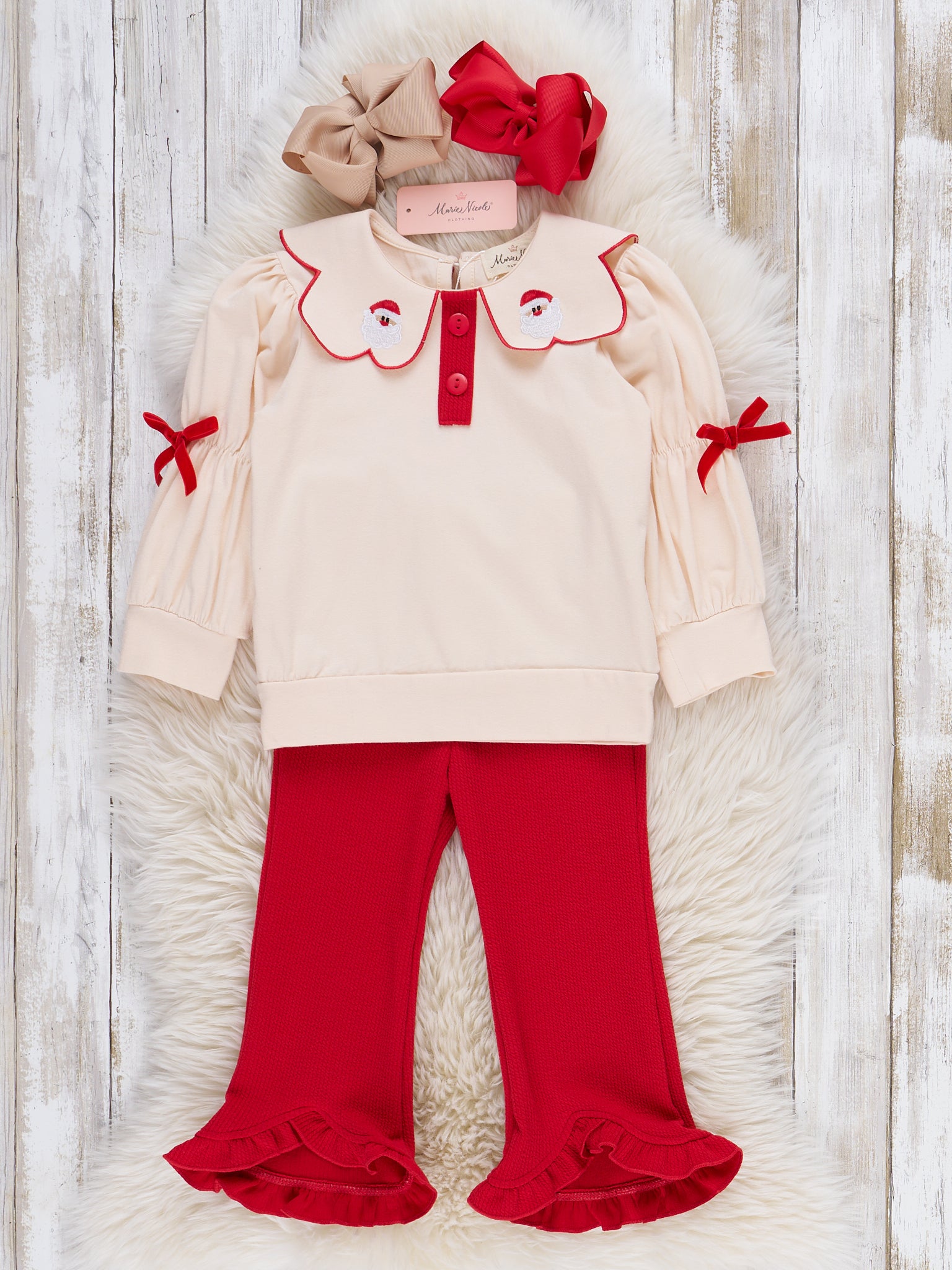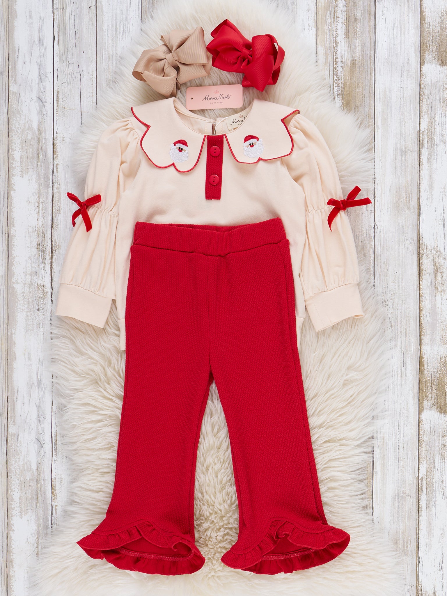 Join Santa's nice list! The Santa's Helper Embroidered Ruffle Outfit is a holiday two-piece set with a unique, flowery collar and ruffle-bottom pants. Tiny, little Santa's are embroidered on the collar to watch over your little girl, and bows on the elbow add a charming accent. Designed with soft fabric, this outfit is perfect for any Christmas photos or occasions!