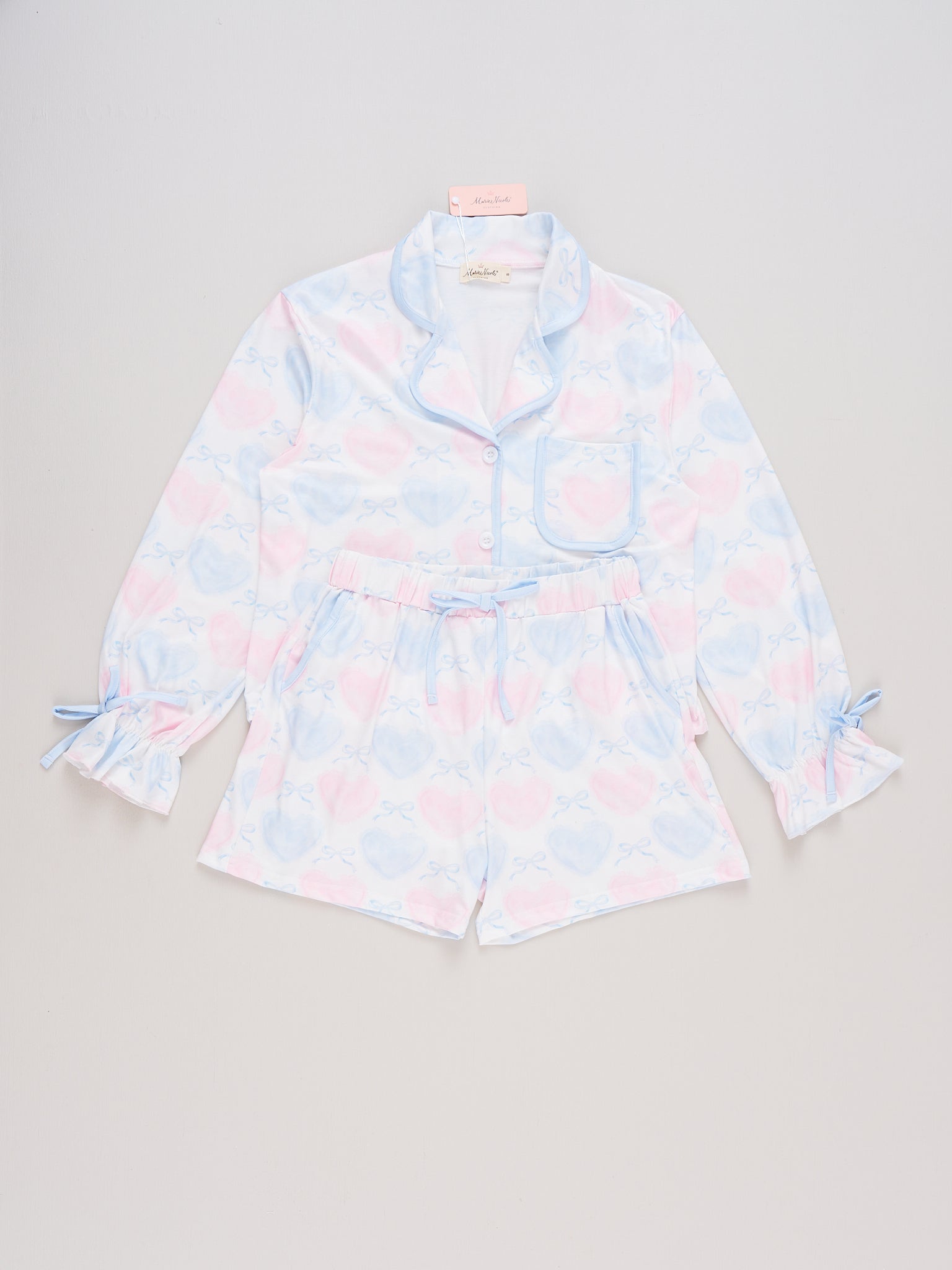 Snuggle up in style with the Mom & Me Dreamy Hearts Cropped Pajamas for mom by Marie Nicole Clothing. Covered in a lovely heart pattern, this silky-soft set features a button-down top and comfy elastic-waist shorts, crafted to add warmth and a hint of fun to cozy family nights. Perfect for creating sweet memories with every matching moment.