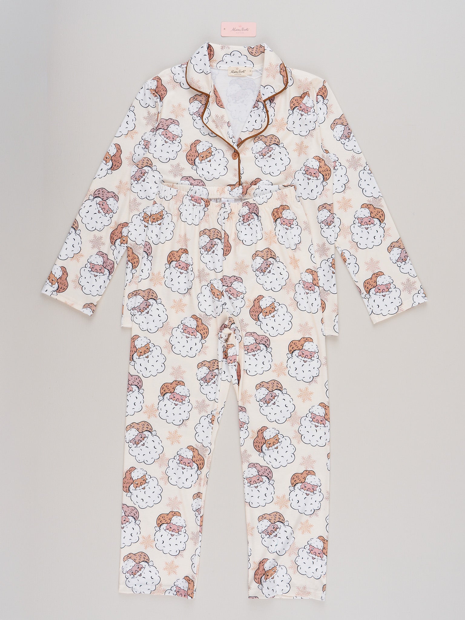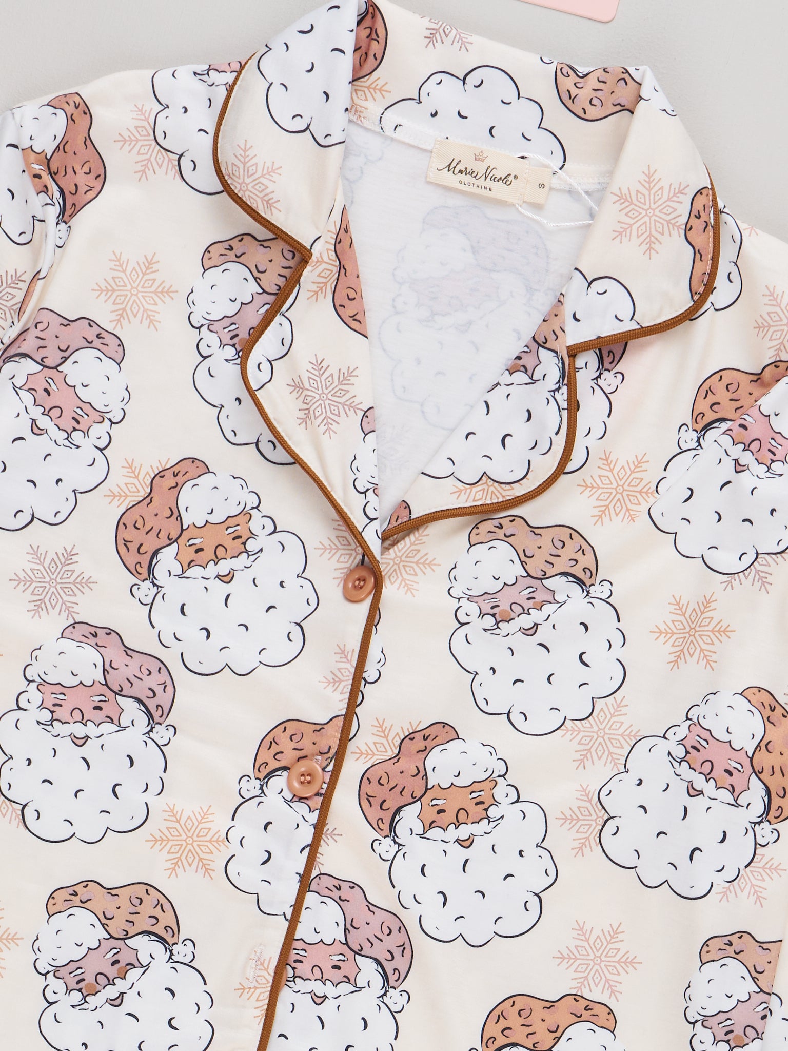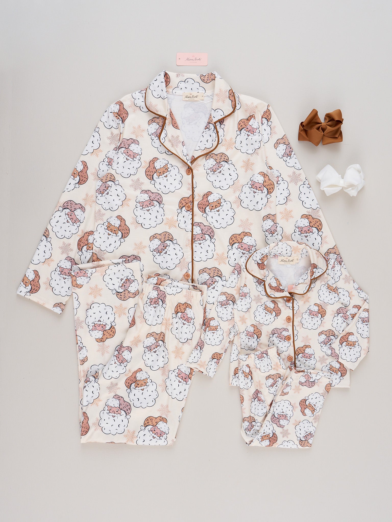 The Mom & Me Santa Snow Cloud Pajamas by Marie Nicole features a classic collared long-sleeve top paired with matching pants, both adorned in an adorable allover print of fluffy bearded Santas and snowflakes. Designed for holiday dreams and winter charm, this two-piece pajama set brings a cozy Christmas theme to bedtime. This comes as a matching mother and daughter set as well!
