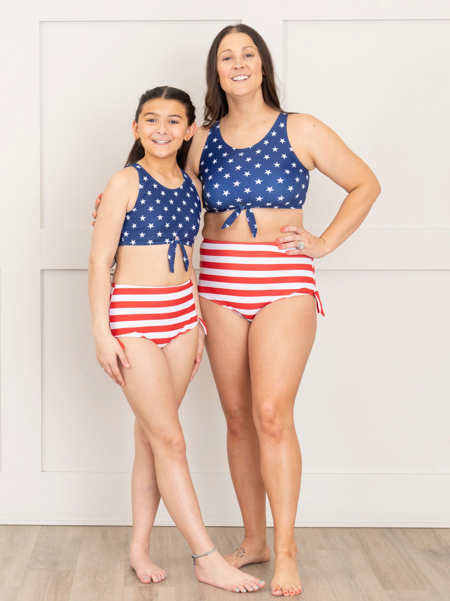 Make a splash this summer with the Mom & Me Stars Stripes Tie Swimsuit from Marie Nicole Clothing. This adorable Mom & Me set features a blue stars tie tank-style top and patriotic stripes high waist bottom with a sweet bow detail. Perfect for soaking up the sun at the pool or beach.