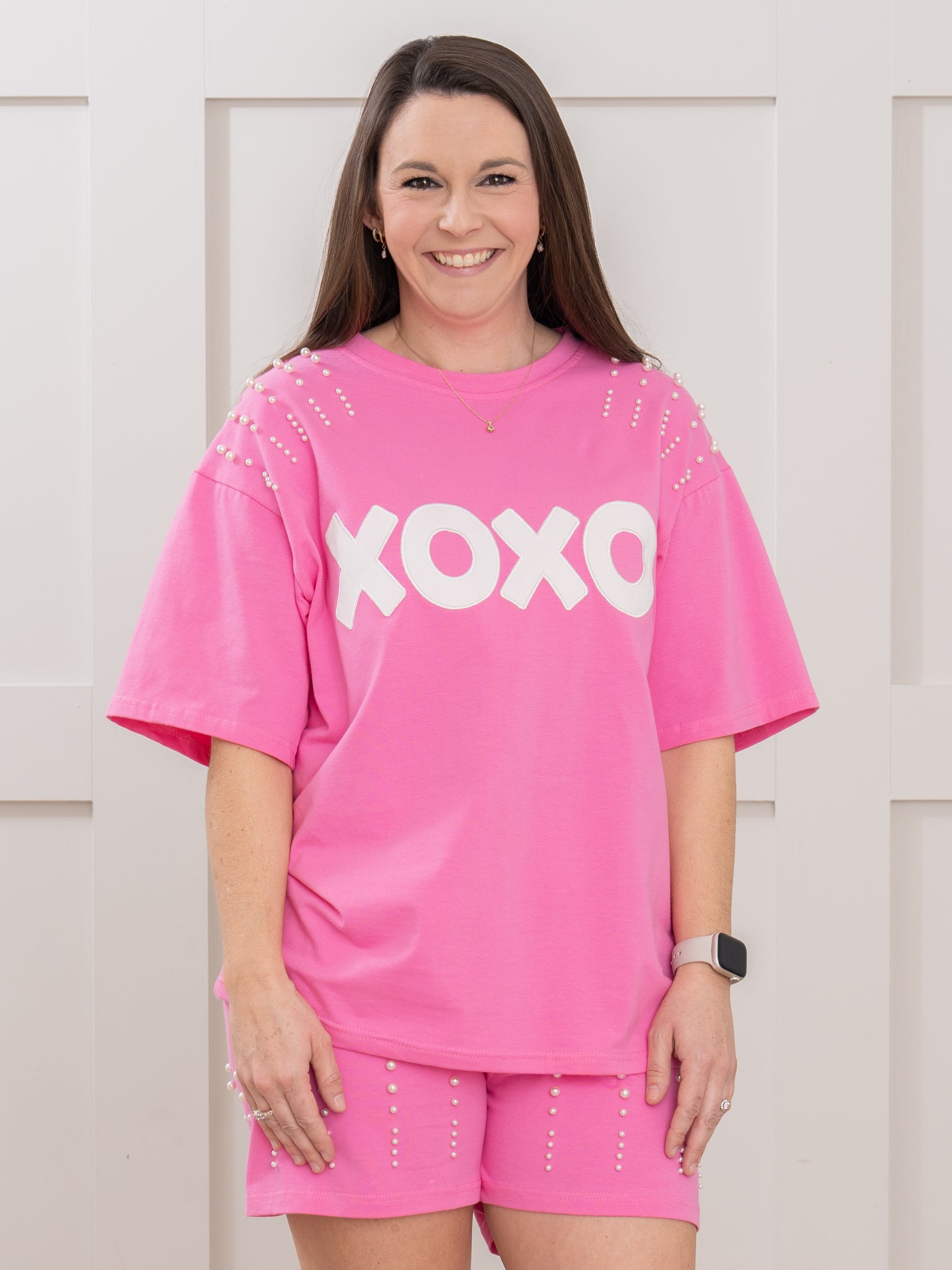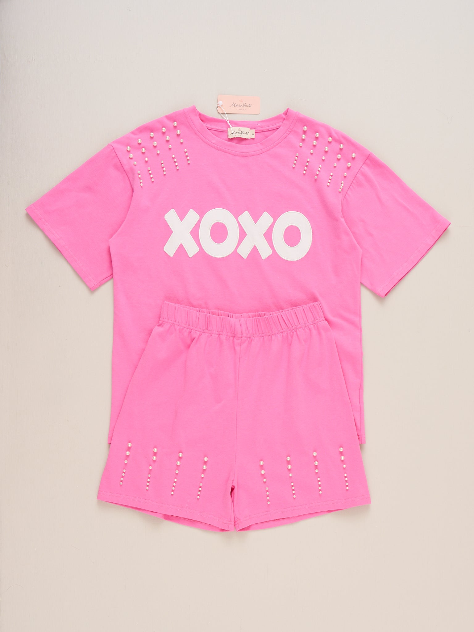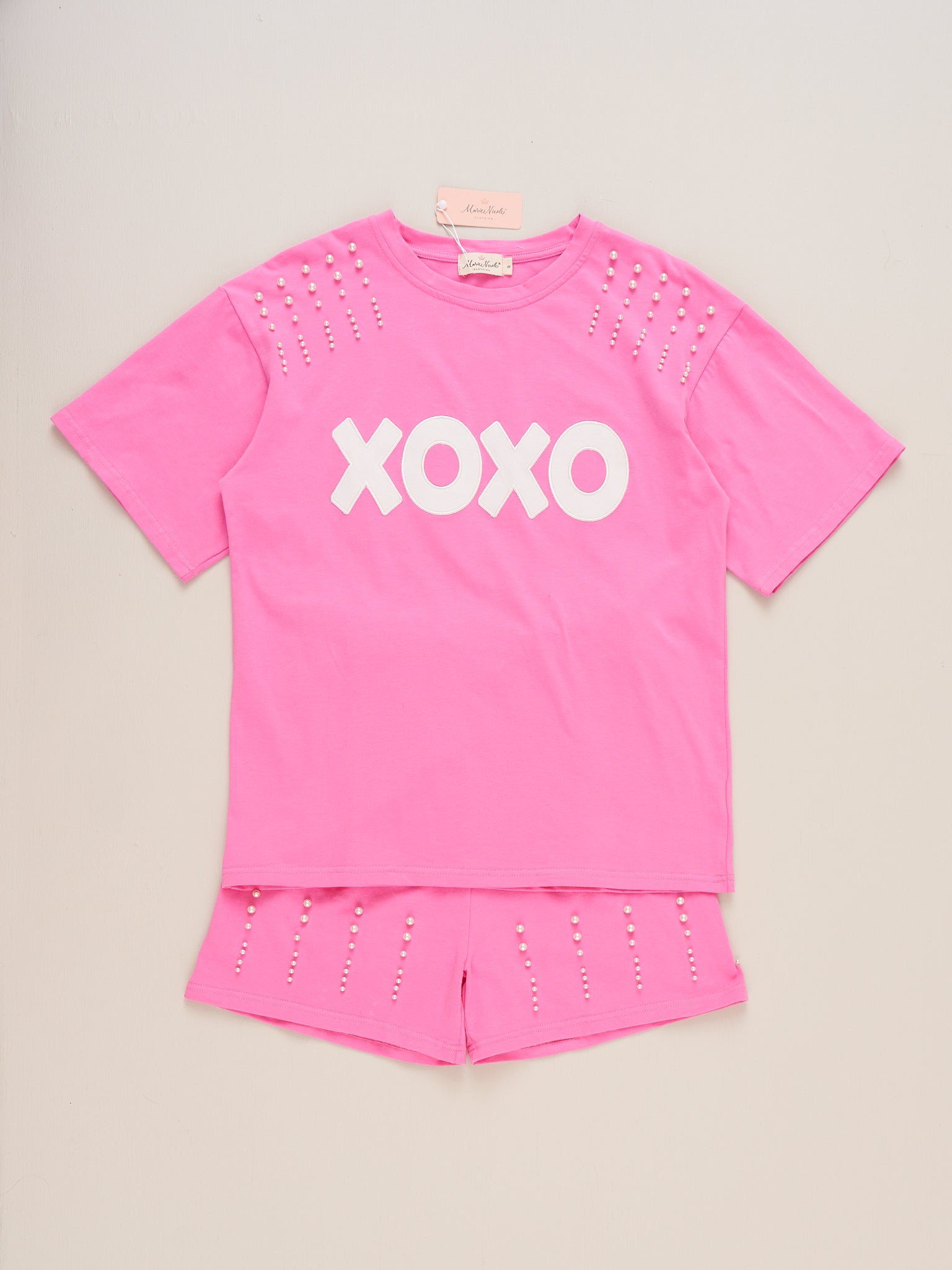 The Mom & Me XOXO Pearl Embroidered Outfit by Marie Nicole Clothing is a comfy set for mom, featuring a playful "XOXO" embroidery across the top with beautiful pearl accents across the shoulders. Designed for shared moments and coordinated style, this set is perfect for matching with your little one.