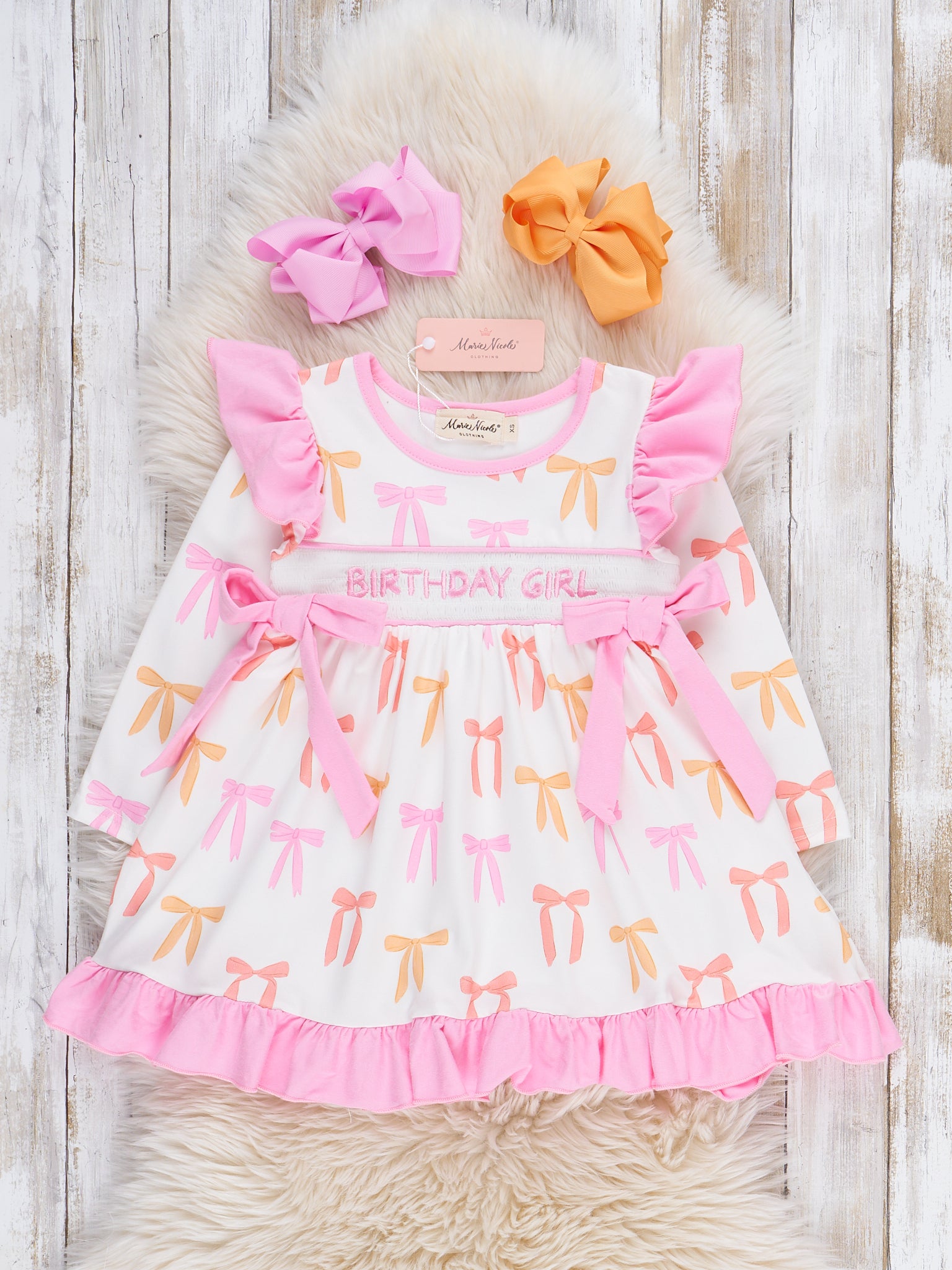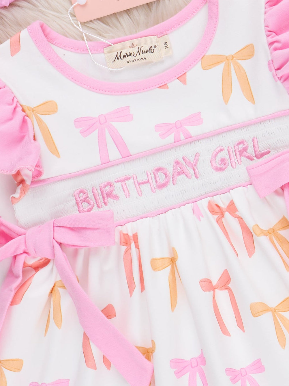 The Bow-tiful Birthday Girl Smocked Dress by Marie Nicole features an all-over bow print, ruffled shoulder details, and a smocked chest with "Birthday Girl" embroidery. With a twirly ruffle hem and pretty waist ties, this dress is a charming and festive choice for celebrating a special birthday.