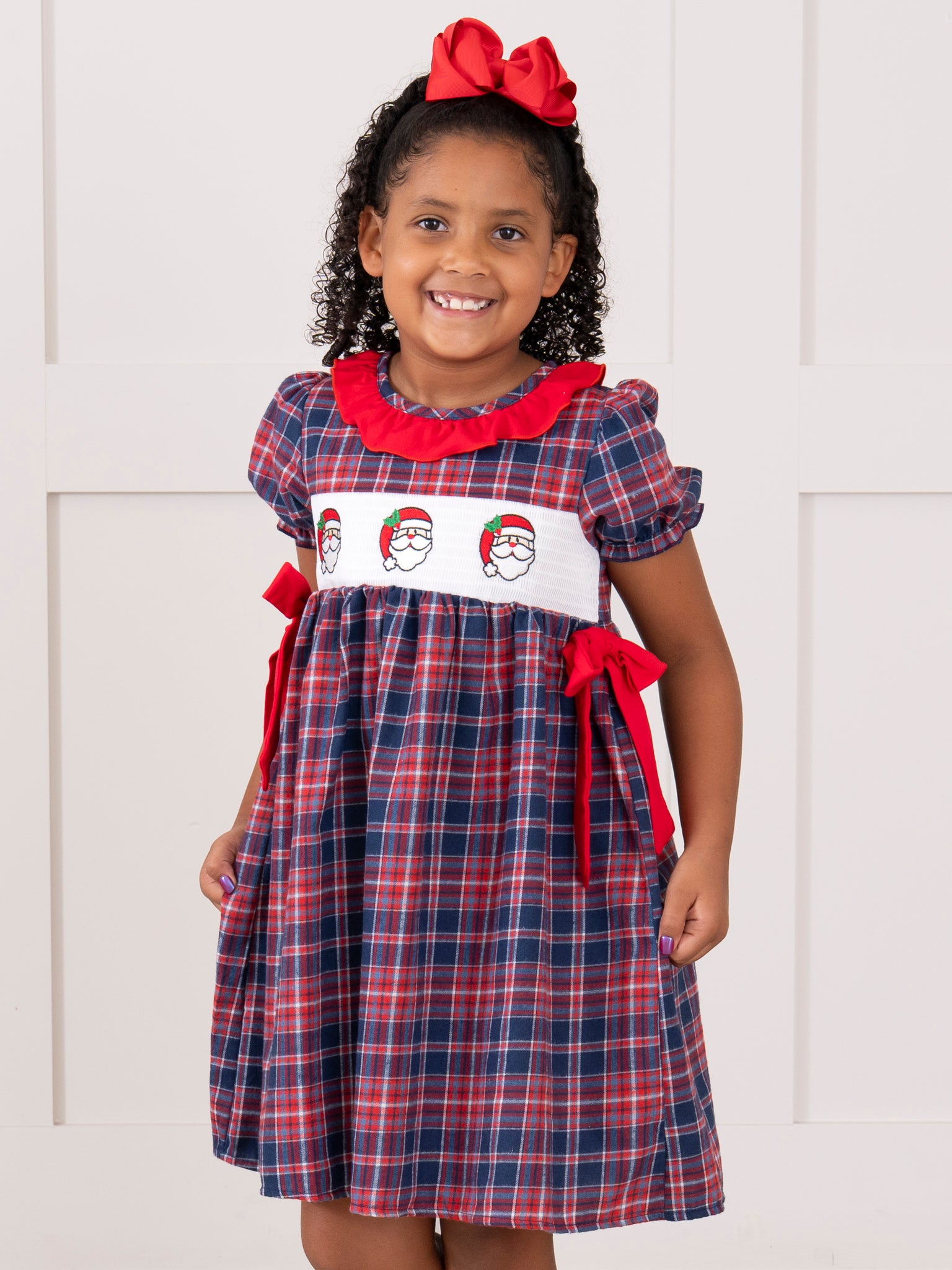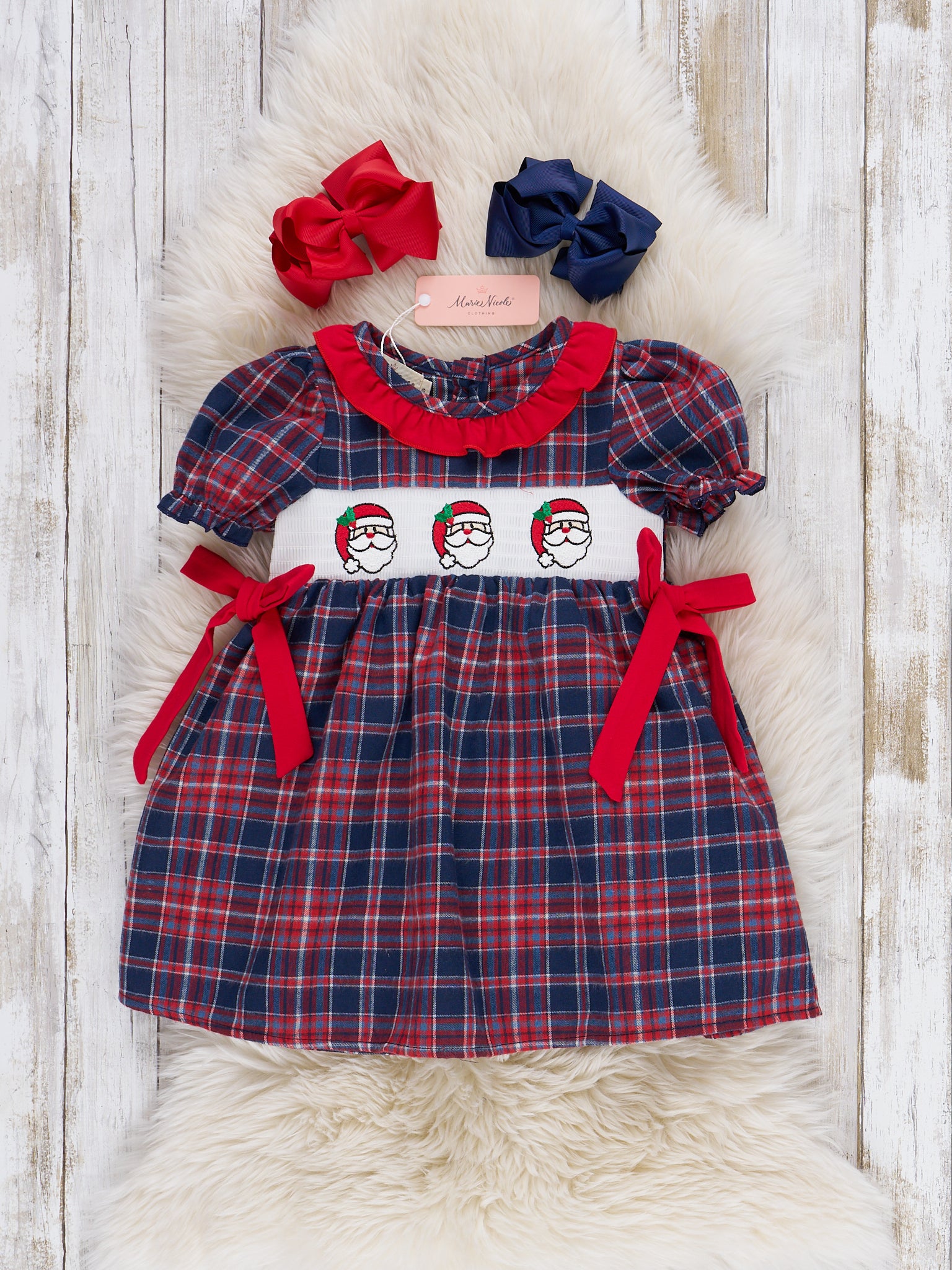 The Santa Spirit Smocked Ruffle Flannel Dress by Marie Nicole Clothing is a classic holiday dress crafted in flannel plaid, featuring Santa Claus smocking across the bodice and charming ruffle details. With puff sleeves and bright side ties, this dress captures traditional Christmas spirit—making it ideal for Santa visits, holiday events, and family portraits.