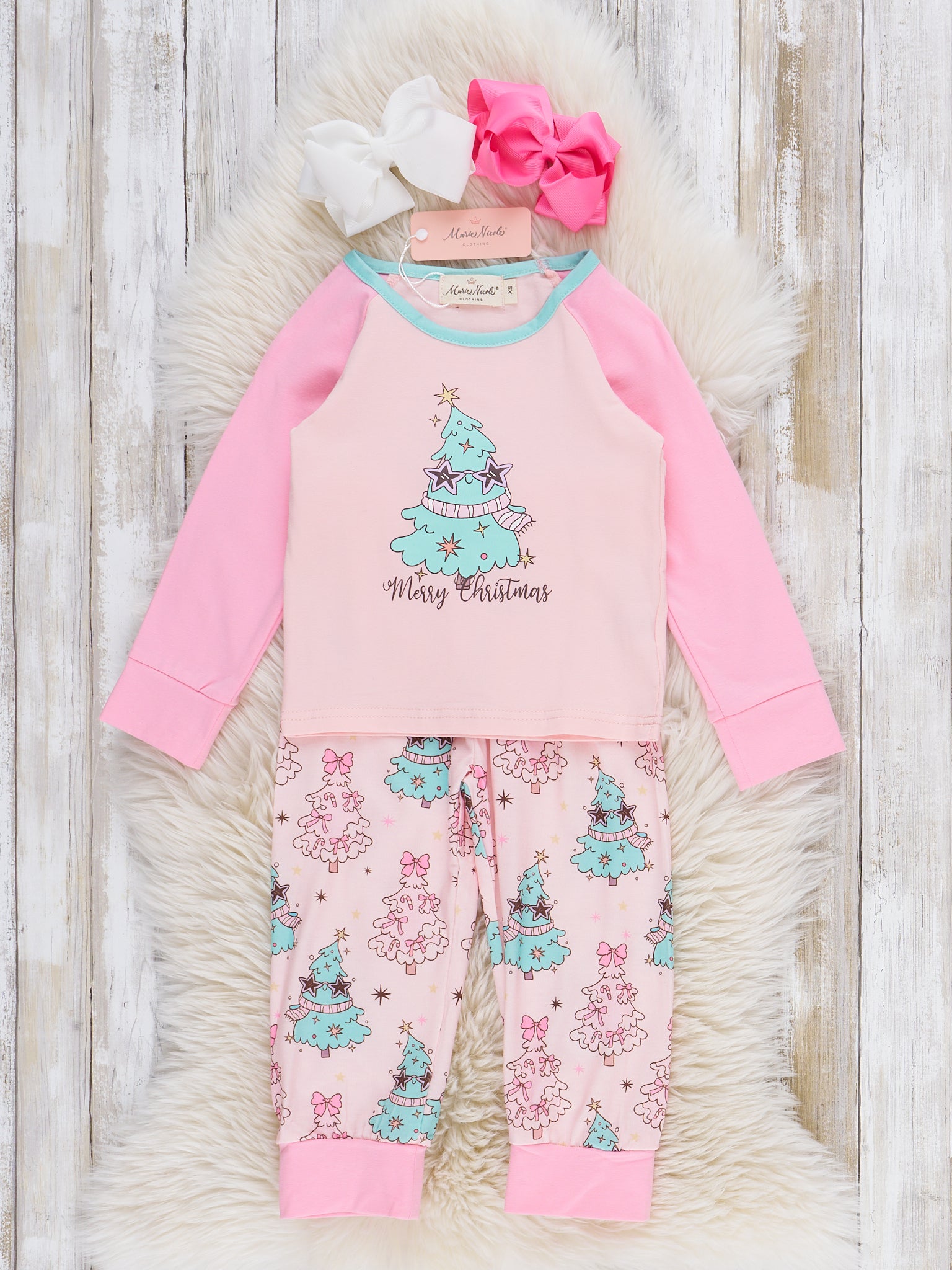 Soft Mint & Pink Christmas Trees Ruffle Outfit