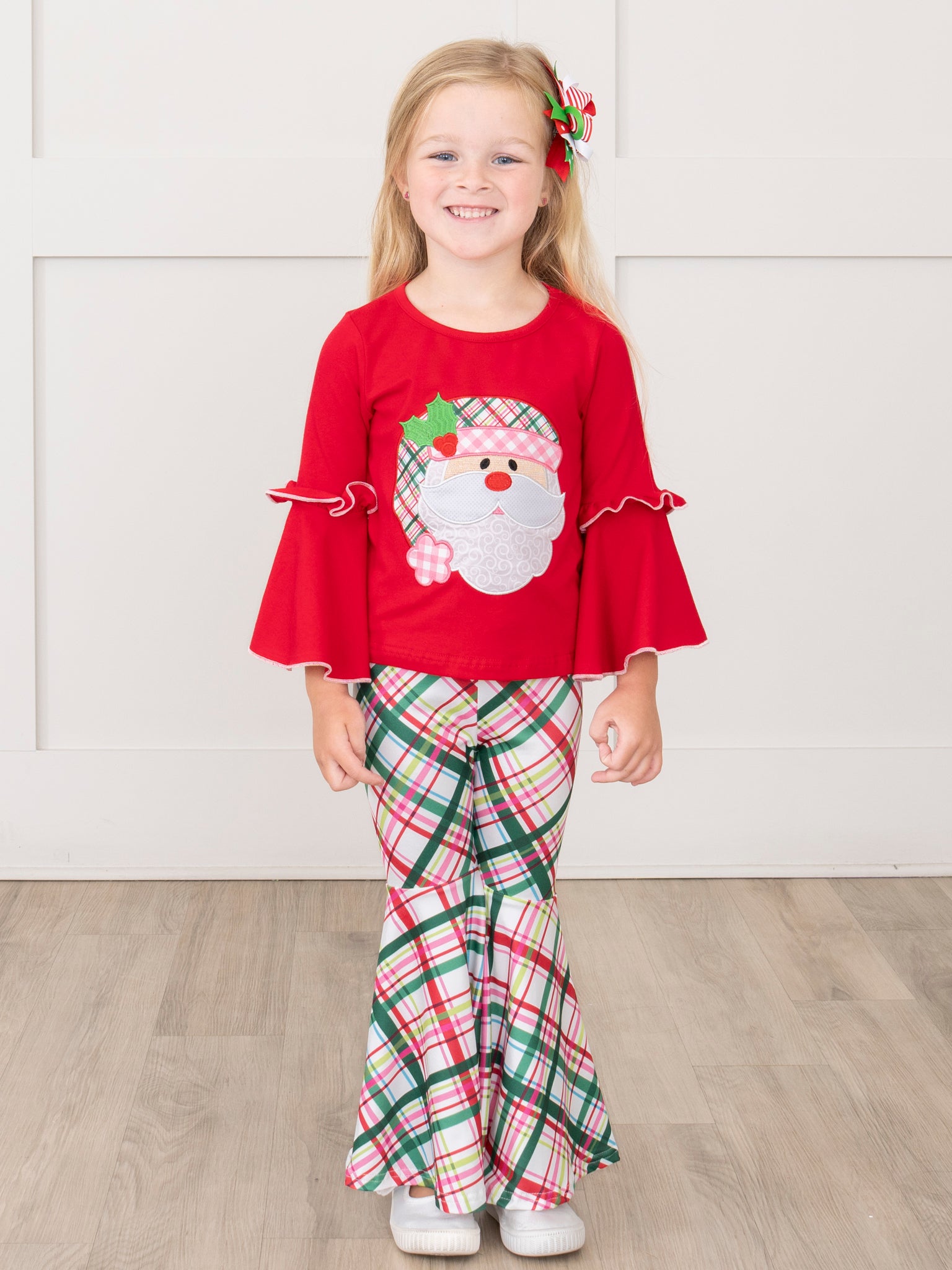 Pink & Red Santa Plaid Ruffle Bell Bottoms Outfit