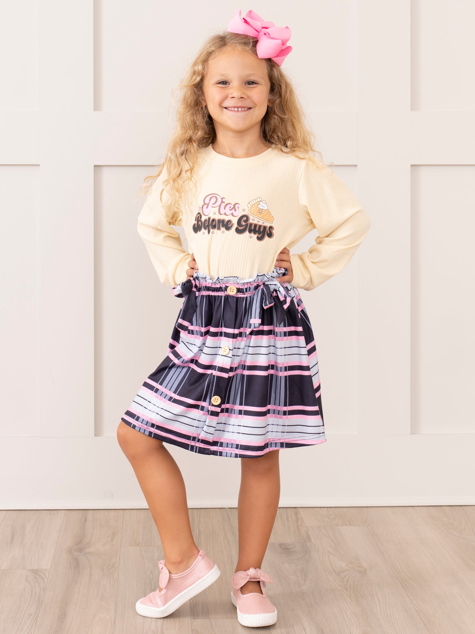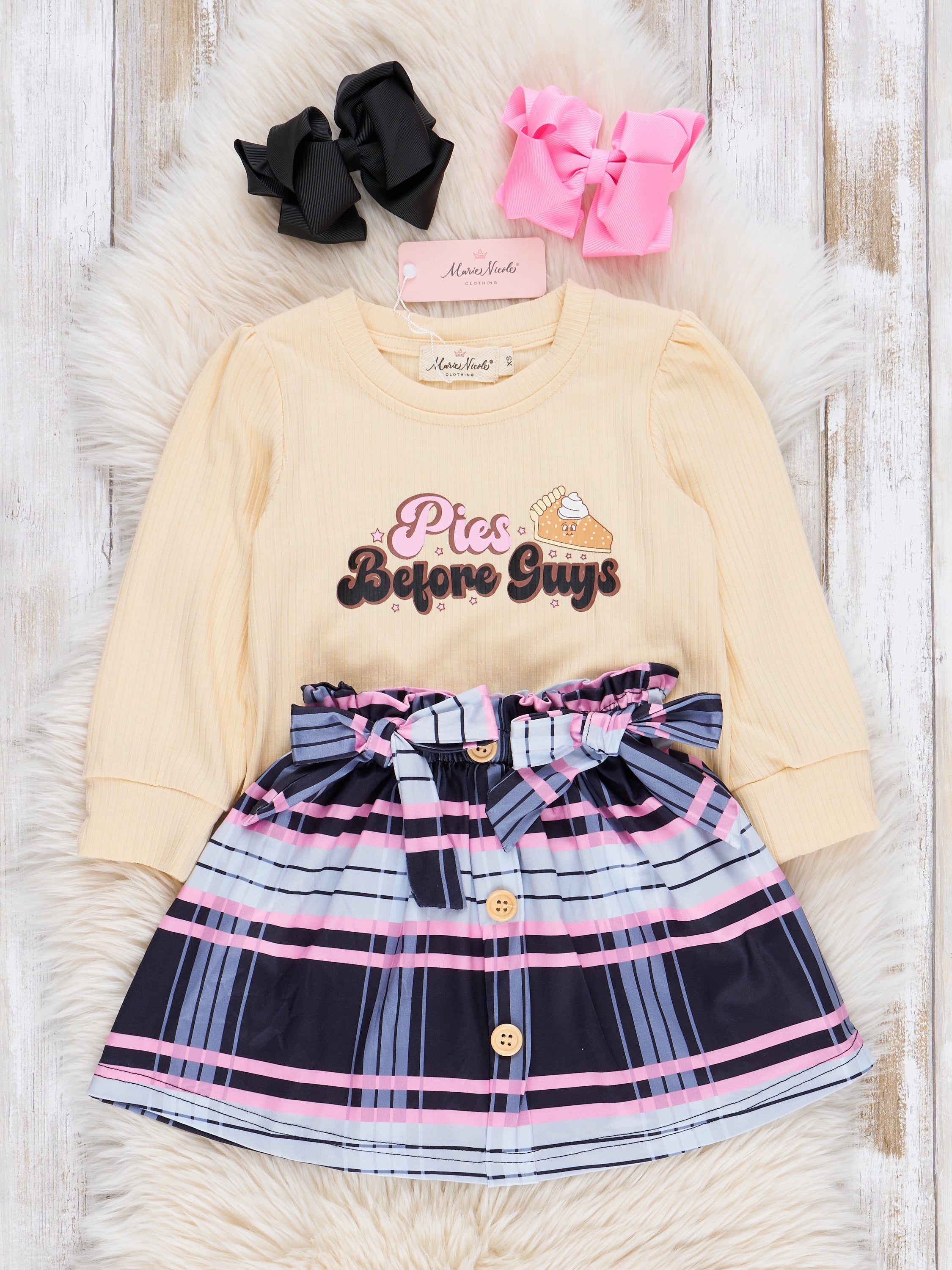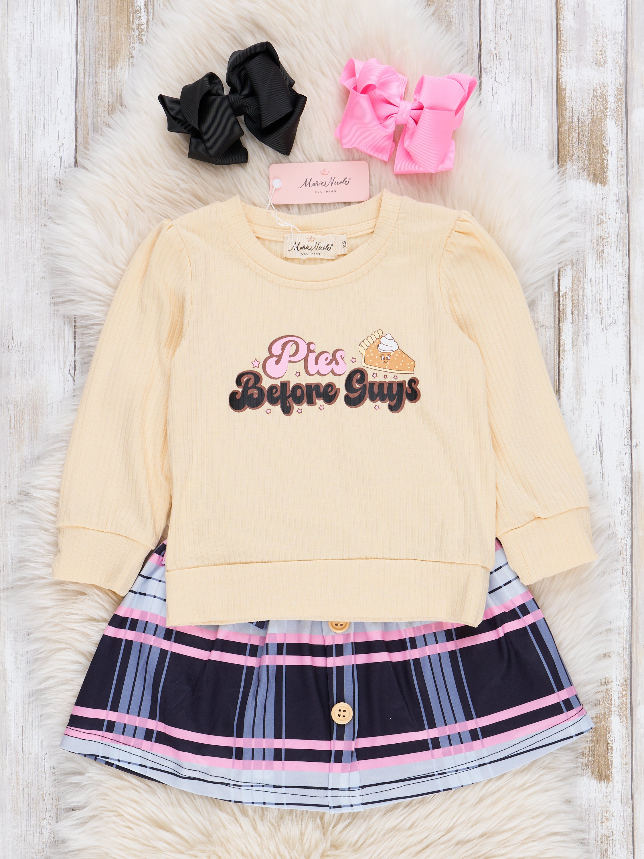 Get ready to slay this Thanksgiving with our "Pies Before Guys" Plaid Outfit! Made for girls who know the real holiday priority 😉 Includes a cozy flannel skirt for ultimate style and comfort. Say goodbye to boring outfits and hello to pie and fun!