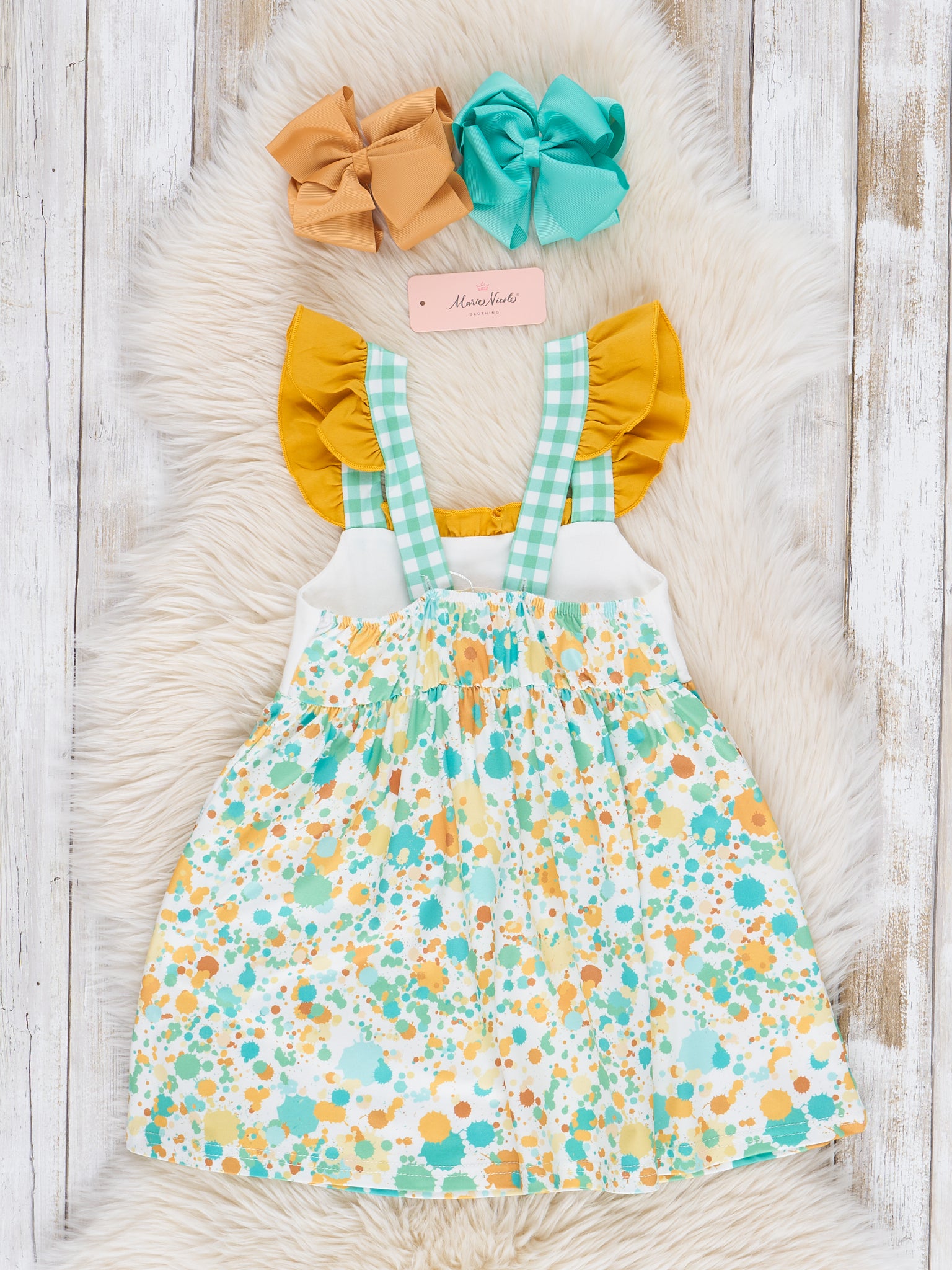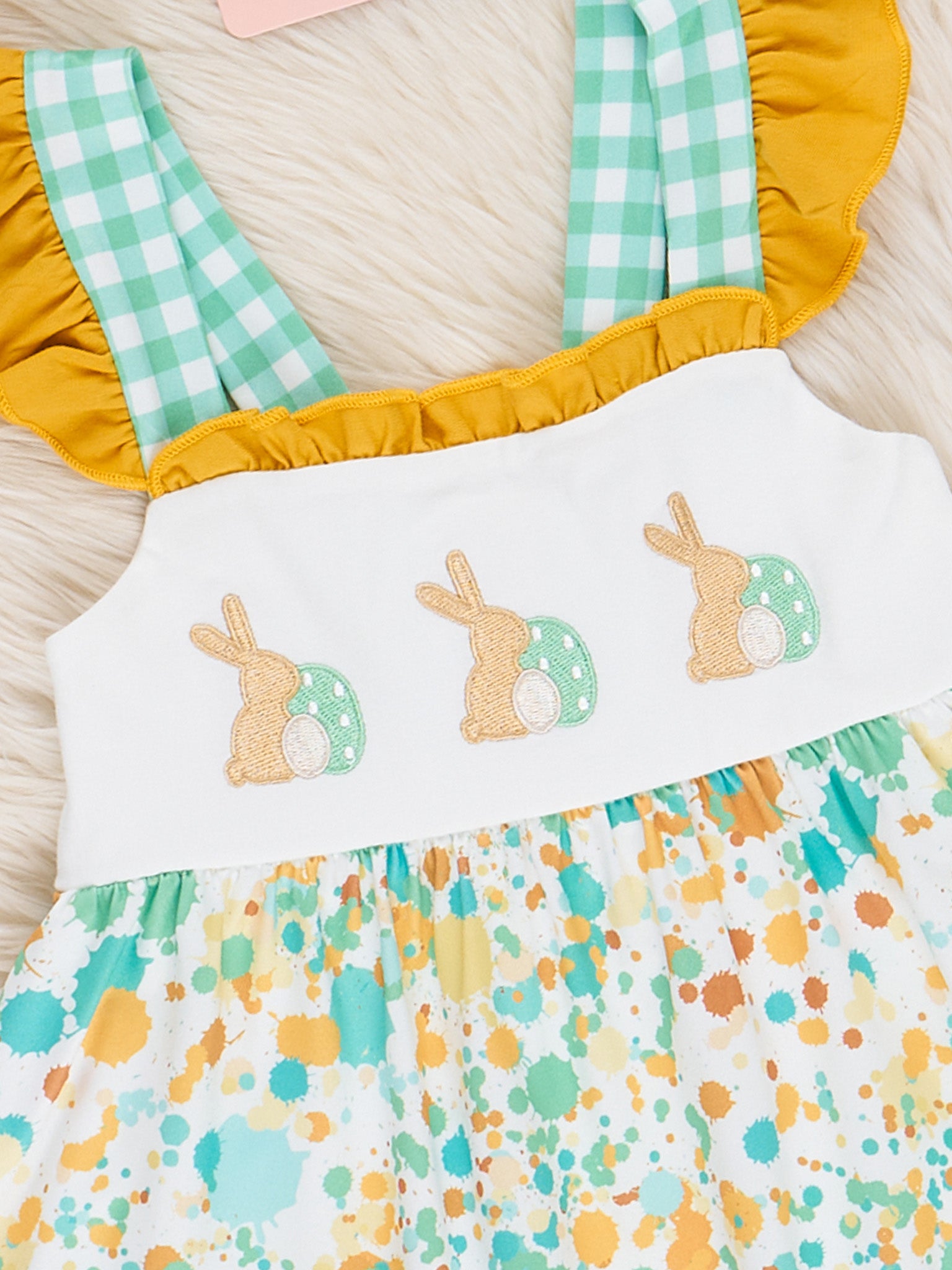 Dress your little in style with this Watercolor Bunny Embroidered Ruffle Dress from Marie Nicole Clothing! Perfect for Easter, this adorable dress features sweet embroidered bunnies with a fun splatter print. The adjustable ruffle straps add an extra touch of sweetness.