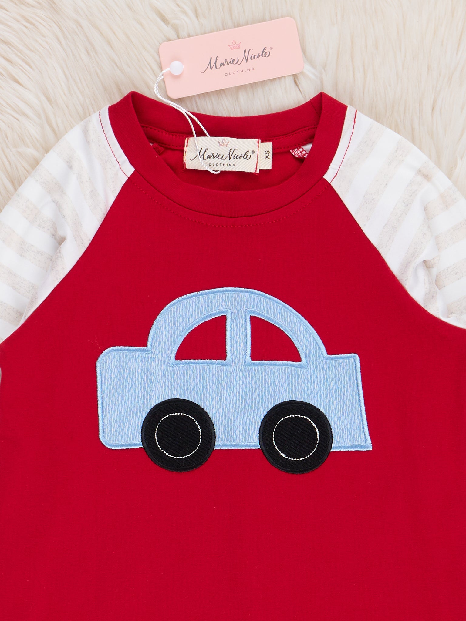 Feel the love with this playful Red Heart Car sibling set! Perfect for Valentine's Day, this boys shirt features a vibrant red bodice with an embroidered car and fun yellow striped sleeves. Make a statement and show some love with this stylish and unique top by Marie Nicole Clothing!
