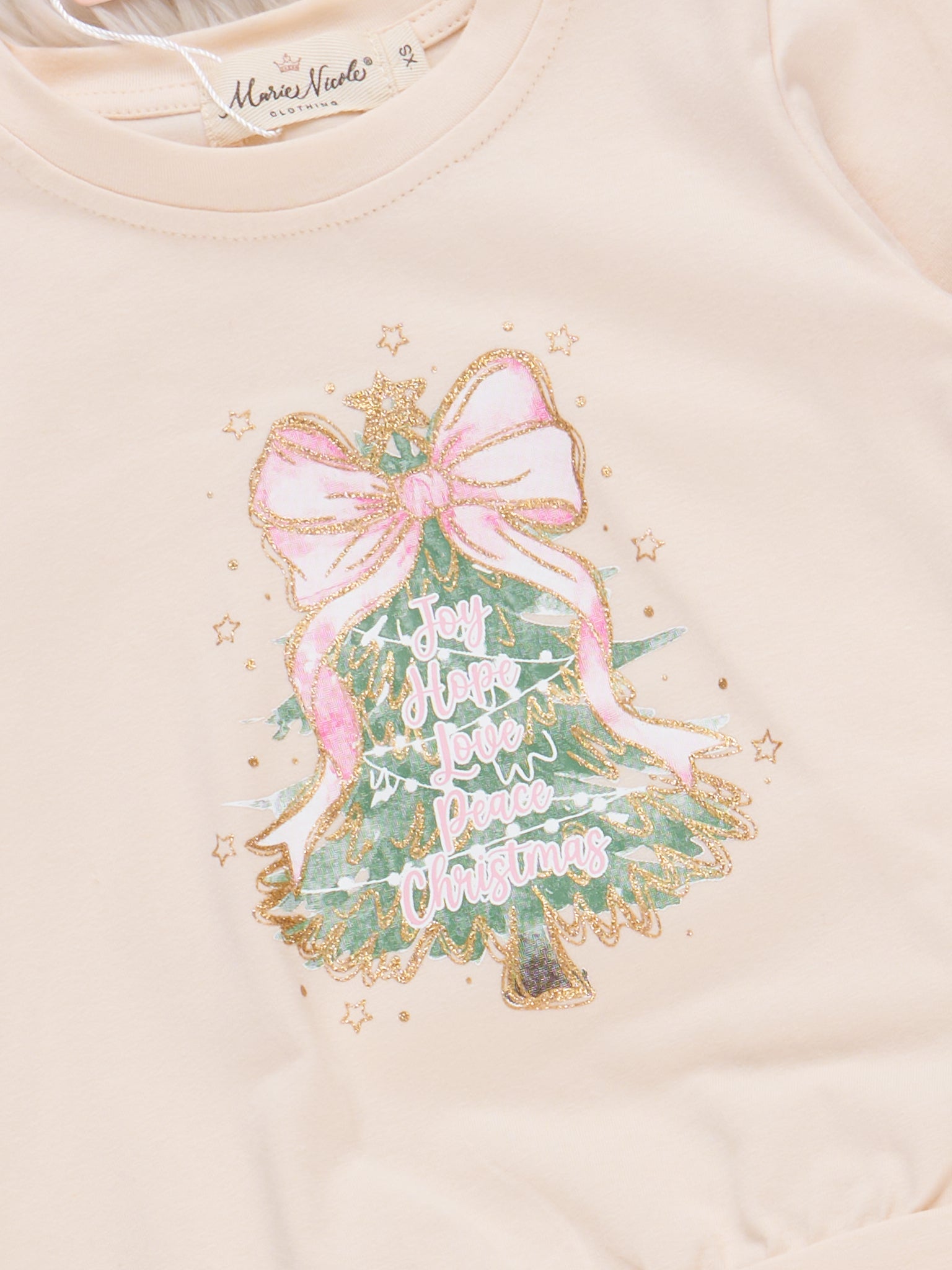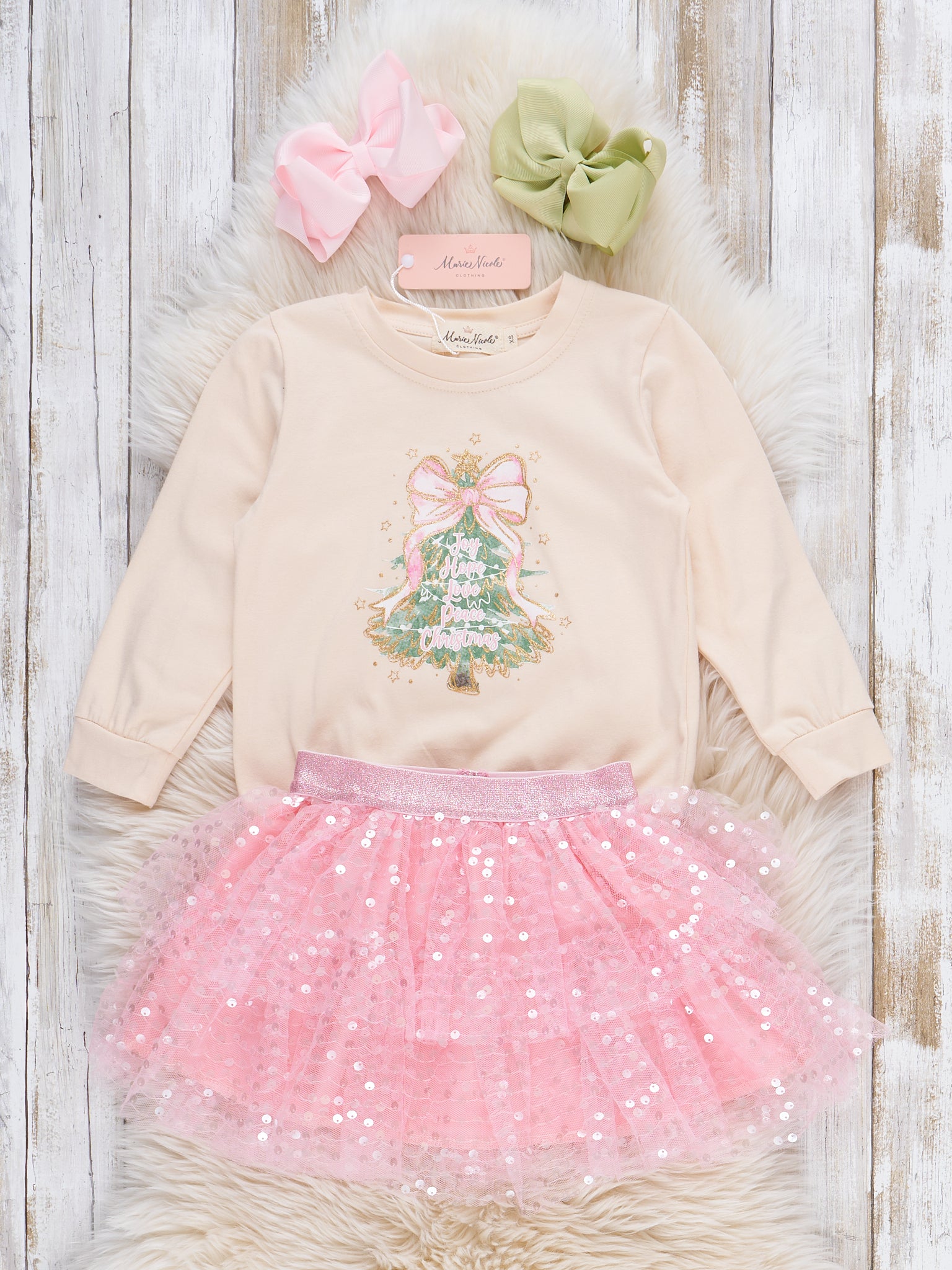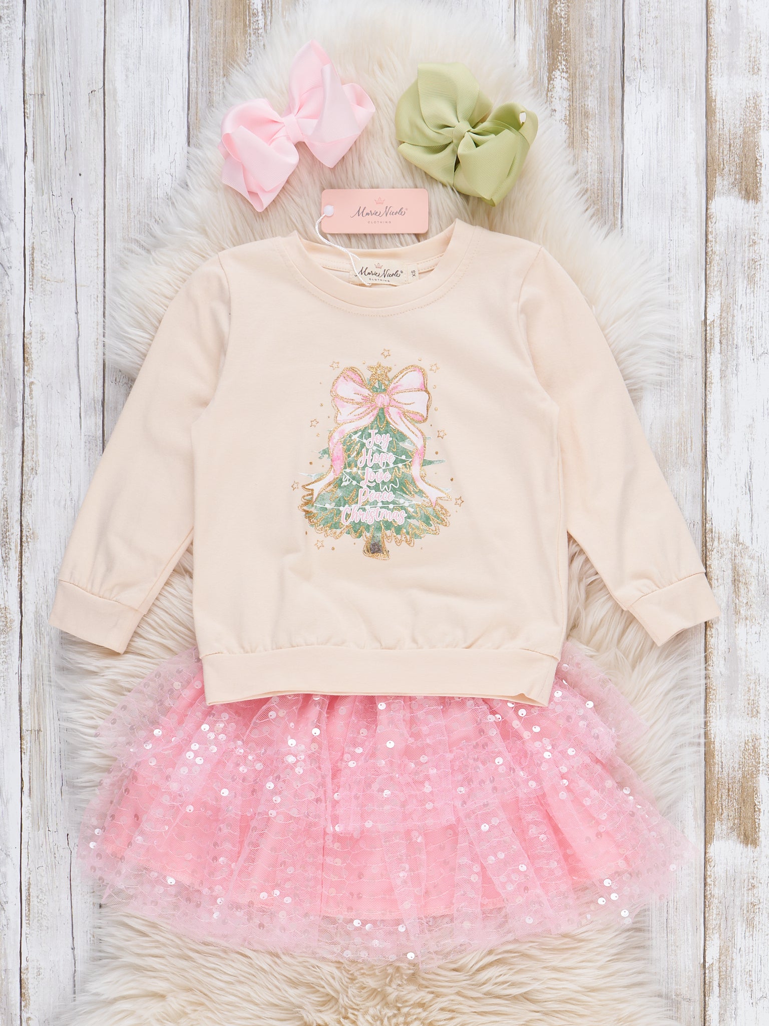 The Twinkle Tree & Glitz Skirt Outfit is a festive two-piece ensemble featuring a top with shimmering tree and a sparkling layered tulle skirt. Created by Marie Nicole Clothing, this outfit is perfect for adding holiday magic to parties, family celebrations, or special photos, blending comfort with a touch of seasonal glamour.